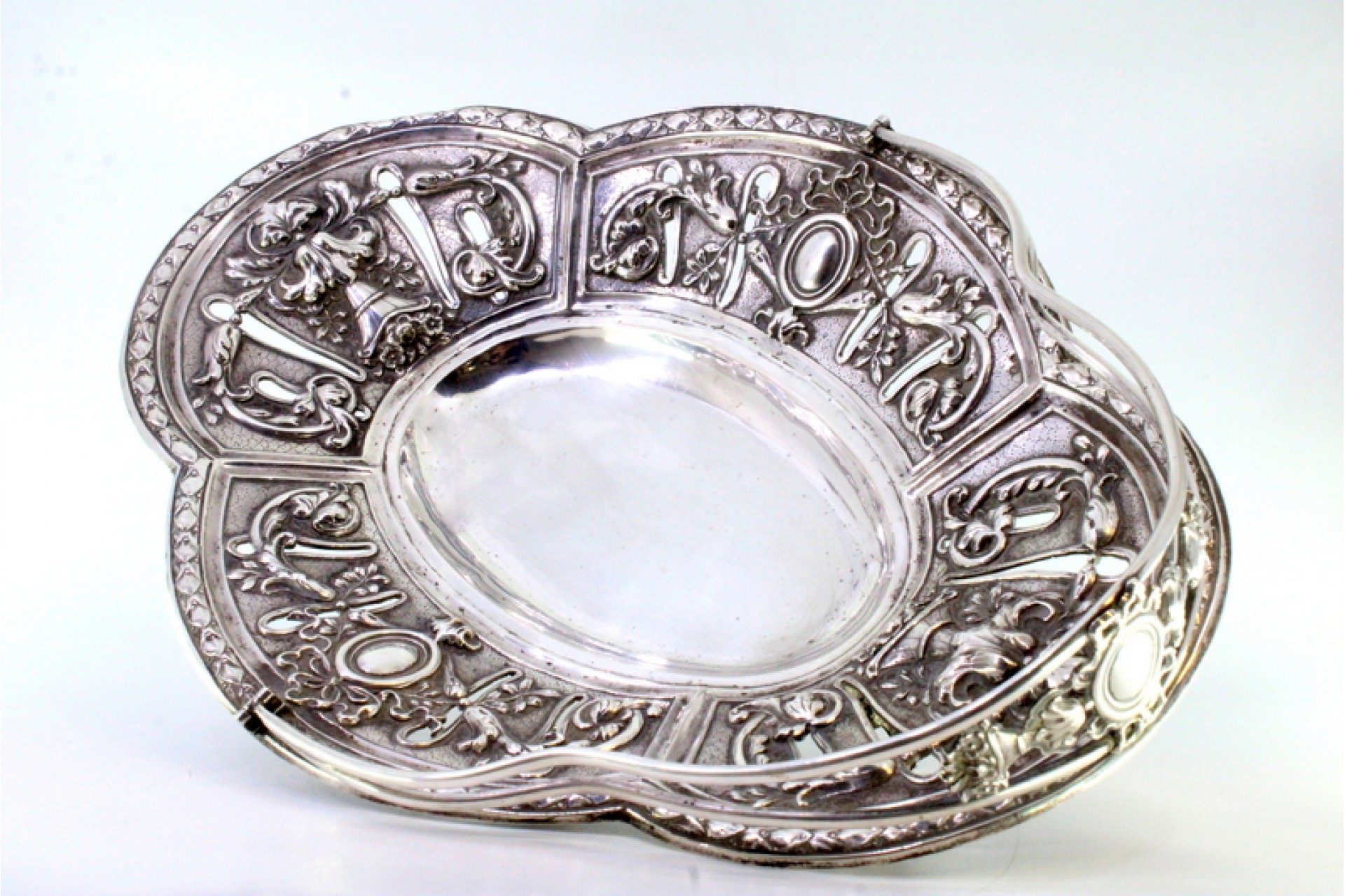 • Descrição: Fruteira em prata recortada com asa articulada e frisos envolventes, assente em quatro pés vazados.