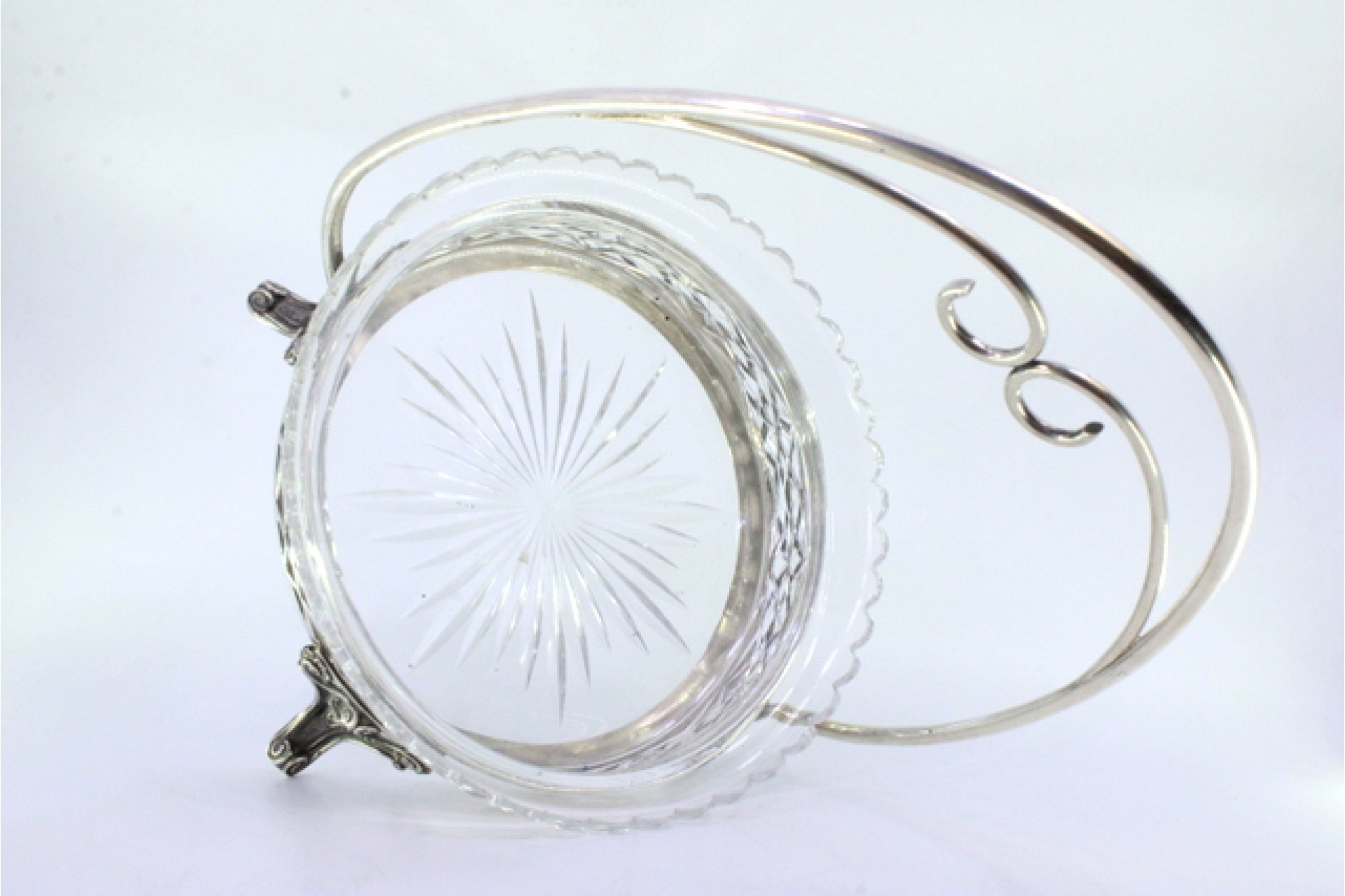 • Descrição: Fruteira em vidro lapidado com estrutura em prata com gradinha e assente em quatro pés relevados.
