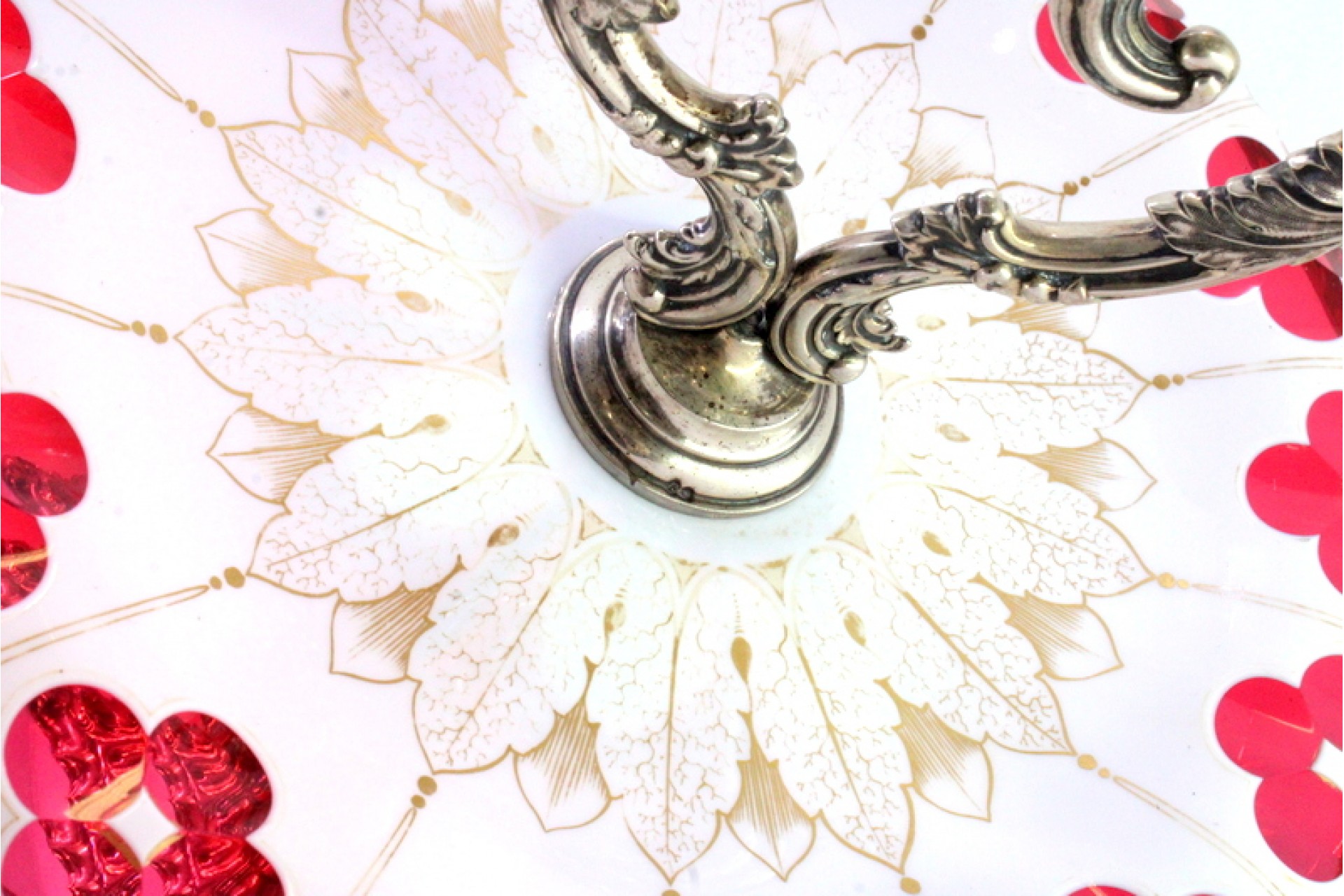 • Descrição: Fruteira centro de mesa com estrutura em prata relevada com enchimento e vidro lapidado em tons bordeaux com motivos florais definidos no centro.