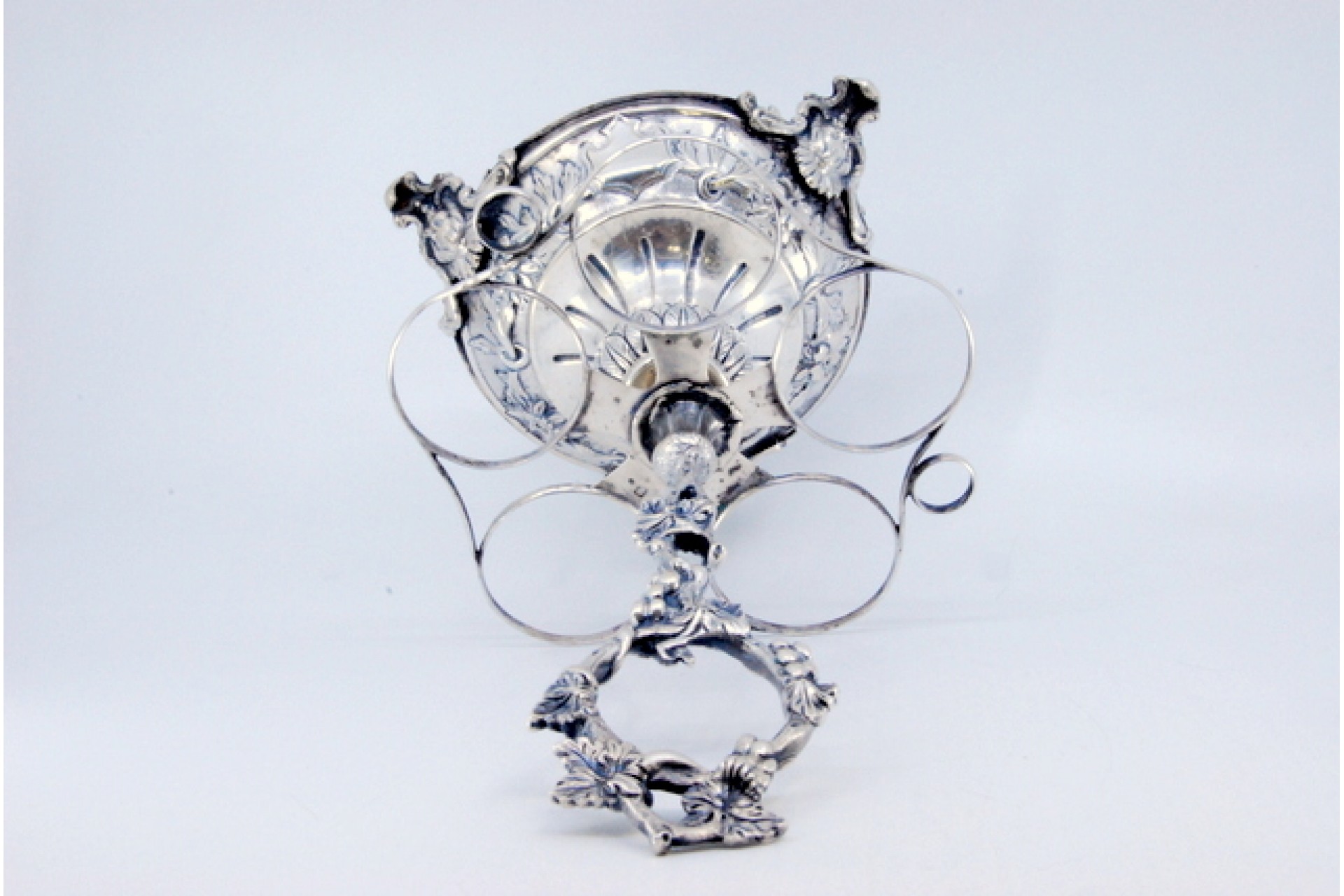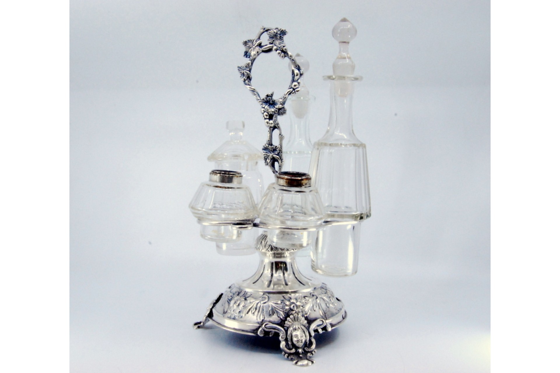 Licoreiro em prata com motivos florais, três pés com mascarões, depósitos para sal, pimenta e mostarda.