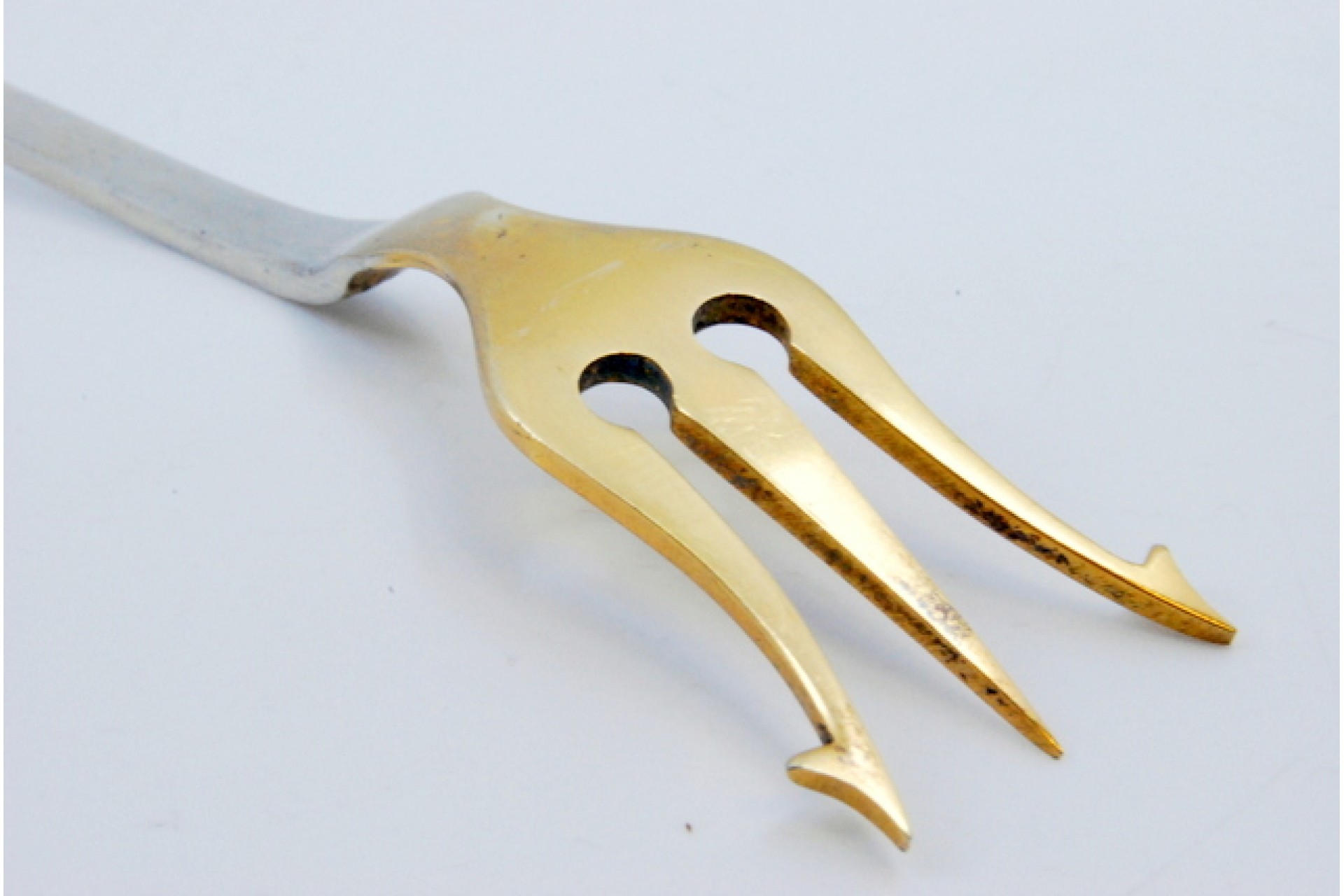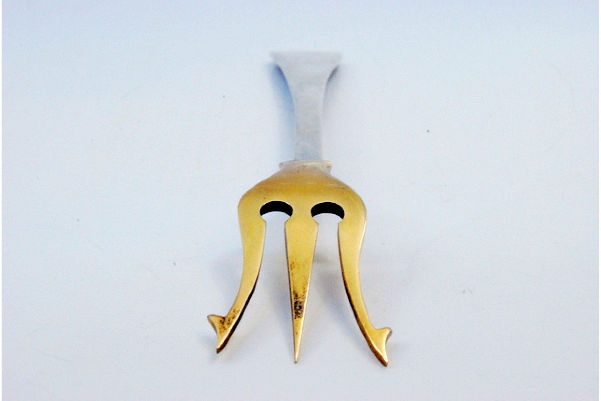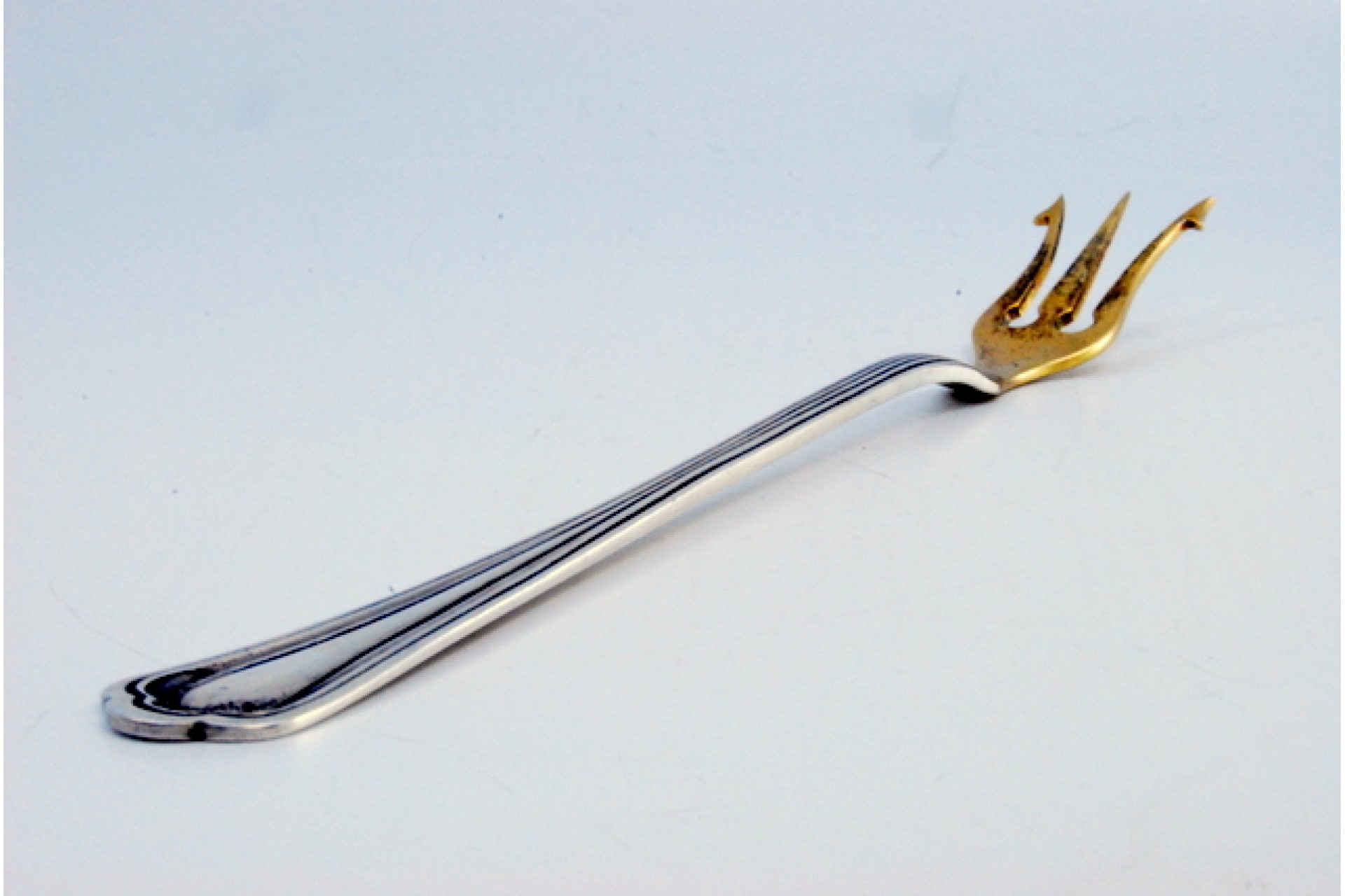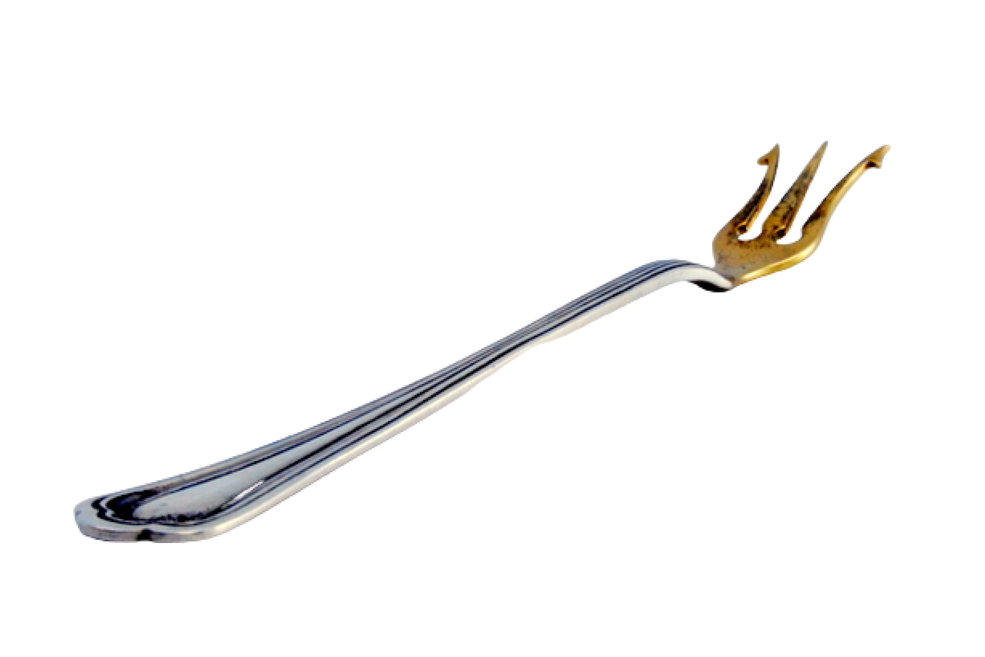 • Descrição: Garfo de servir acepipes em prata com três dentes dourados e frisos ao longo do cabo.