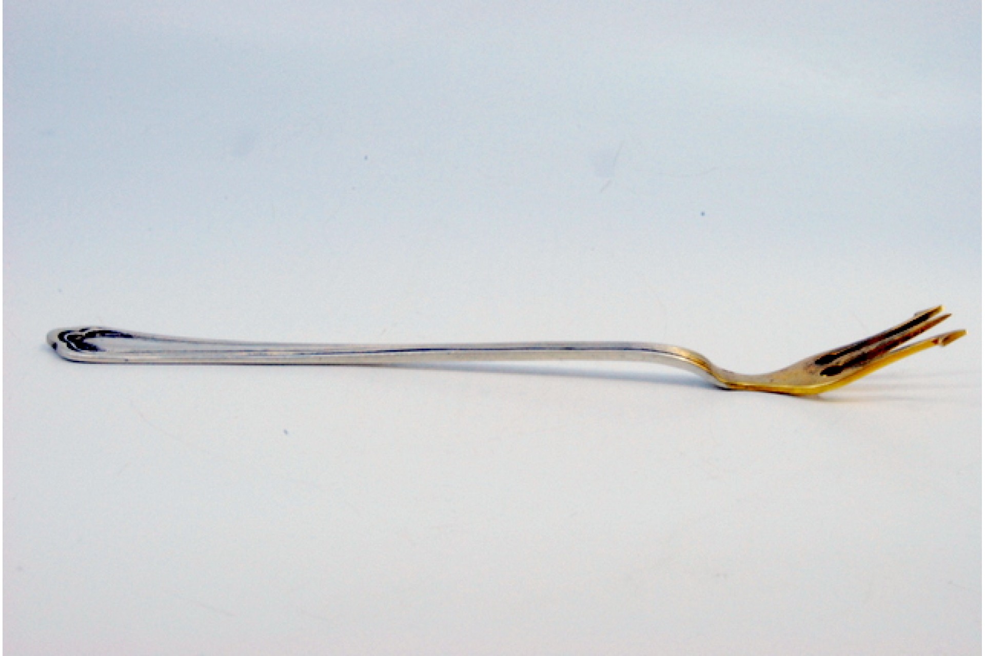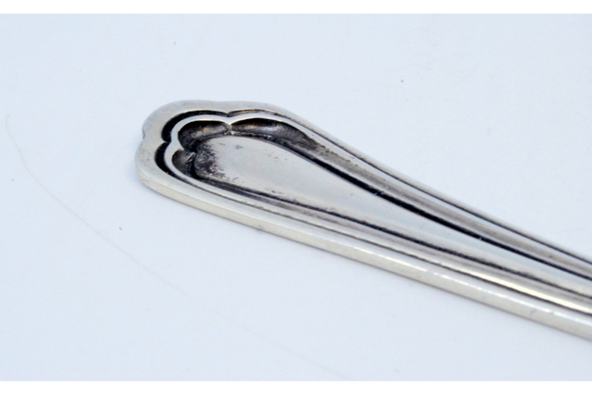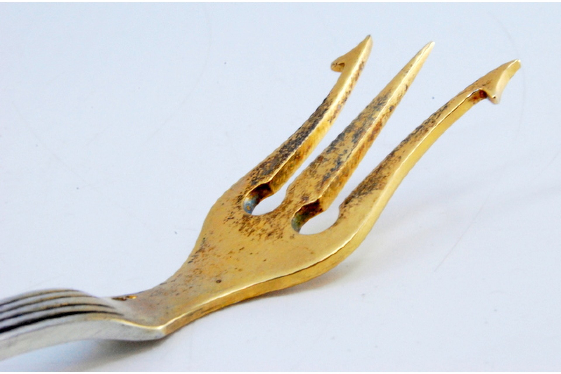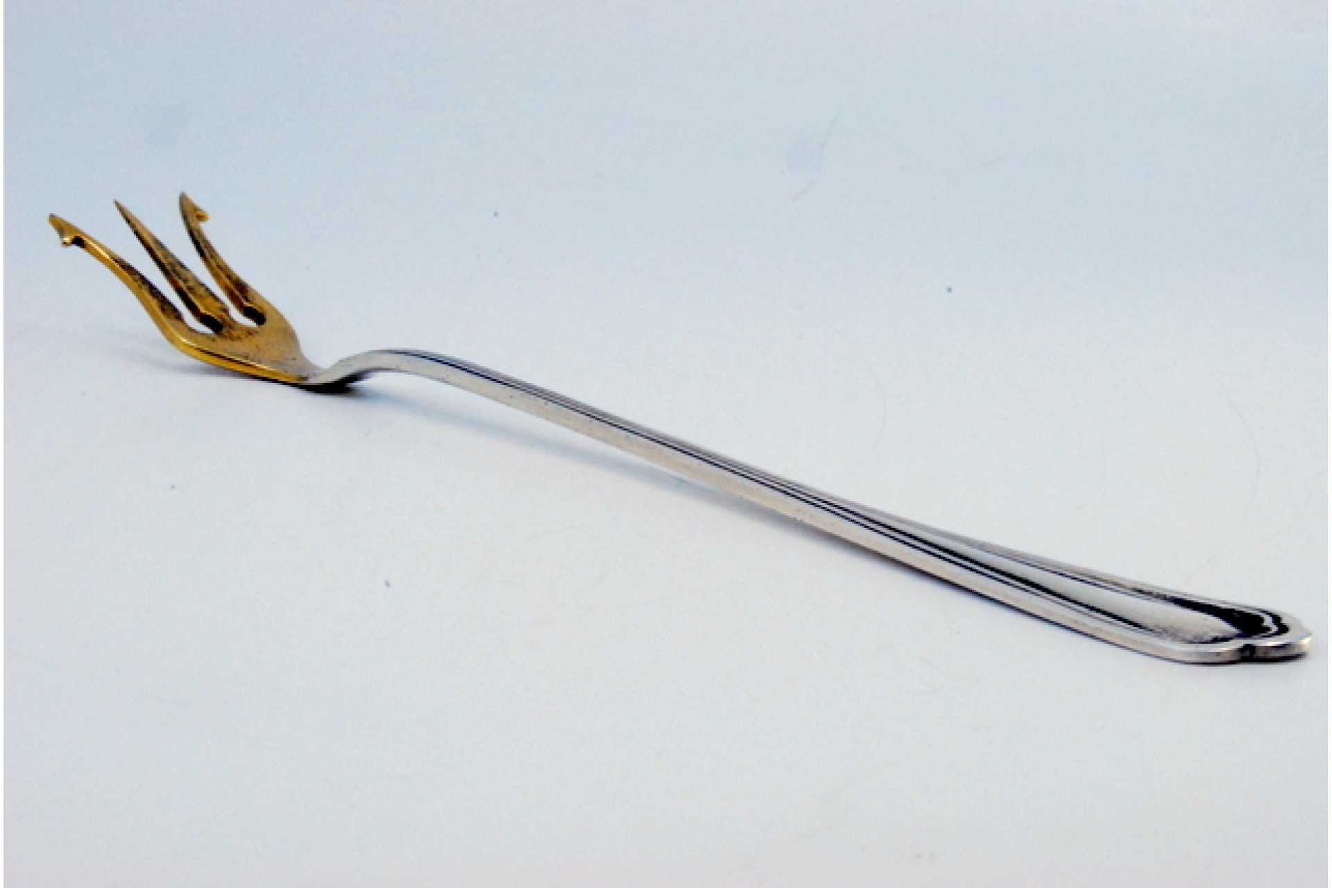 • Descrição: Garfo de servir acepipes em prata com três dentes dourados e frisos ao longo do cabo.