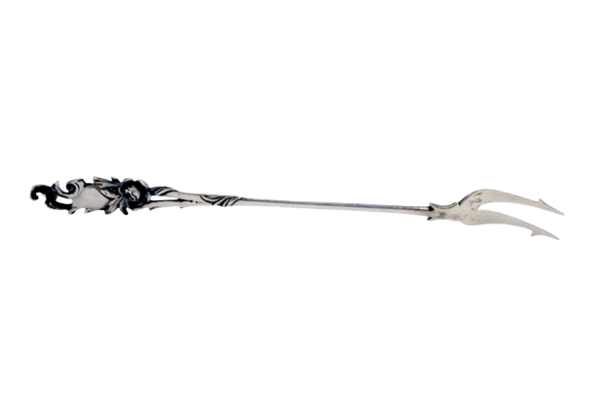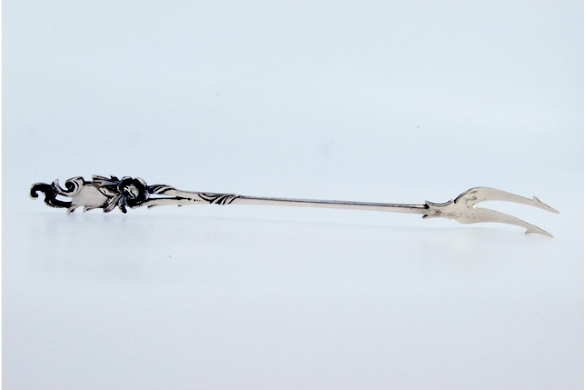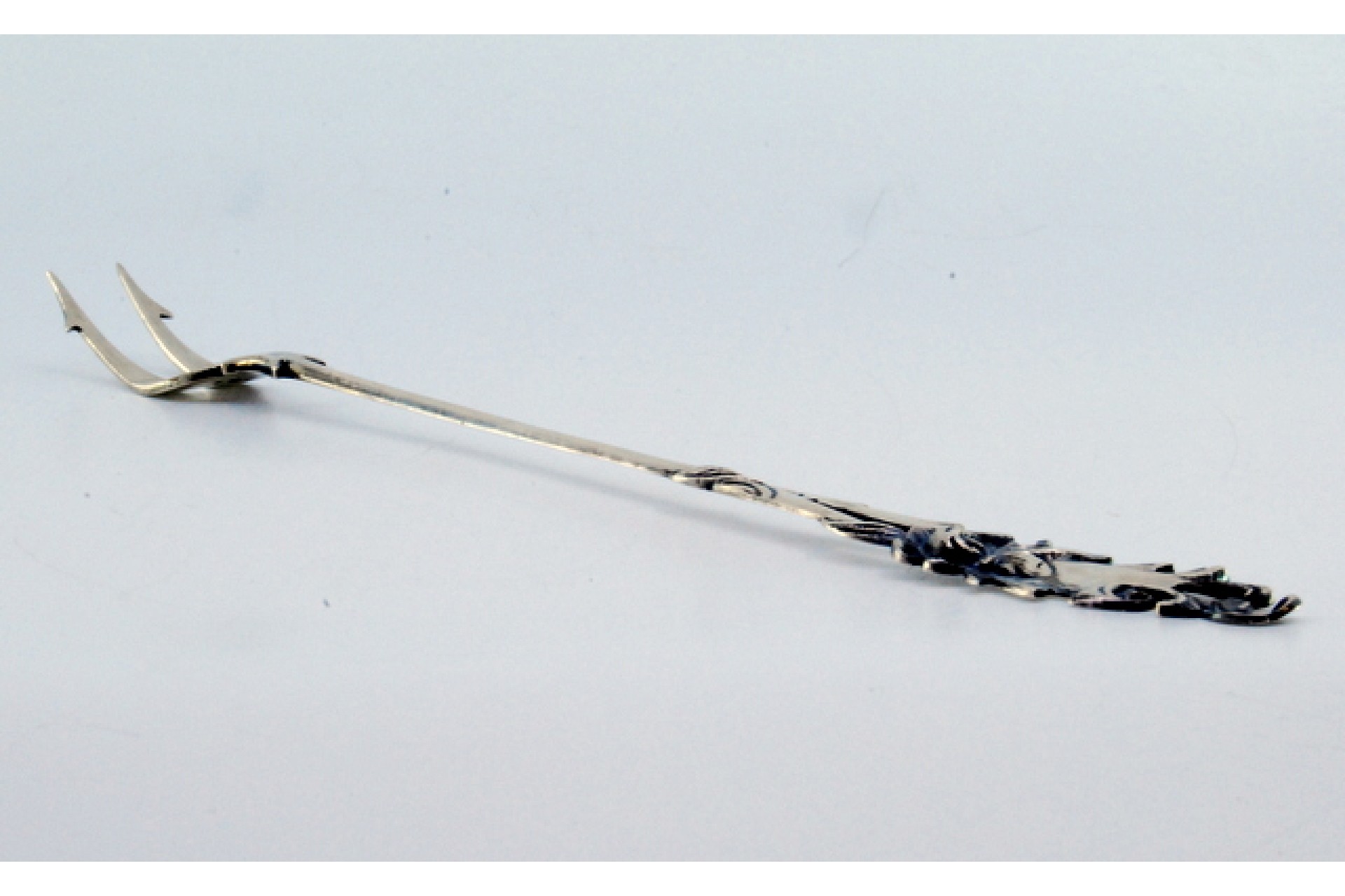 • Descrição: Garfo de servir acepipes em prata recortada e relevada com motivos florais no cabo.