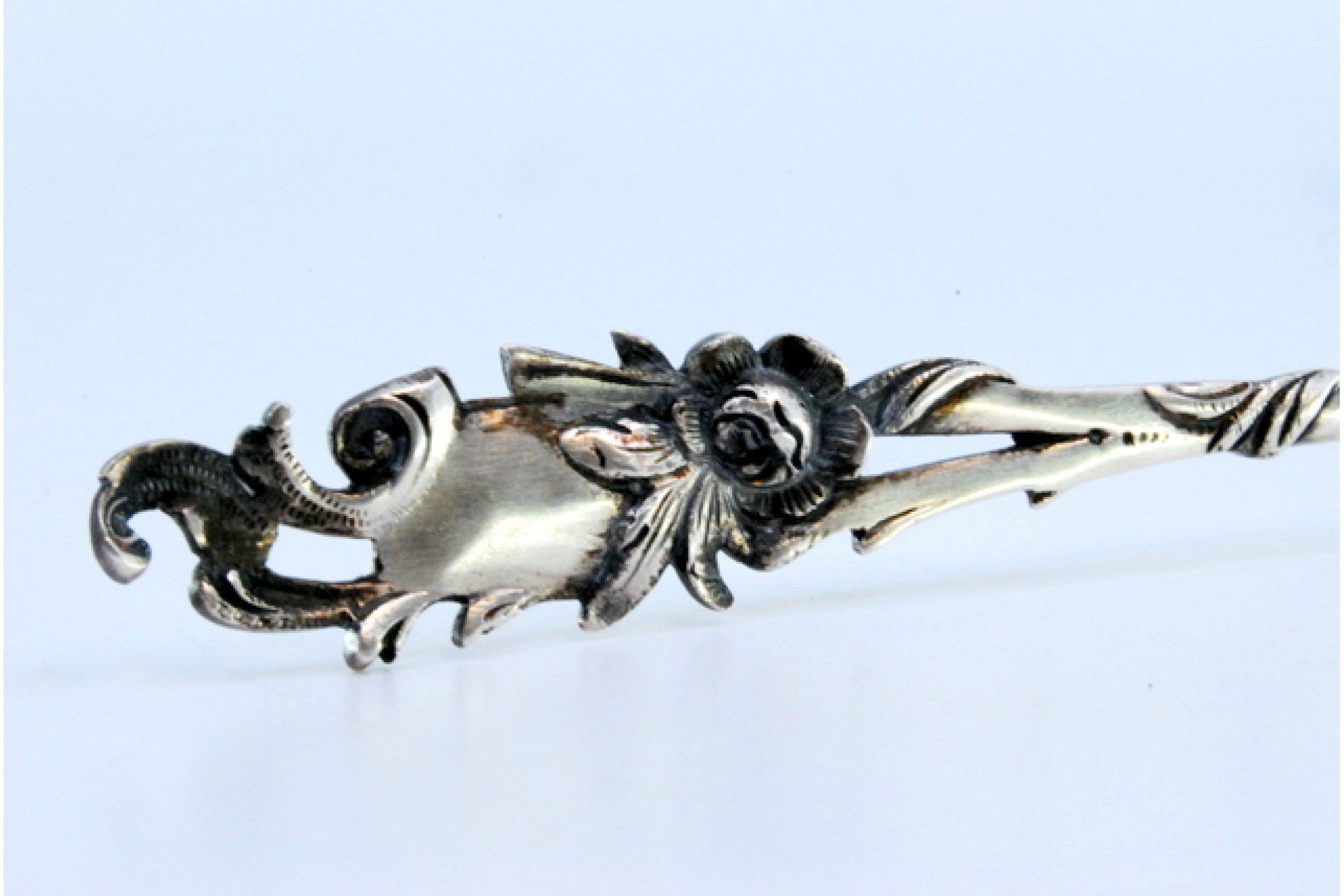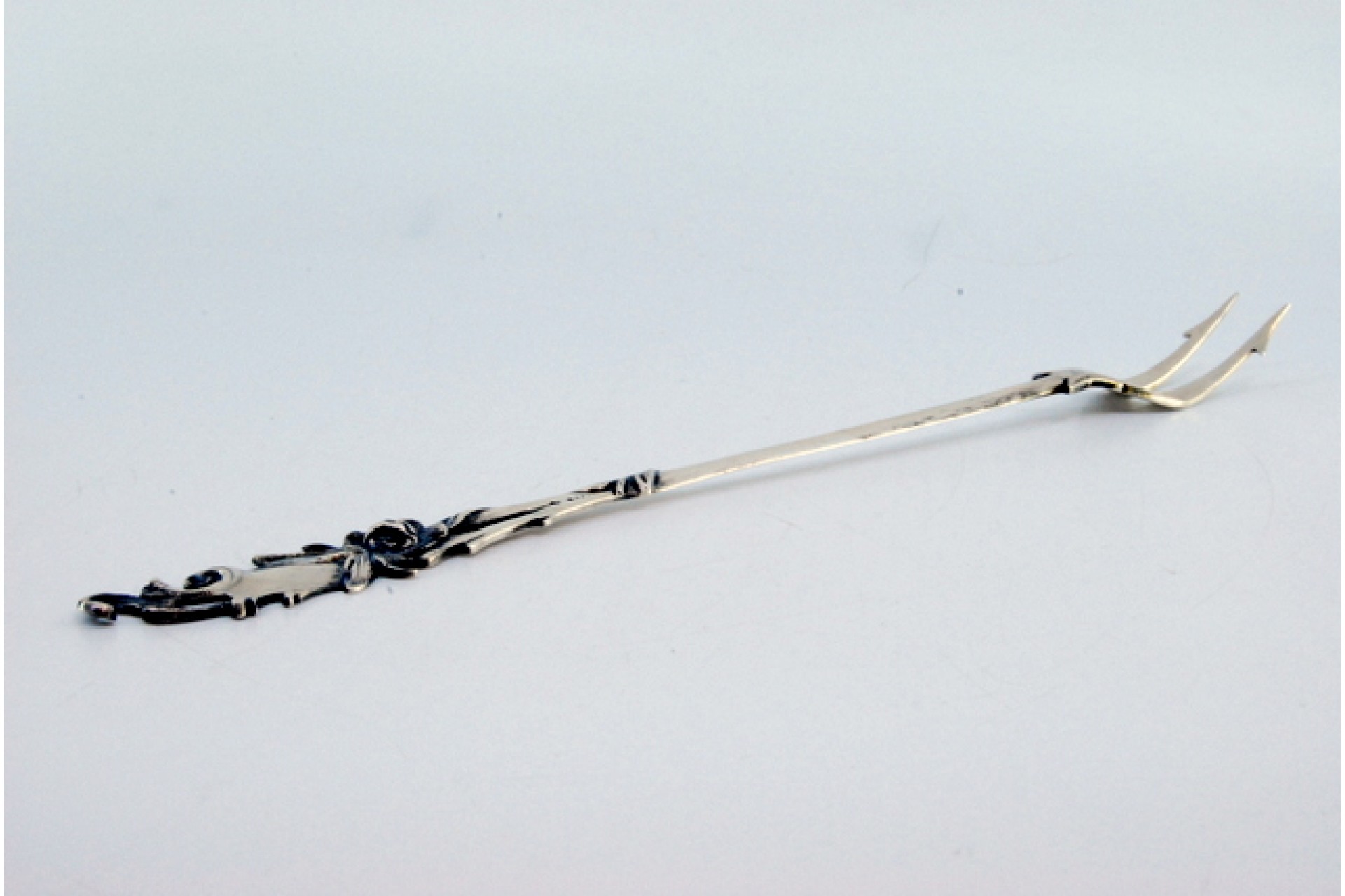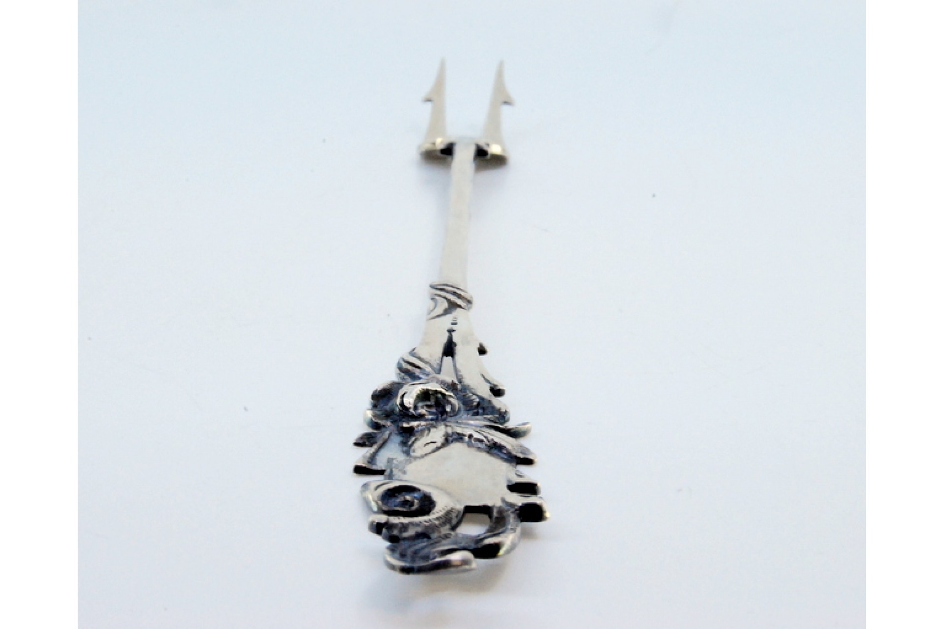 • Descrição: Garfo de servir acepipes em prata recortada e relevada com motivos florais no cabo.