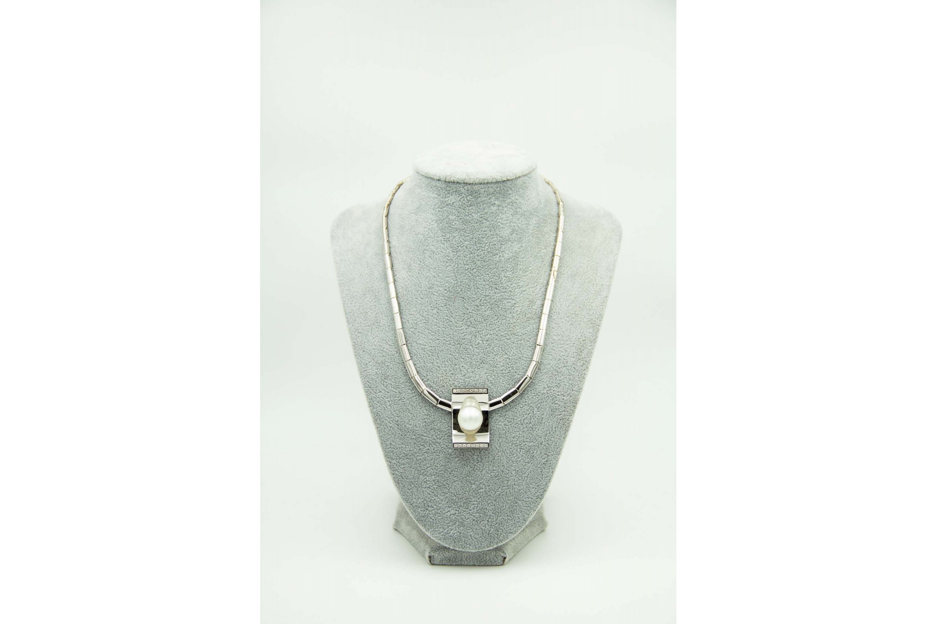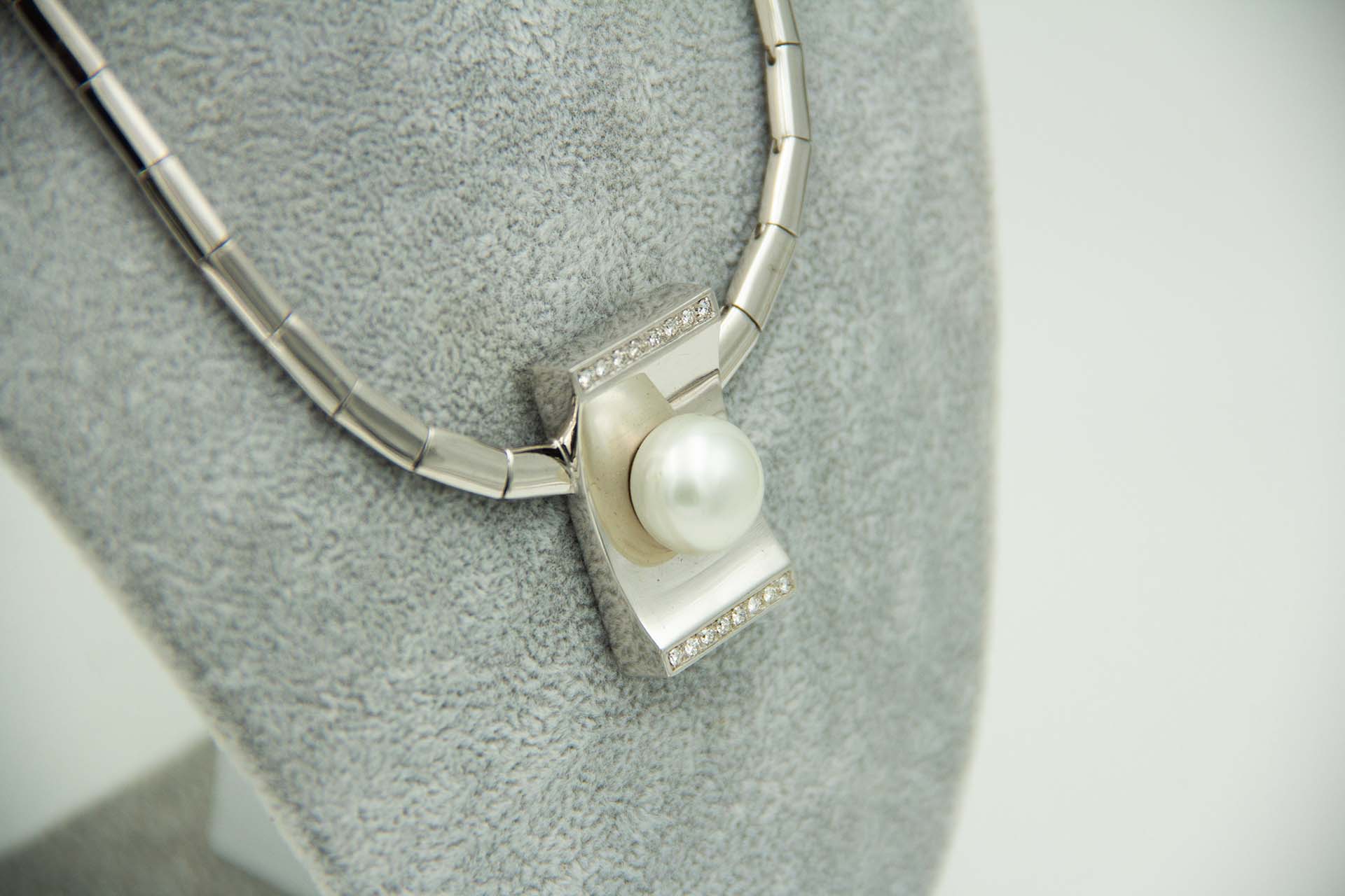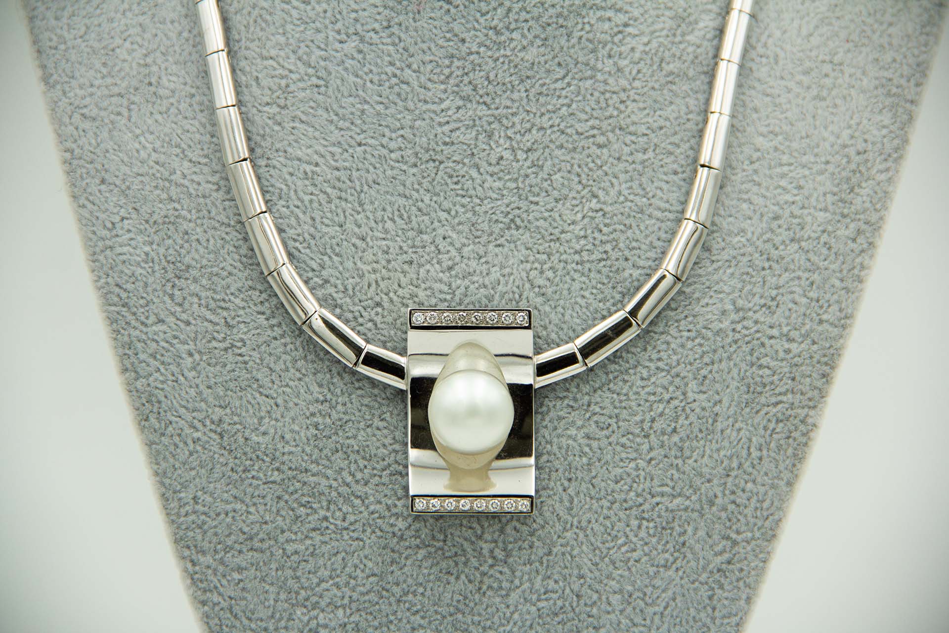 • Descrição: Gargantilha de ouro branco com elos articulados, diamantes(16) em talhe brilhante e pérola aplicada no centro.