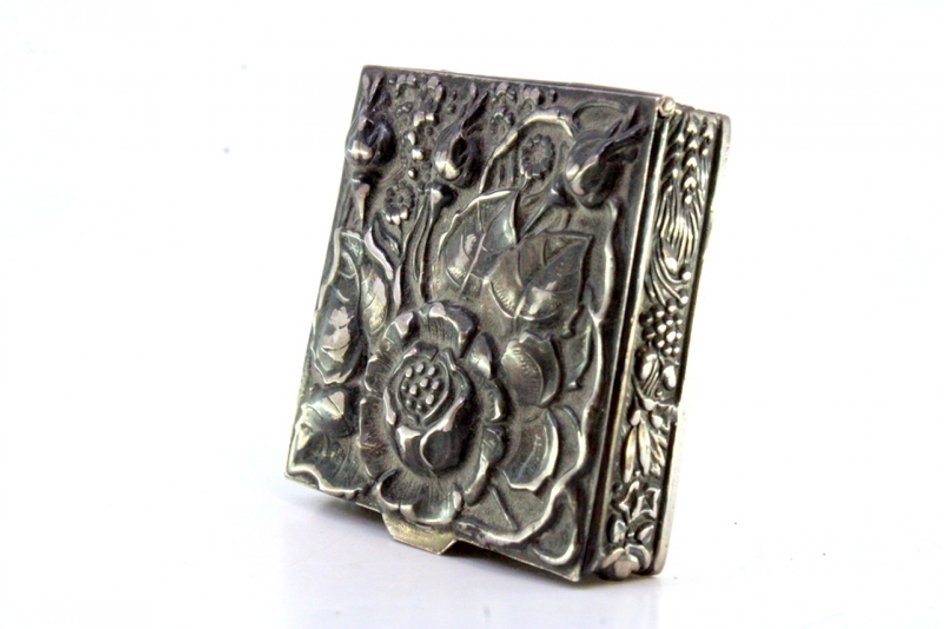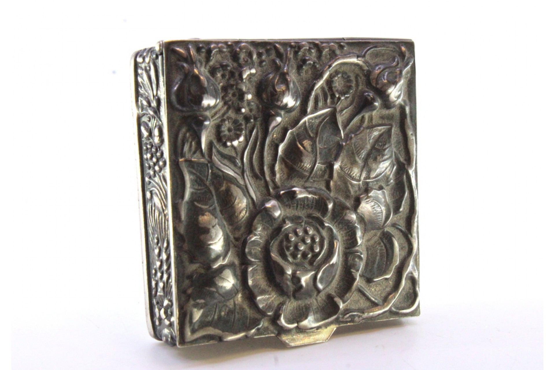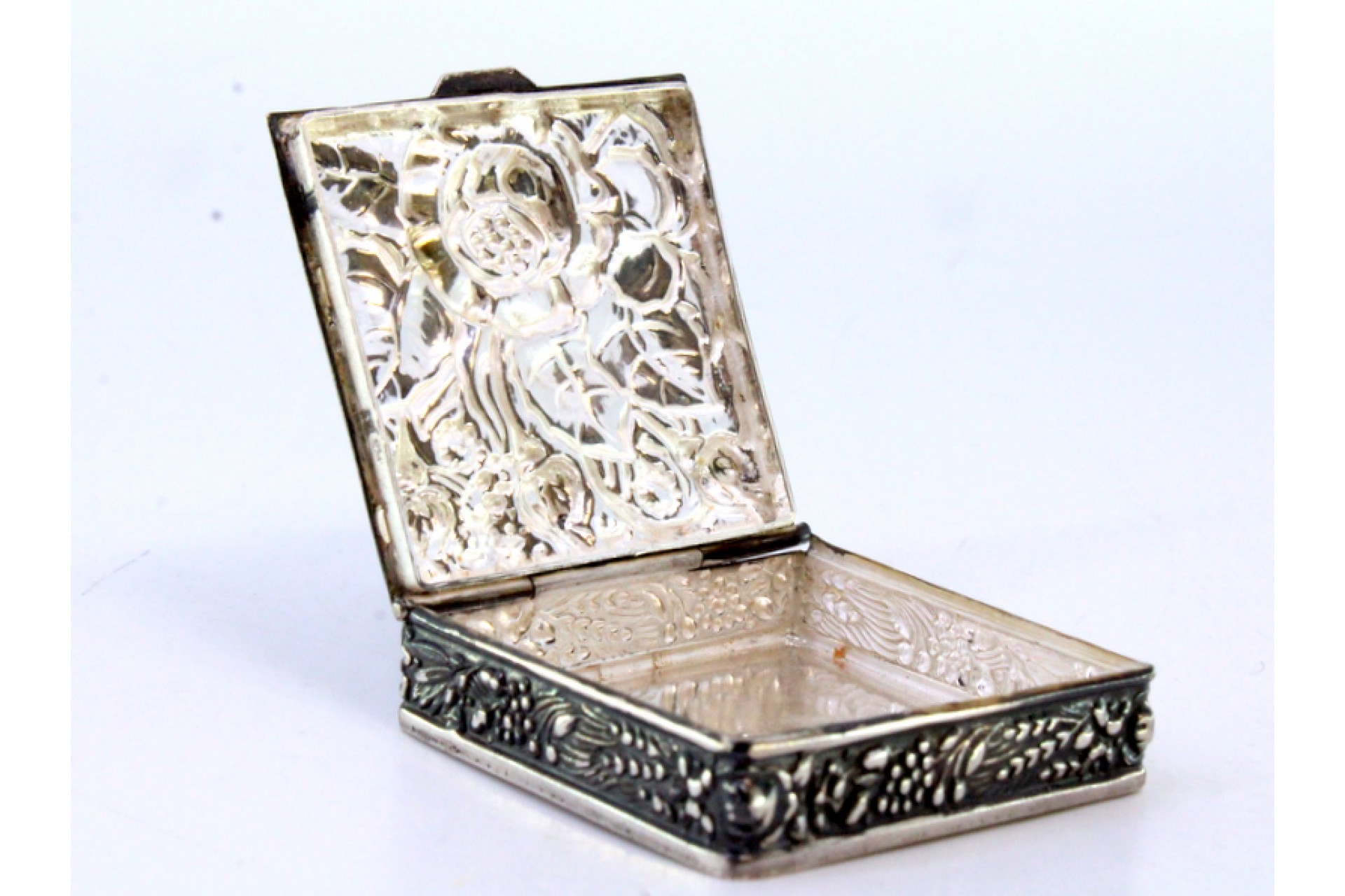 • Descrição: Caixa de comprimidos em prata com flores reveladas na tampa ao estilo Arte Nova e aplicação para abrir.