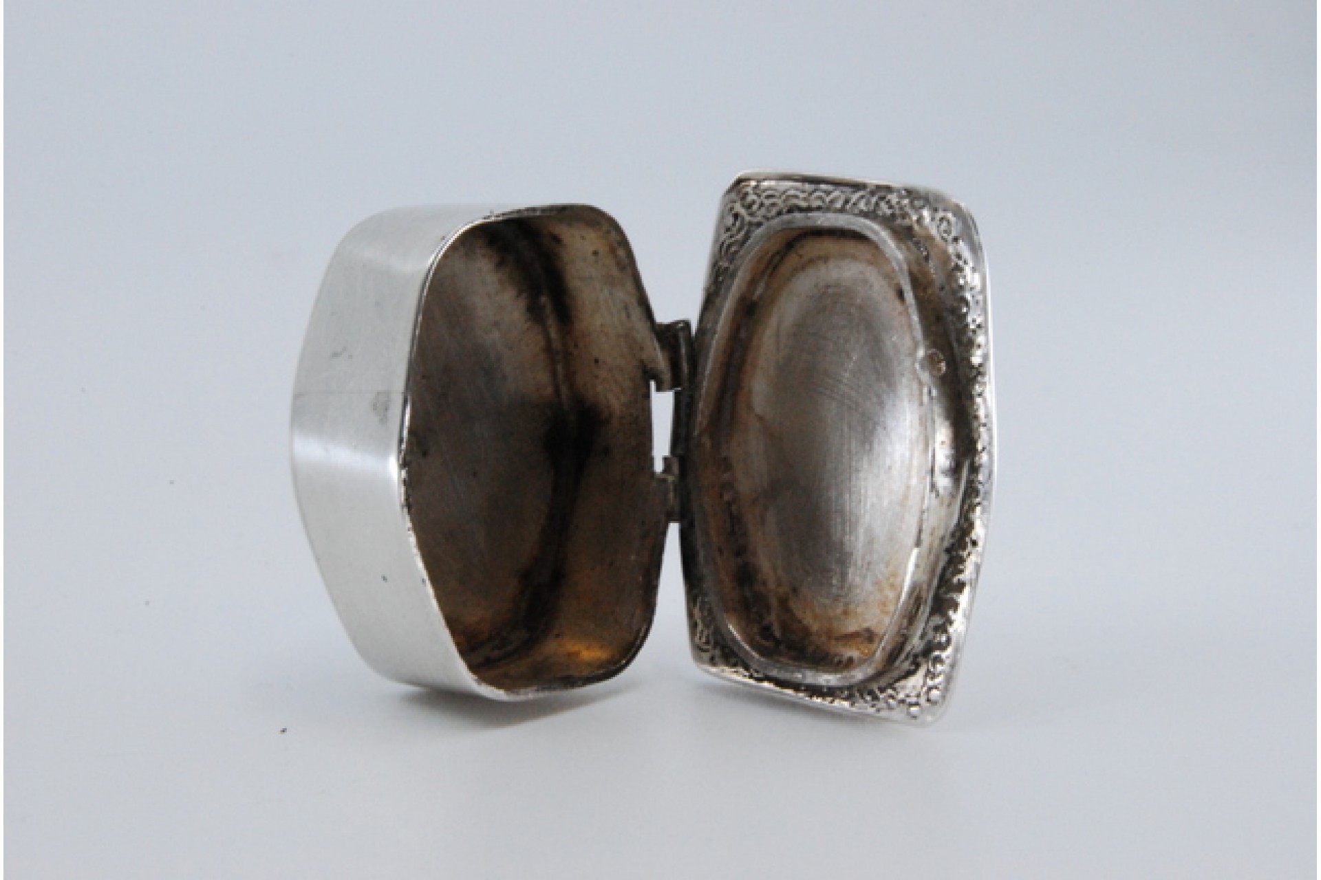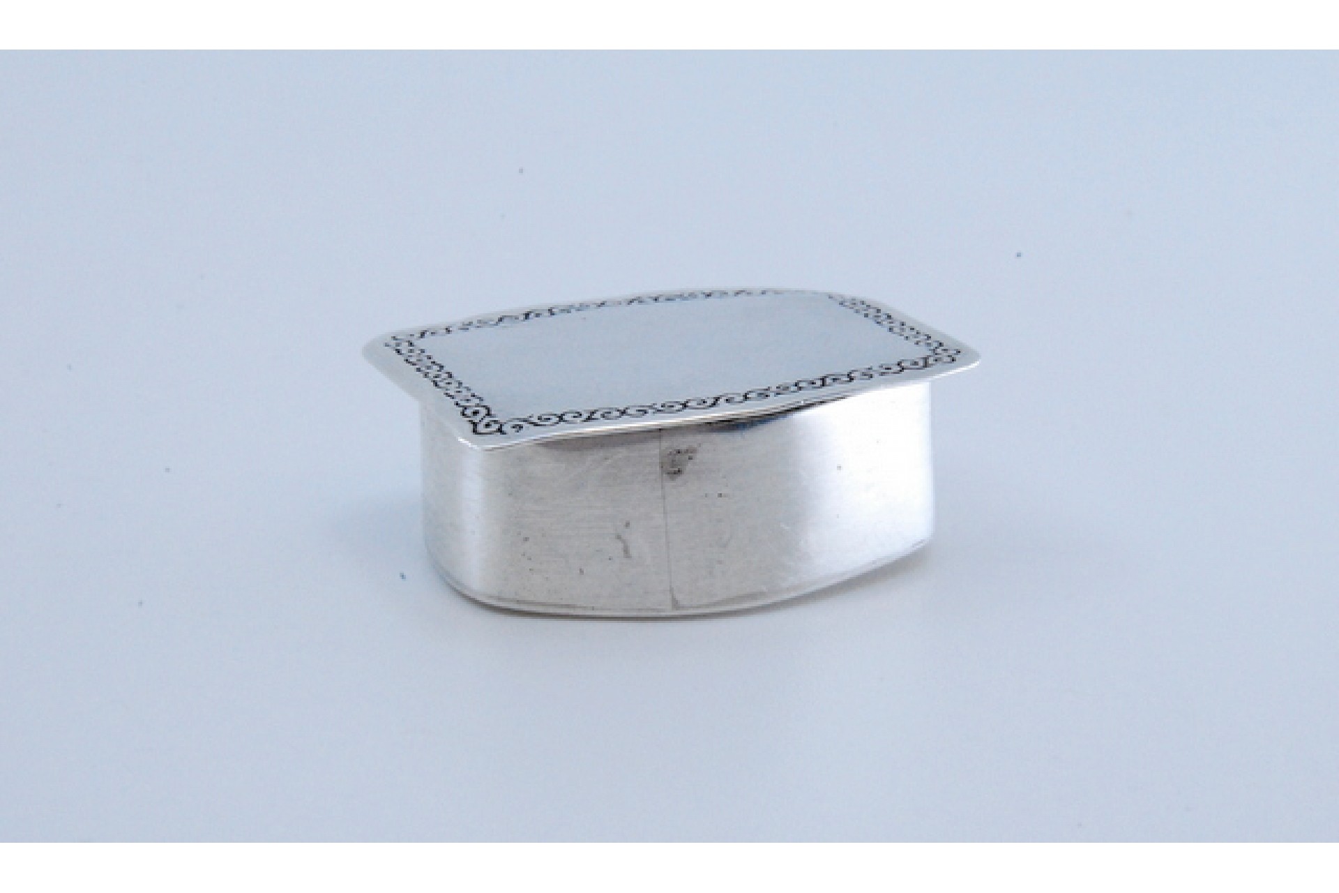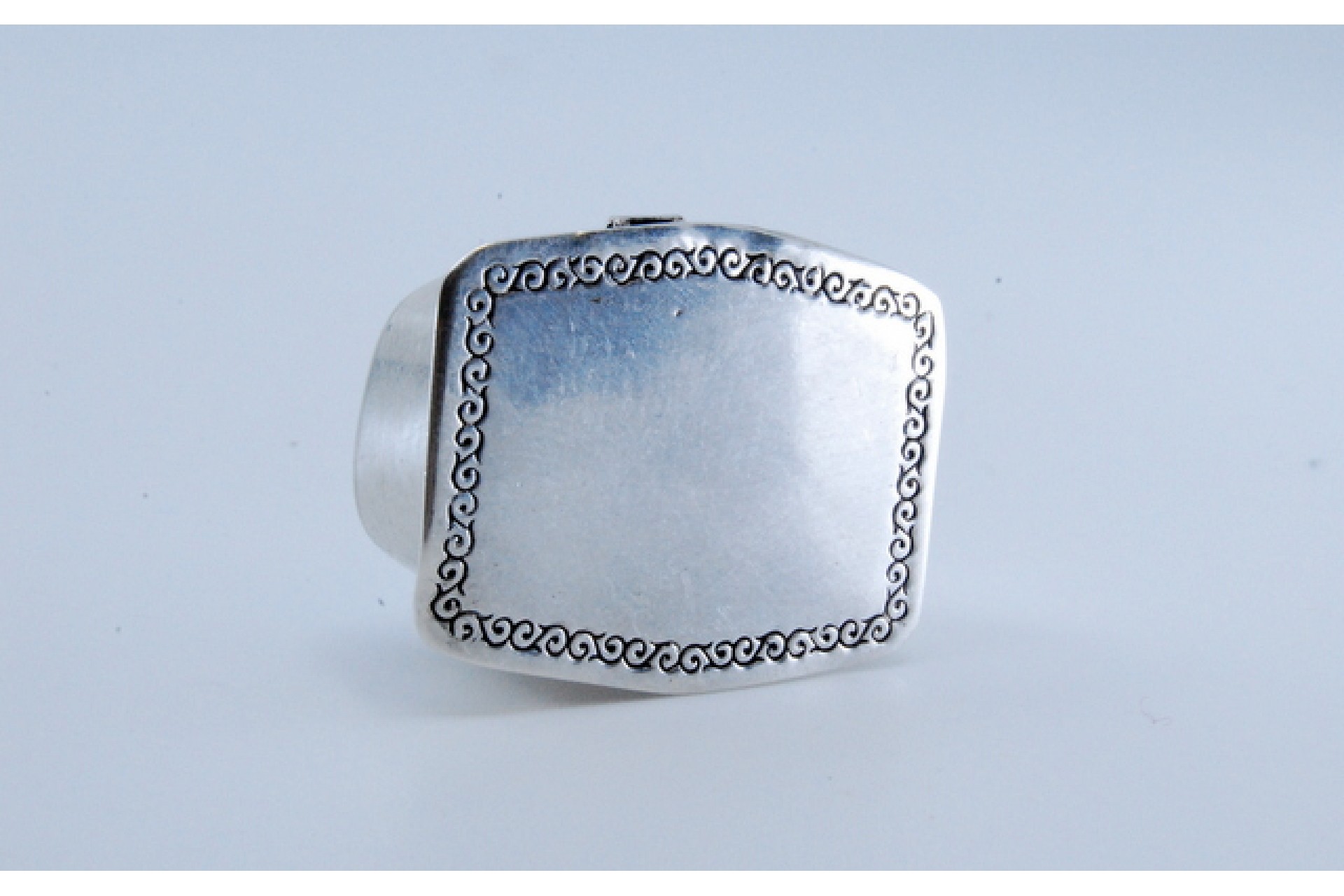 Caixa de comprimidos em prata com friso na envolvência na tampa basculante.