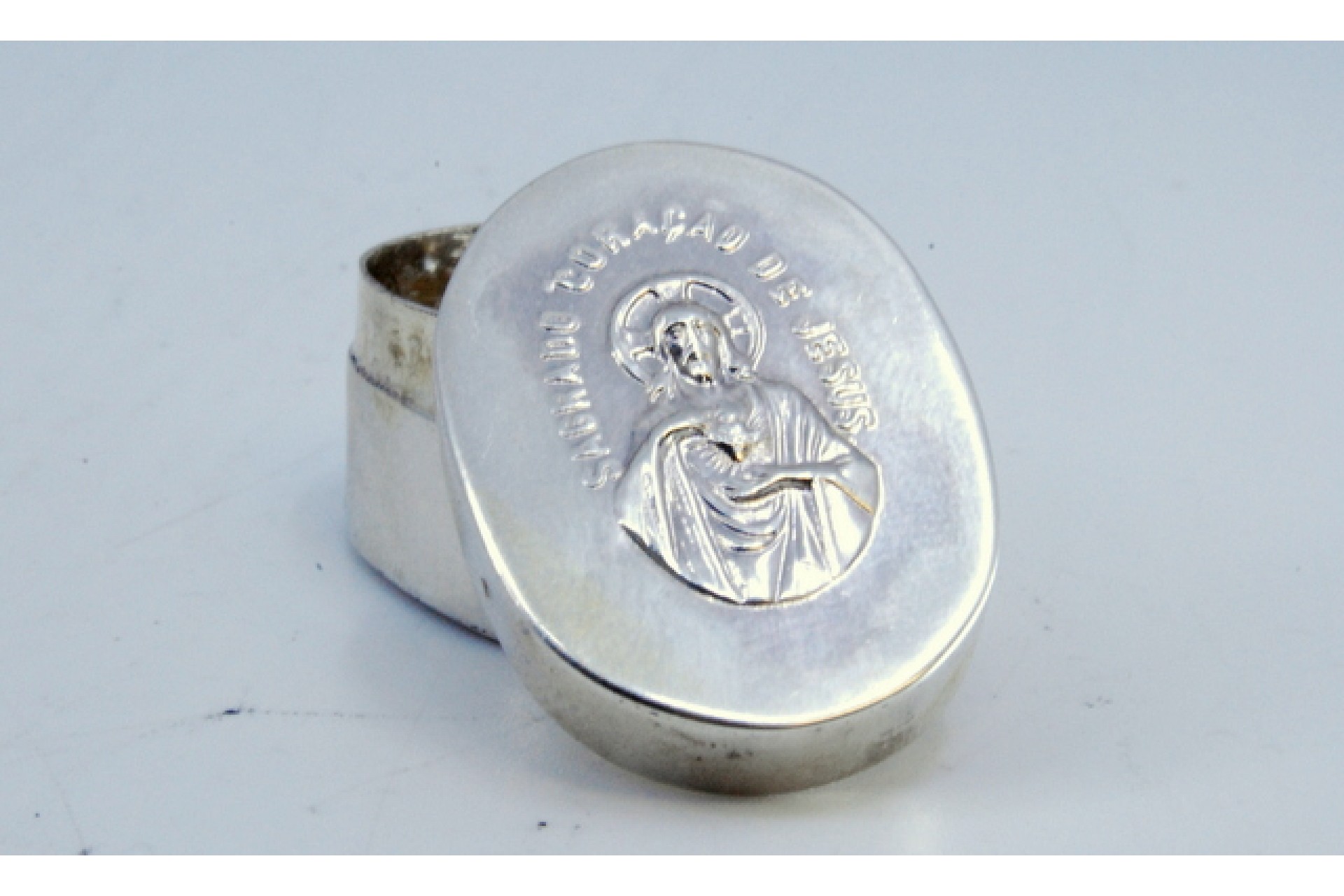 Caixa de comprimidos em prata com o Sagrado Coração de Jesus relevado na tampa amovível.
