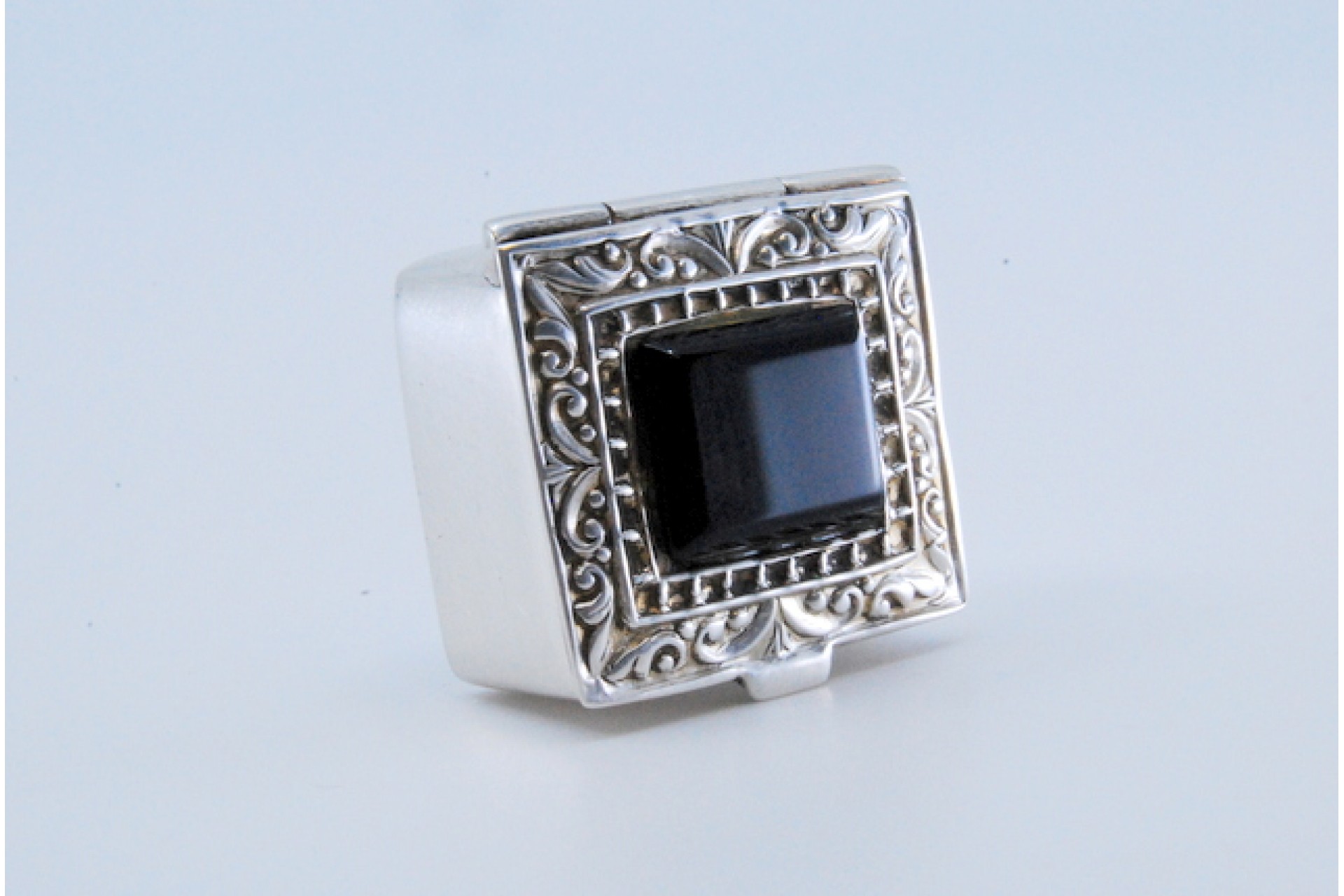 Caixa de comprimidos em prata de forma quadrada com relevos envolvendo ónix na tampa basculante.