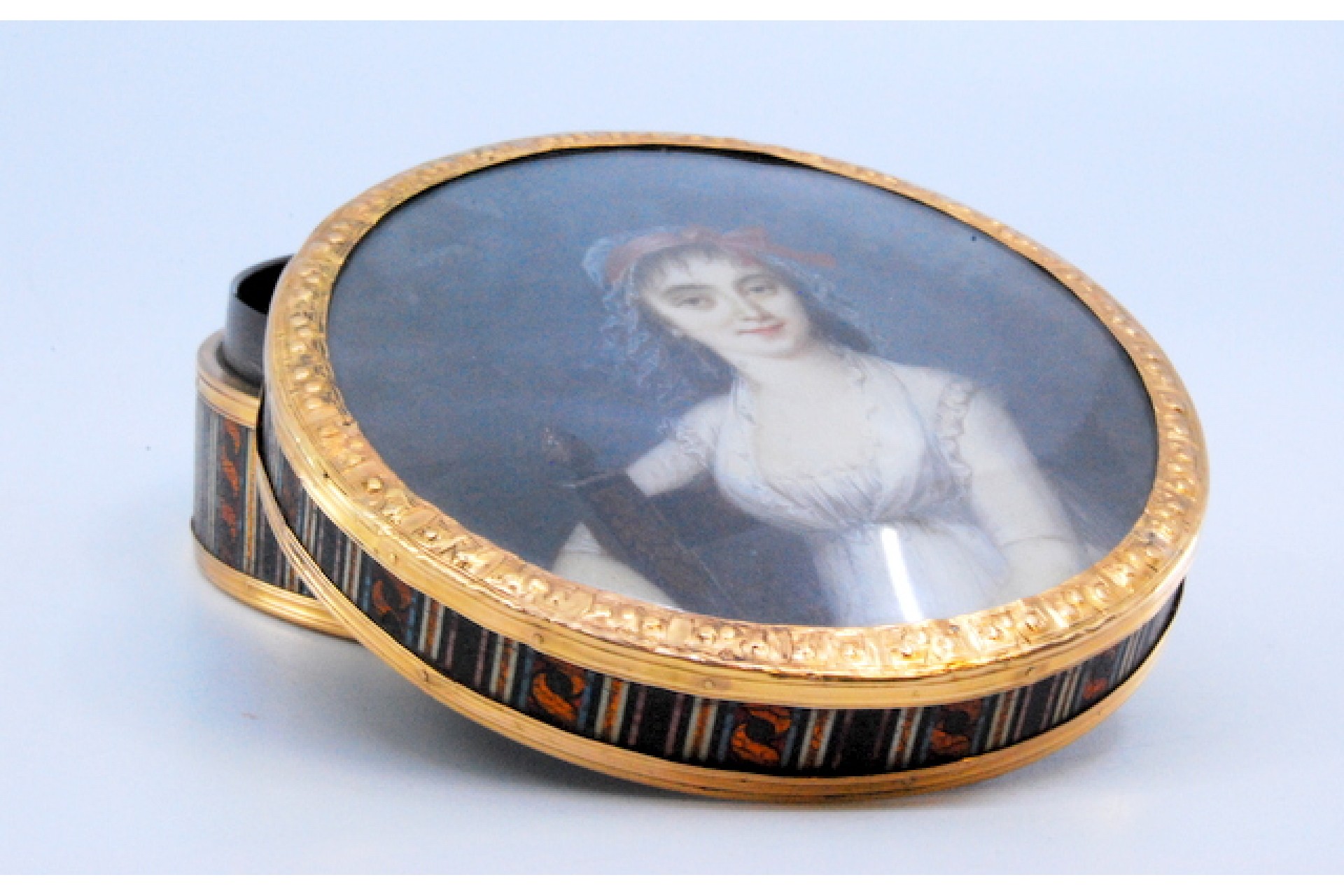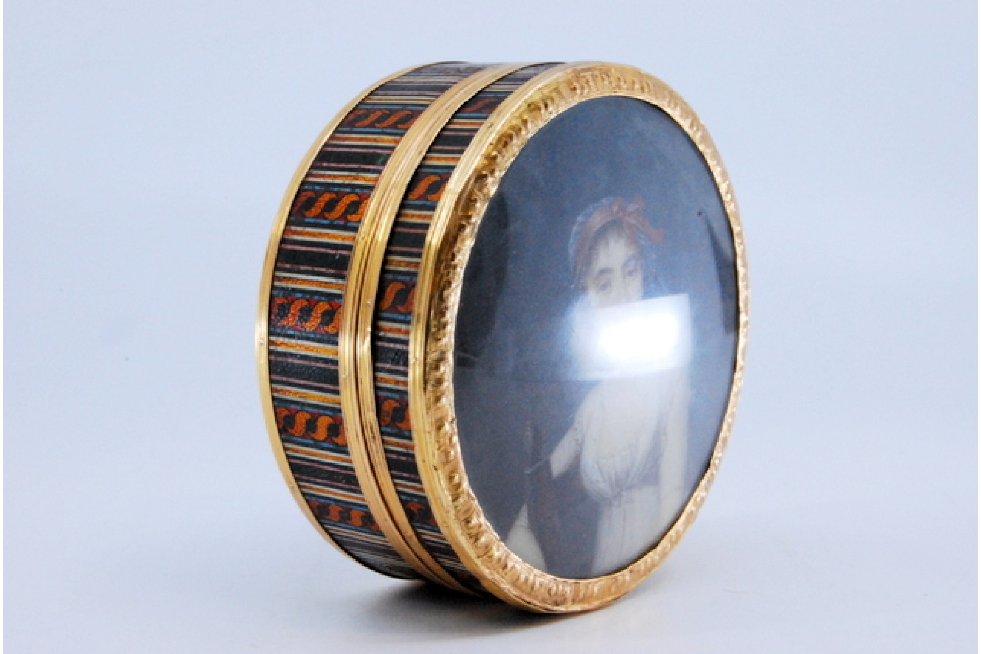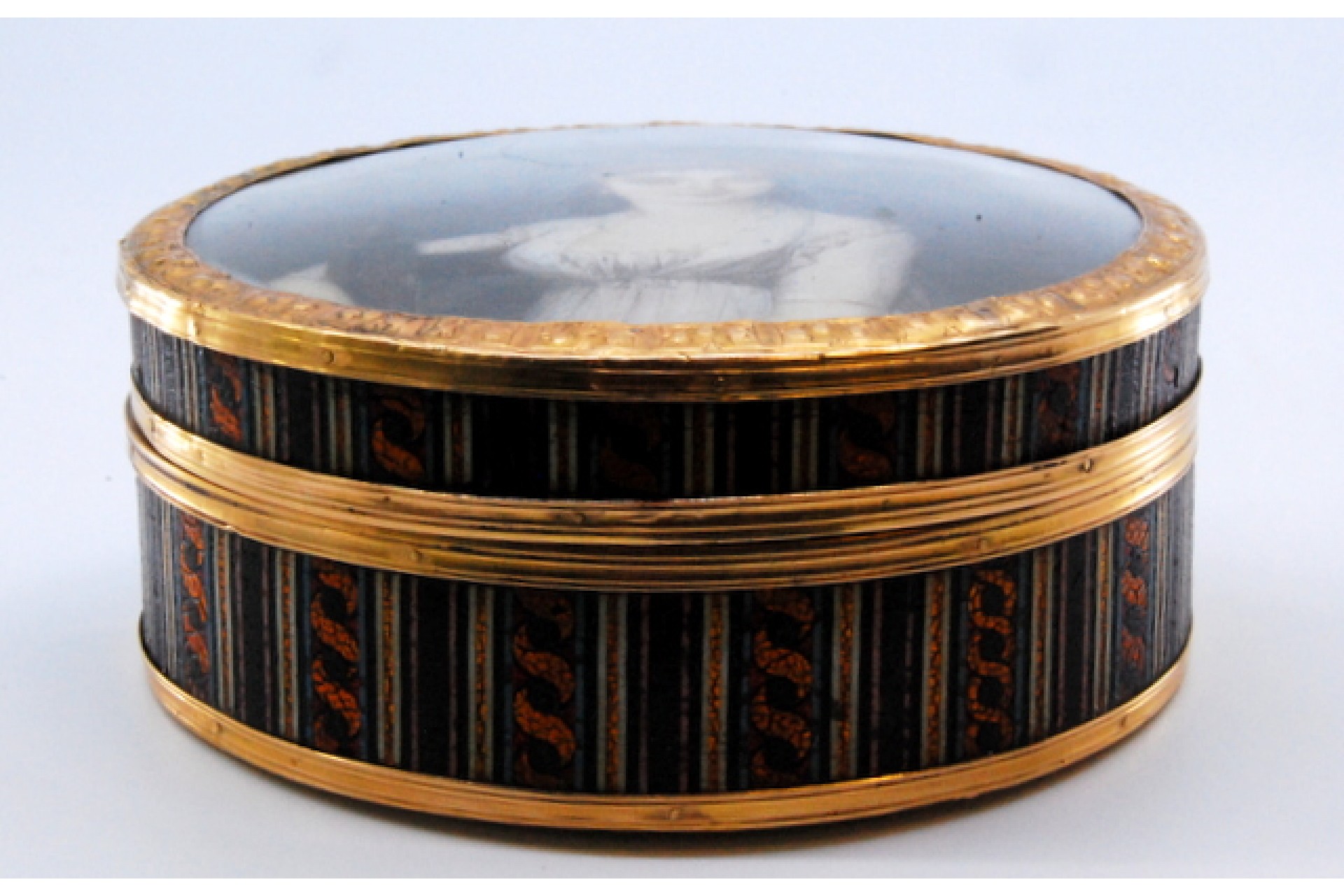 • Descrição: Caixa de toilette em ouro sobre tartaruga com dama antiga na tampa amovível.