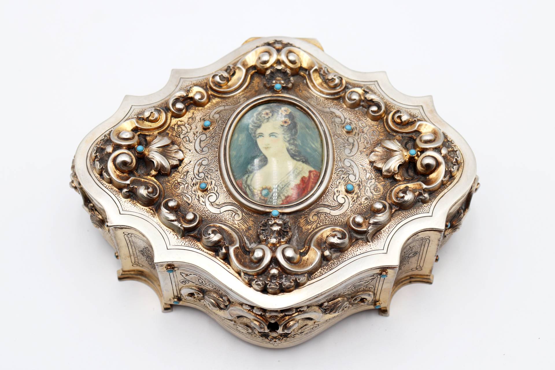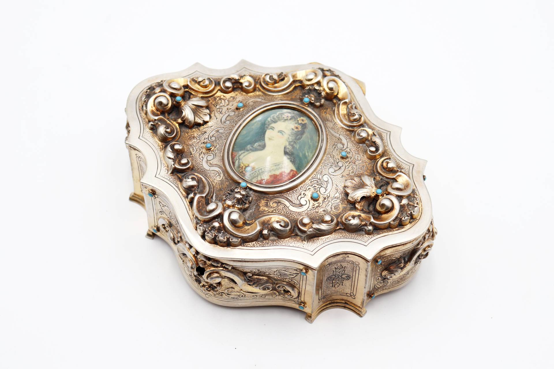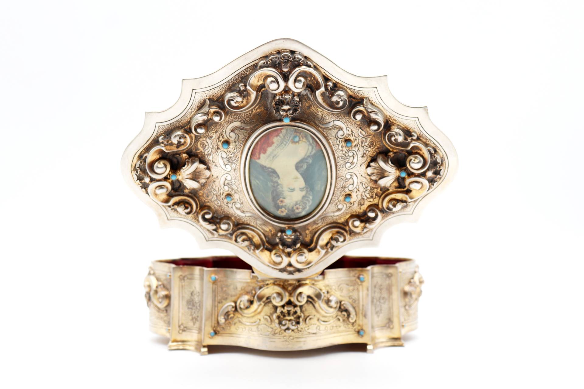 Guarda-jóias em prata com alto relevo, cartela com retrato e interior forrado