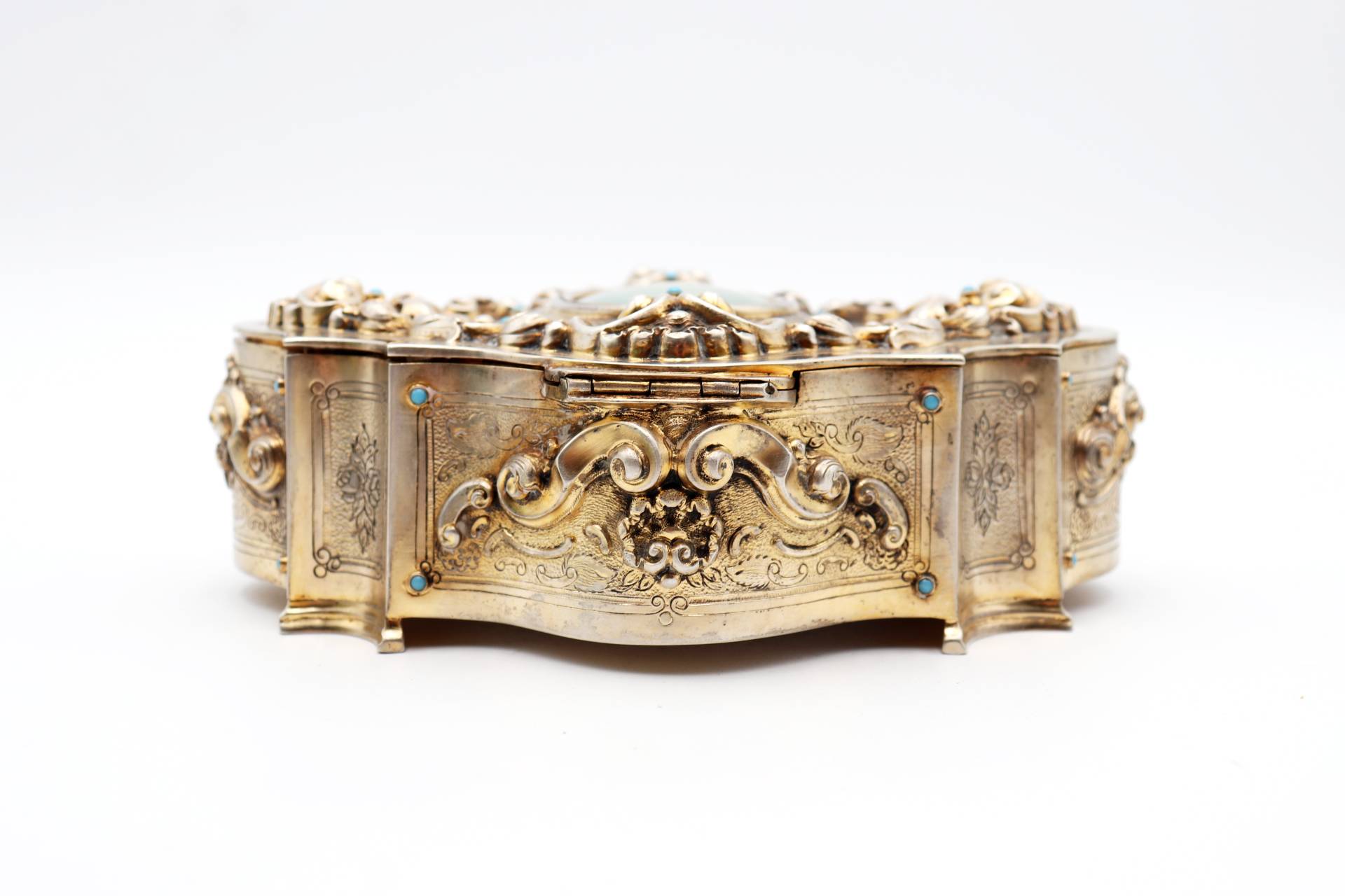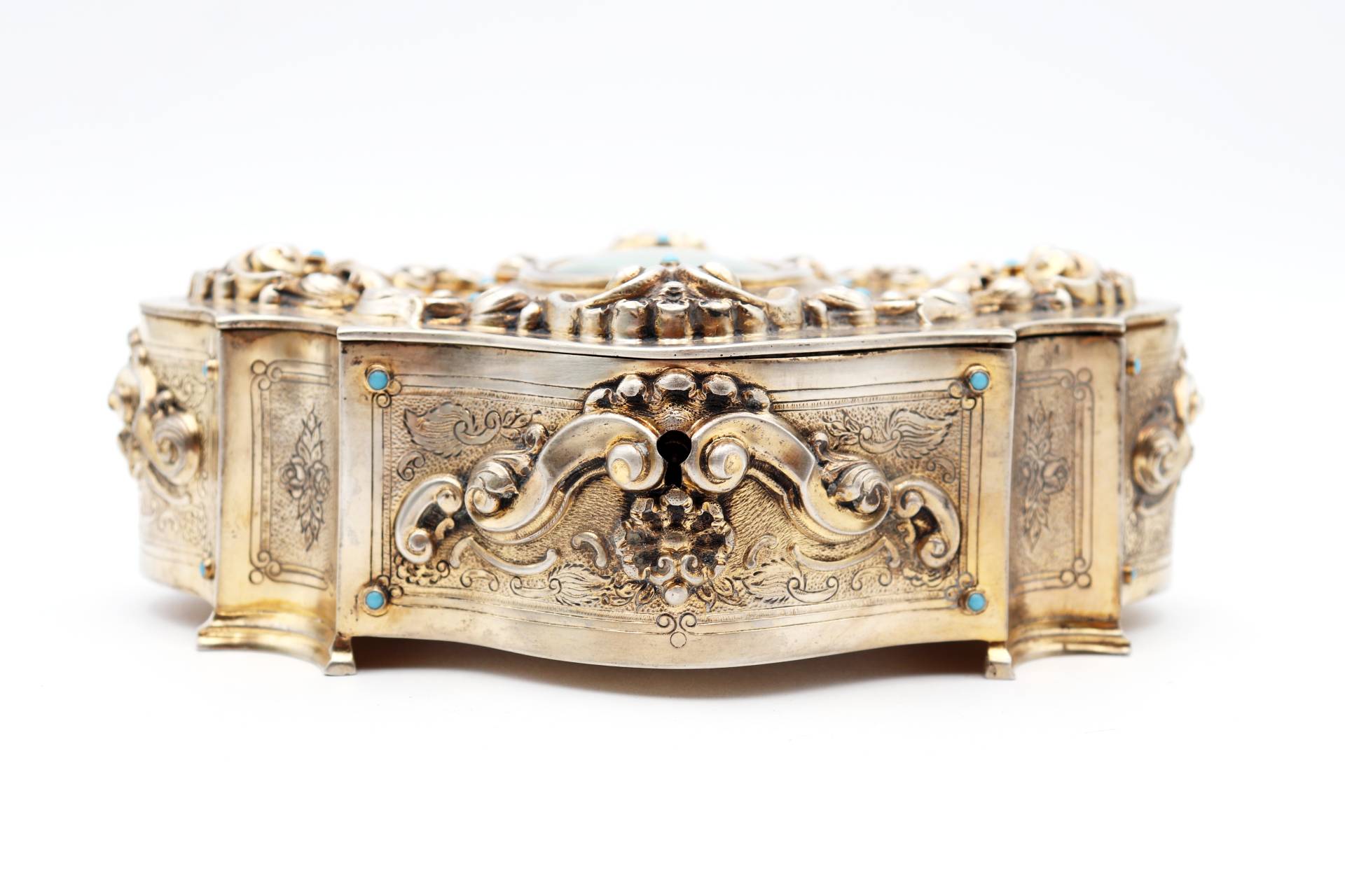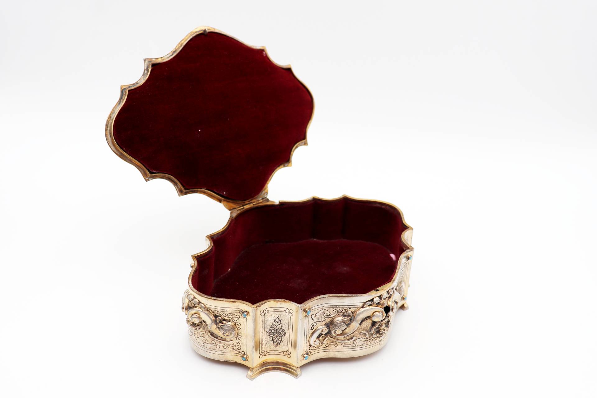 Guarda-jóias em prata com alto relevo, cartela com retrato e interior forrado