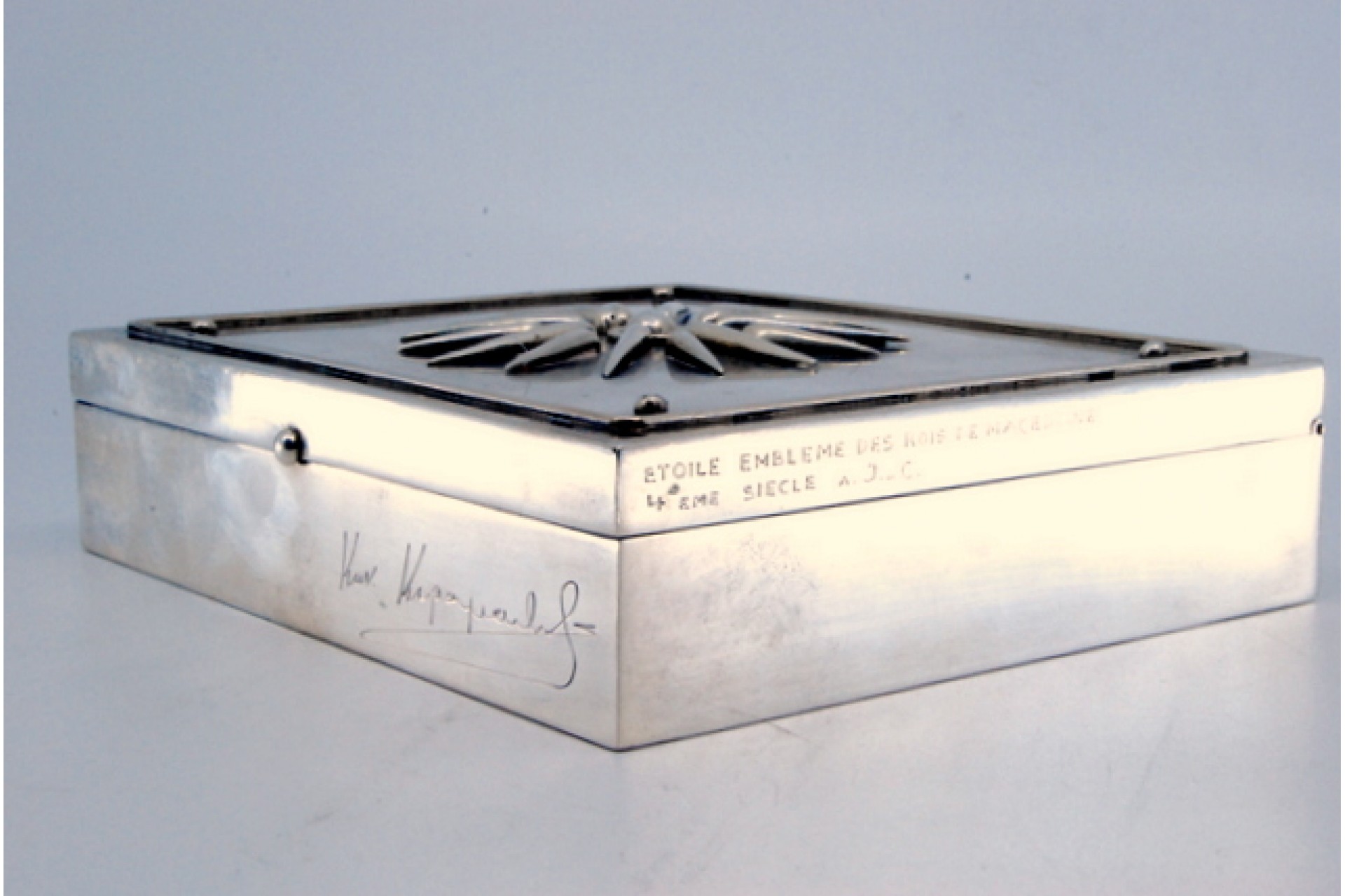 • Descrição: Caixa para tabaco com simbolo da Grécia (Macedónia) na tampa em forma de sol do século IV com interior revestido a madeira.