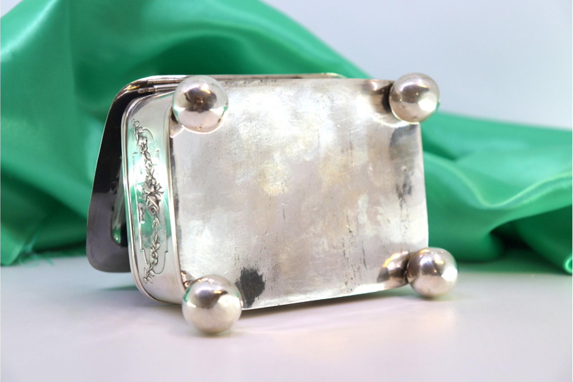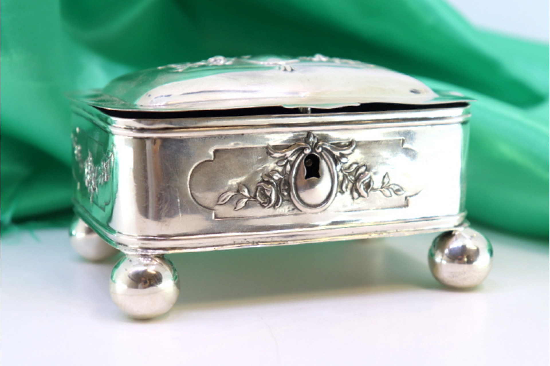 • Descrição: Guarda joias em prata com cartela para monograma na tampa, interior forrado e assente em quatro pés em formato esférico.