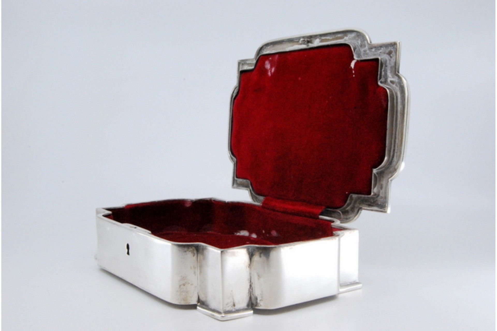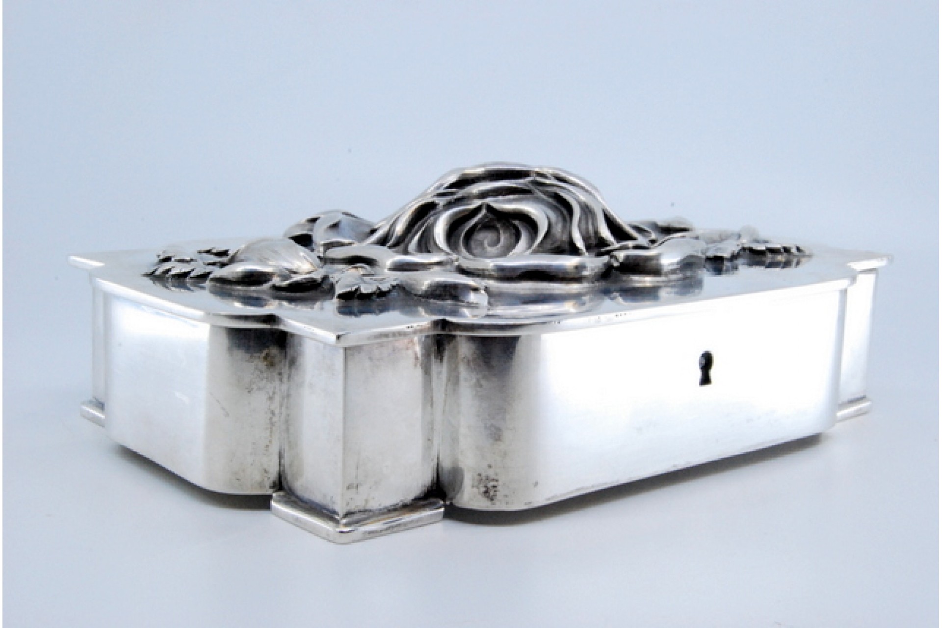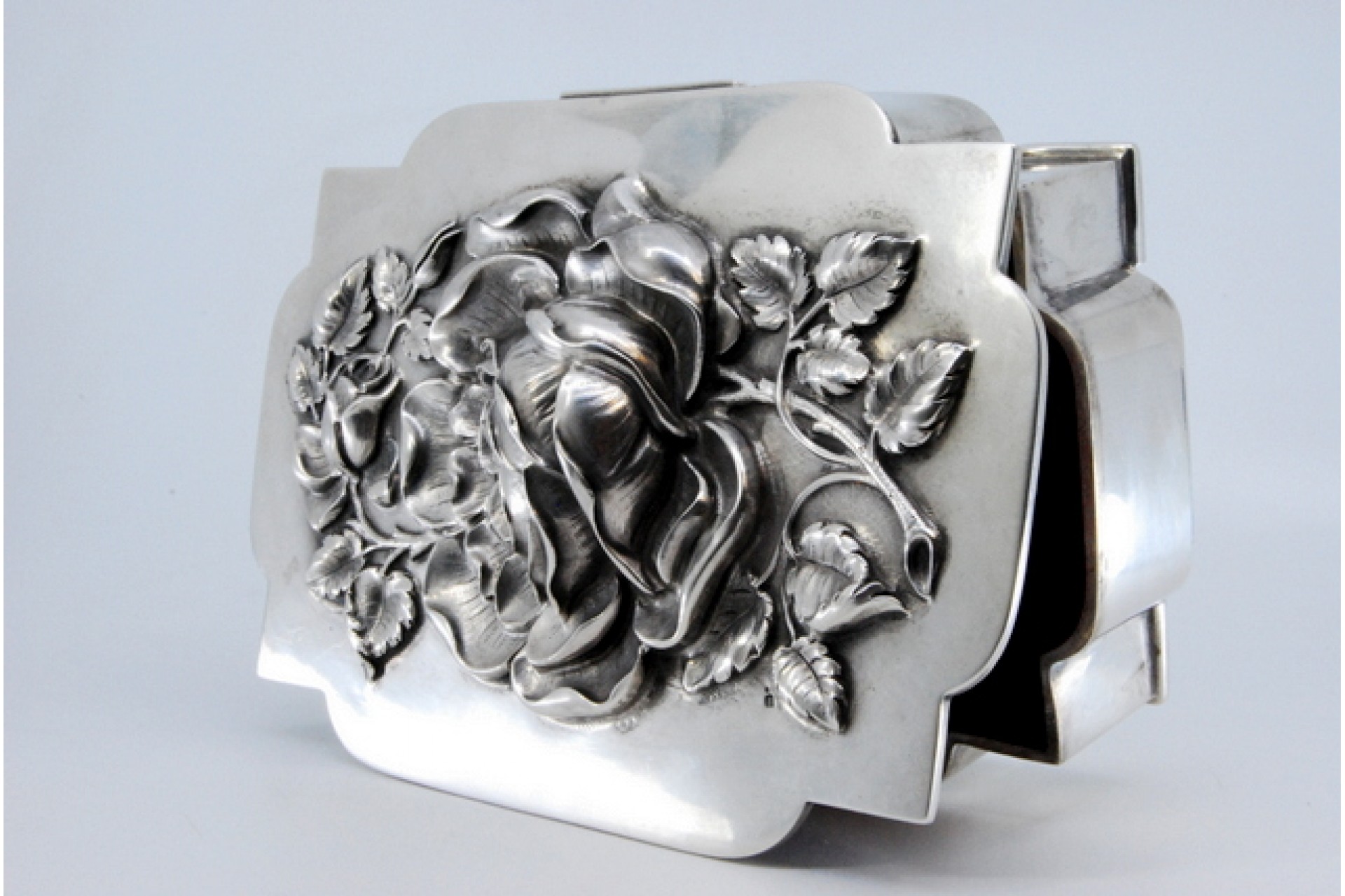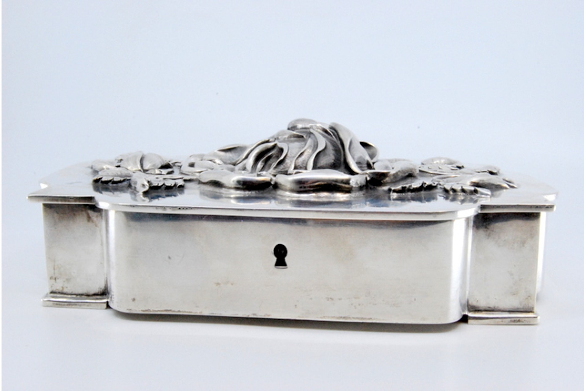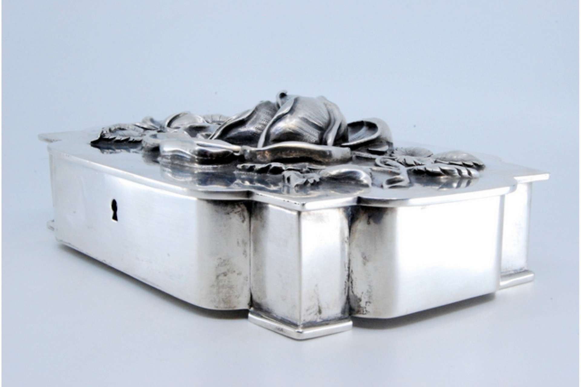 • Descrição: Guarda joias em prata relevada ao estilo Arte Nova com flores e interior forrado a veludo vermelho com tampa basculante.