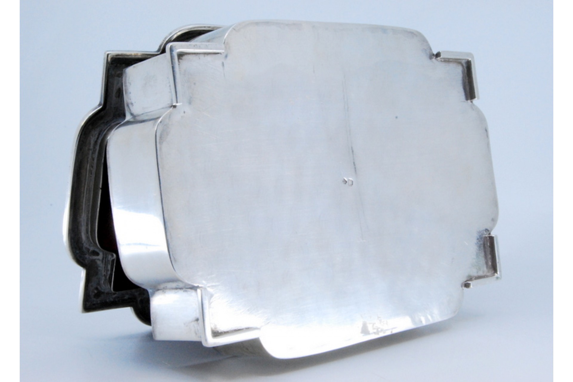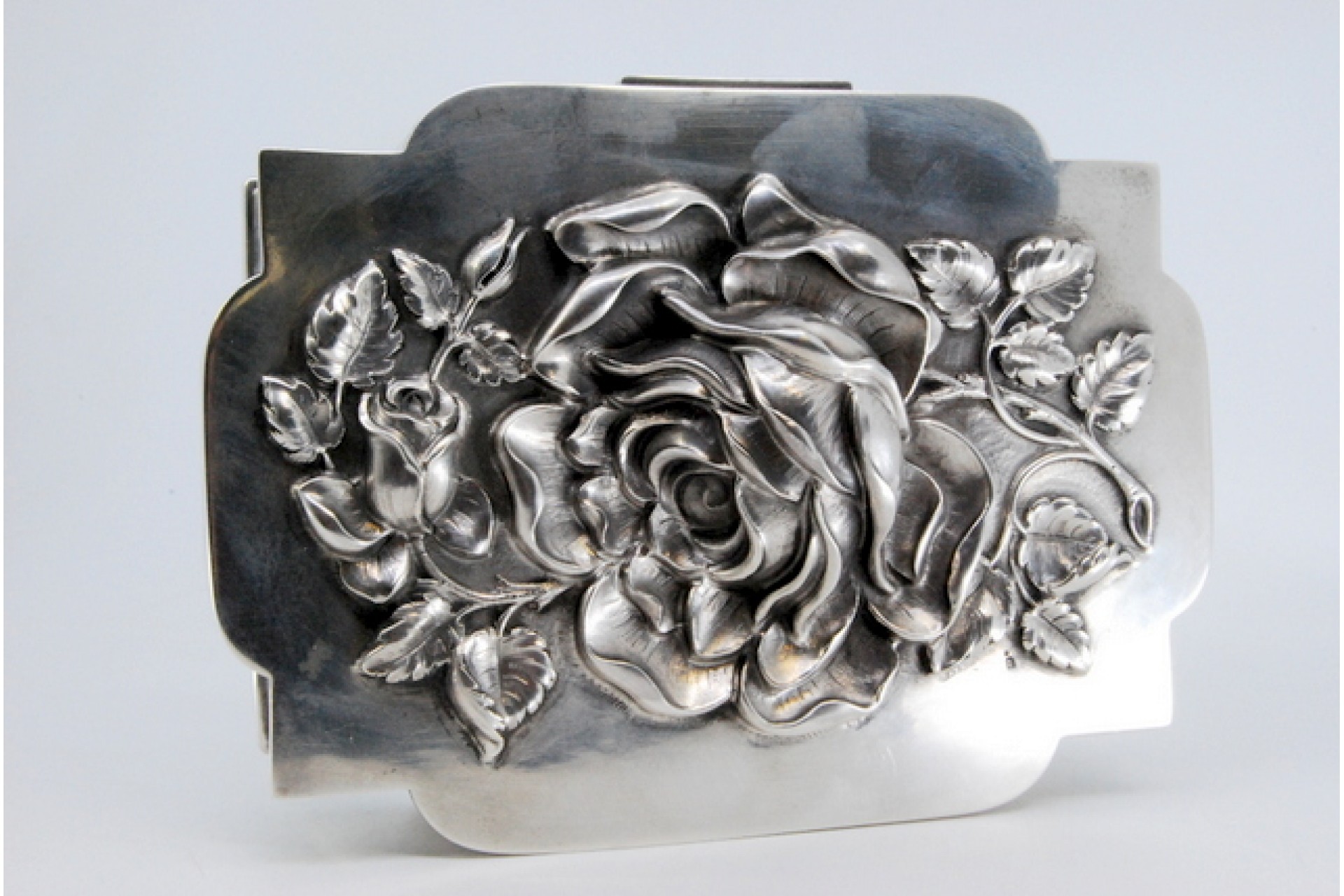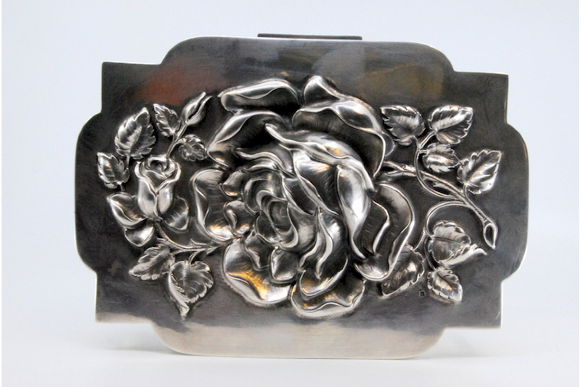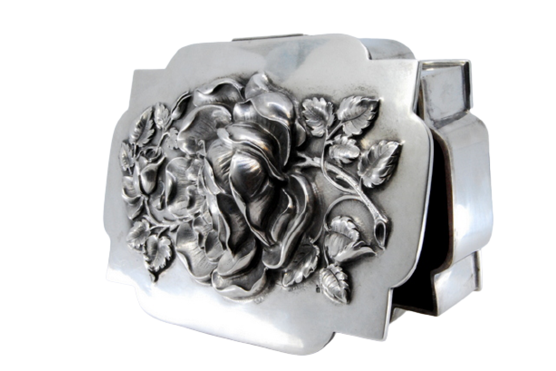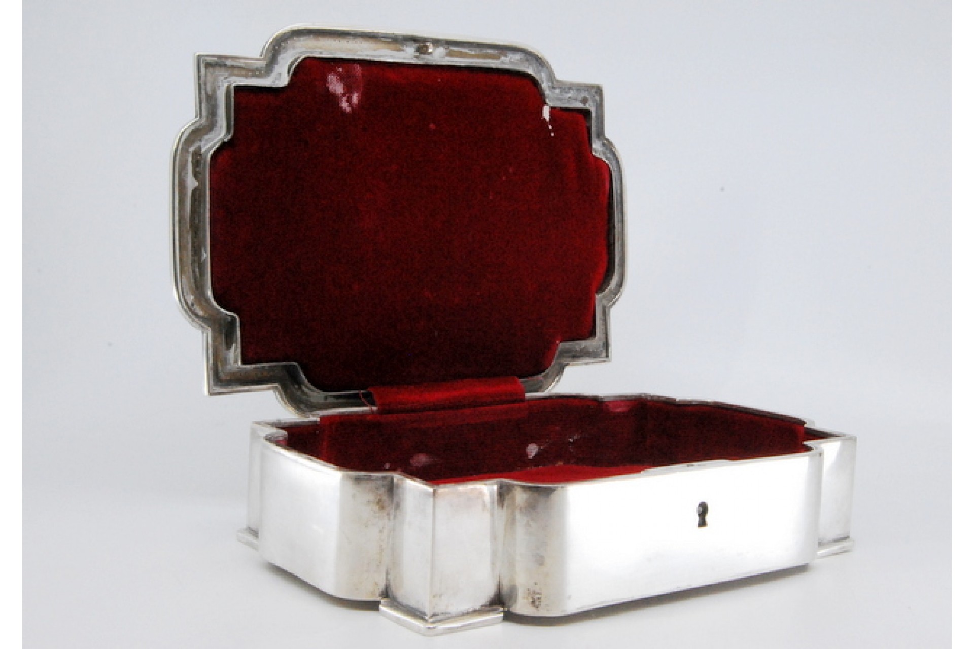 • Descrição: Guarda joias em prata relevada ao estilo Arte Nova com flores e interior forrado a veludo vermelho com tampa basculante.
