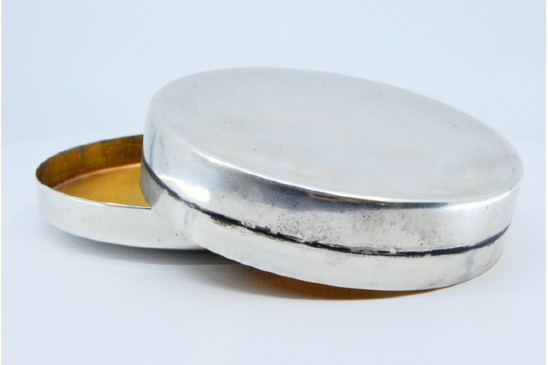 Caixa para alfinetes e agulhas em prata lisa e com gravação de casal em dança.