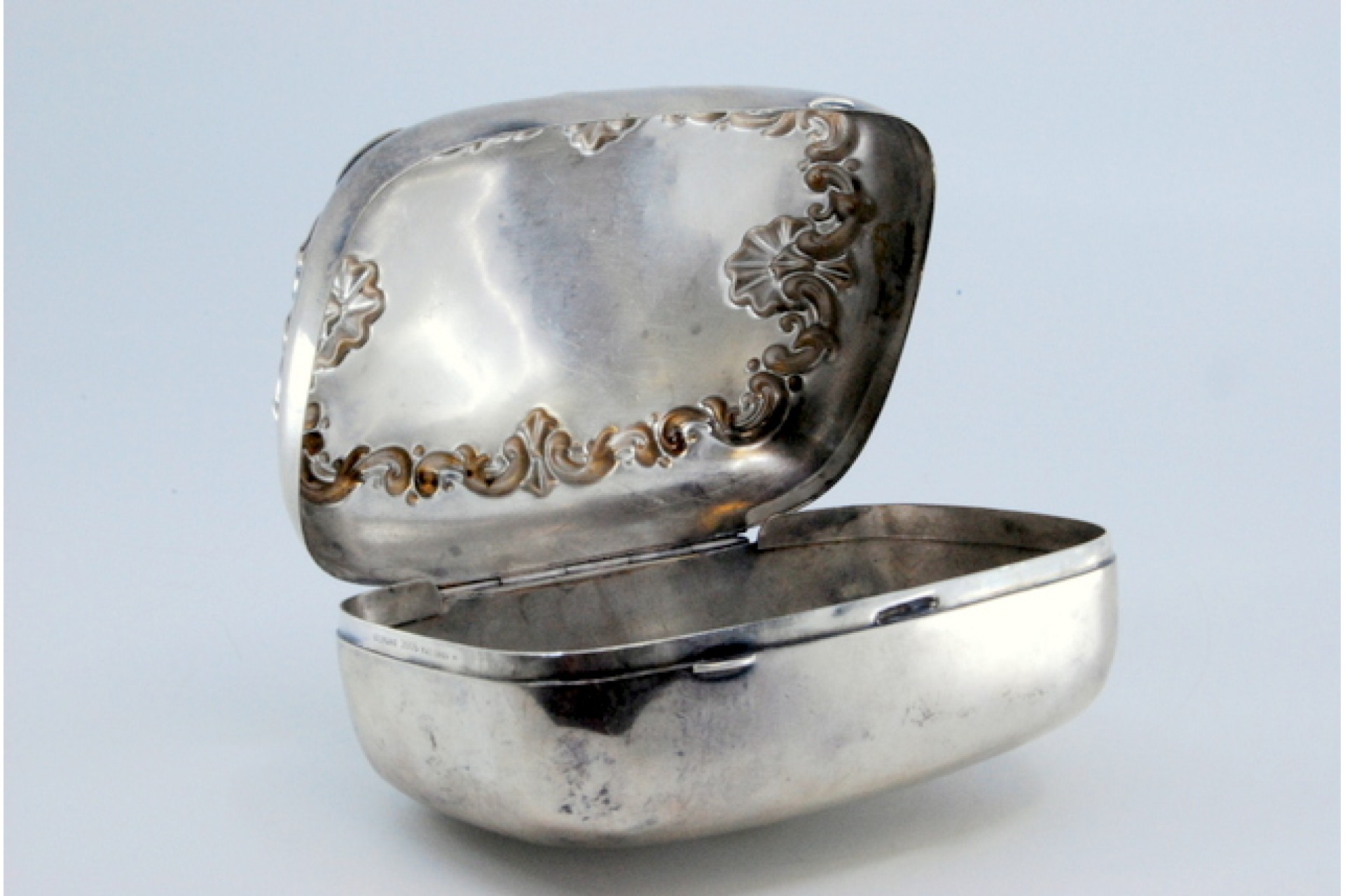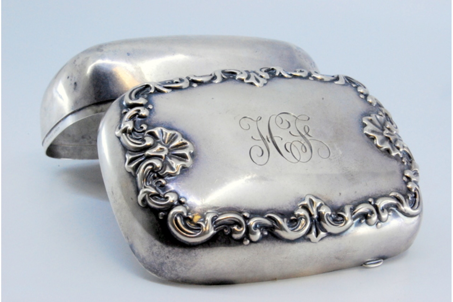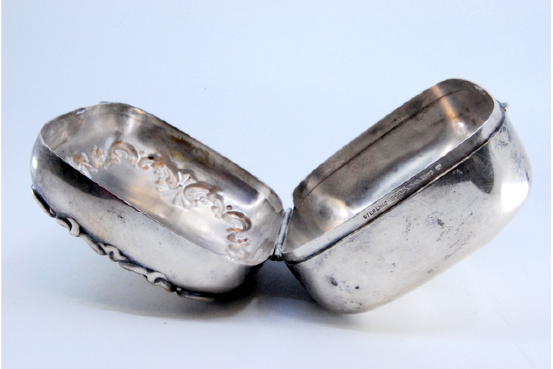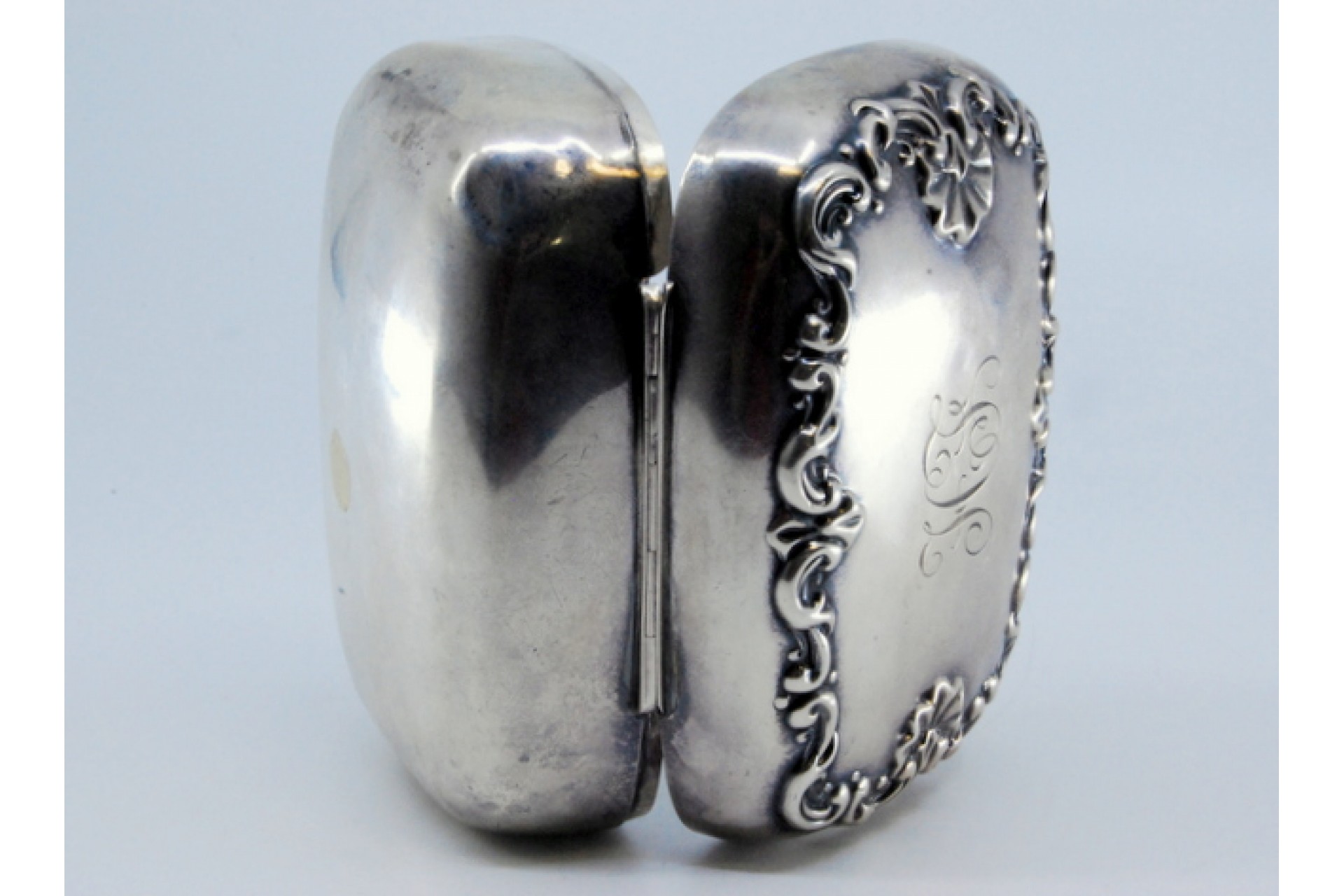 Saboneteira em prata lisa com motivos florais relevados na tampa.