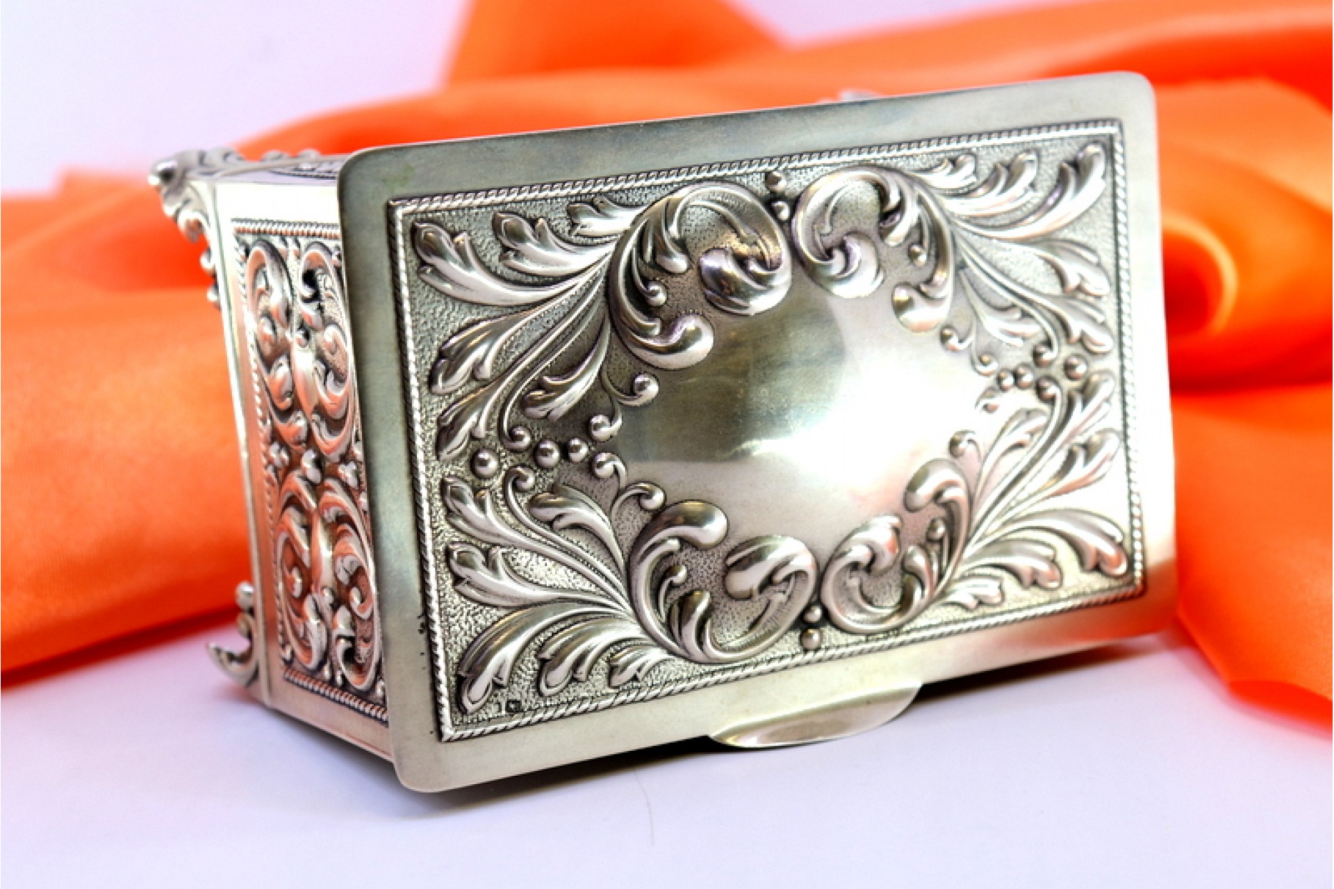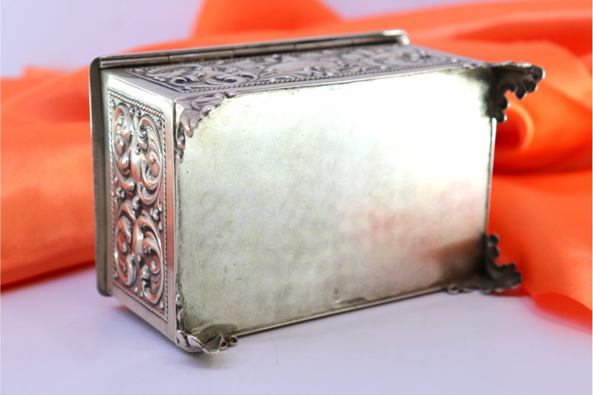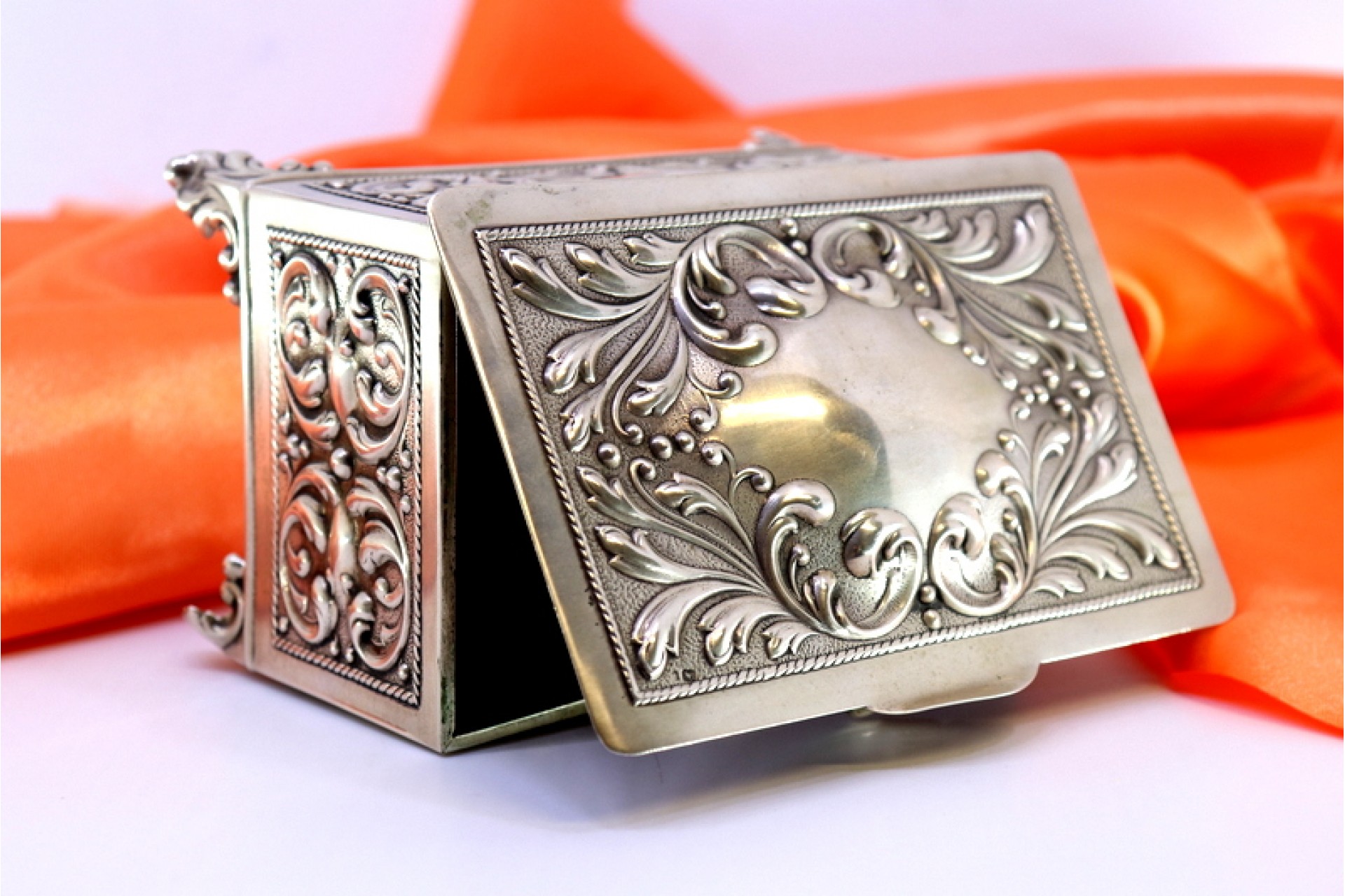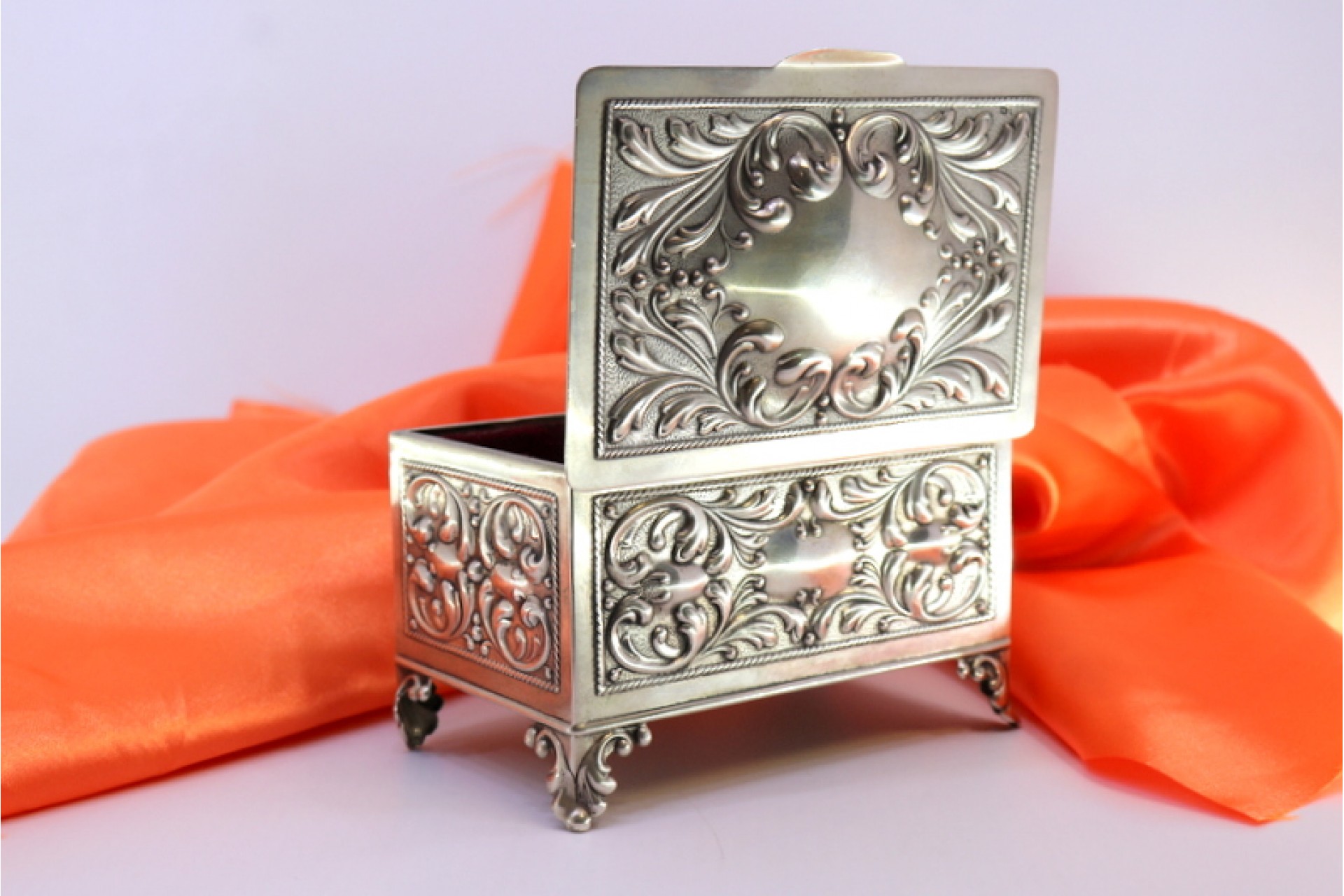 • Descrição: Guarda joias em prata com relevos envolvendo cartela para monograma na tampa e interior aveludado, assente em quatro pés.