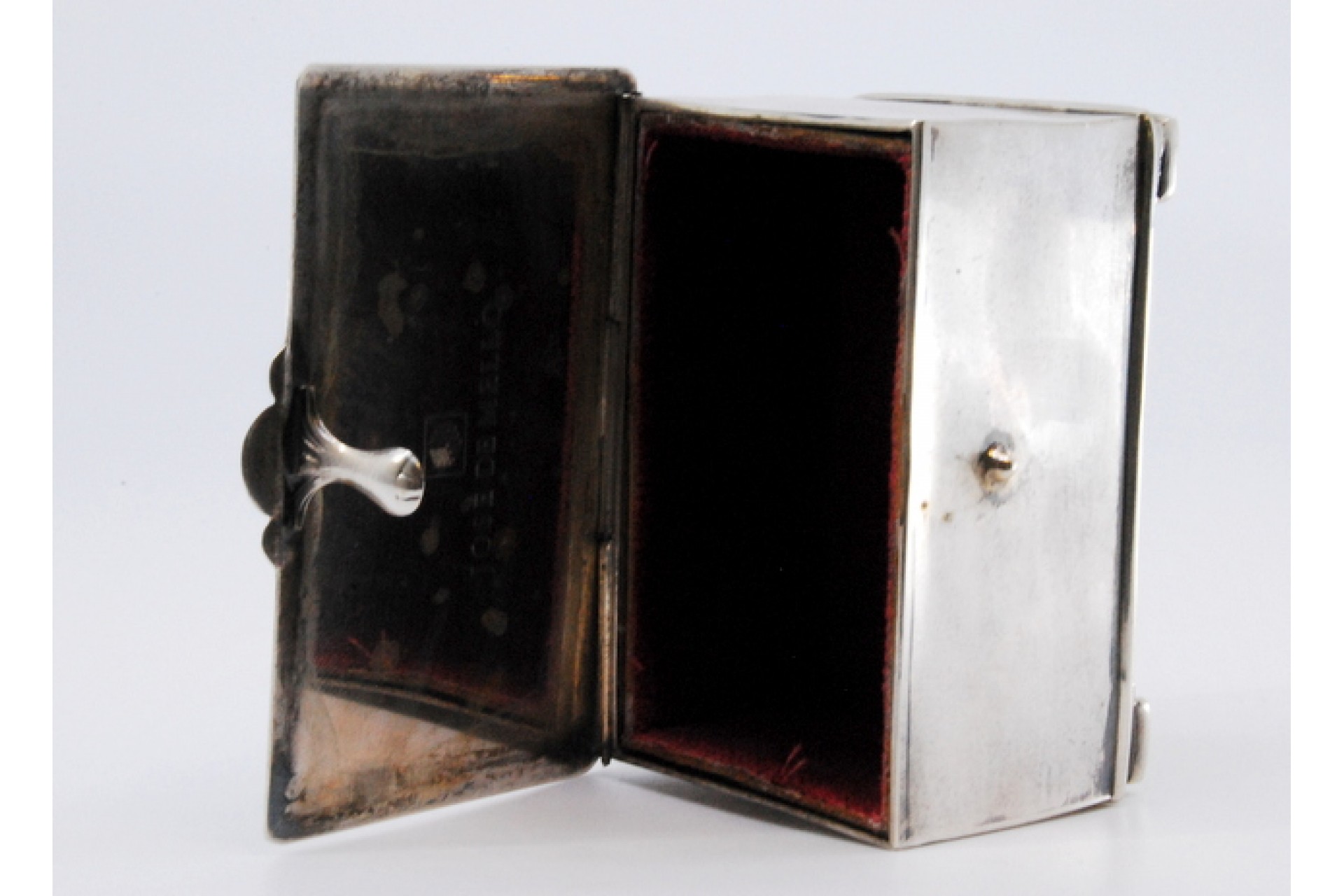 • Descrição: Guarda joias em forma de cofre em prata lisa com interior aveludado a vermelho e assente sobre quatro pés com tampa basculante.