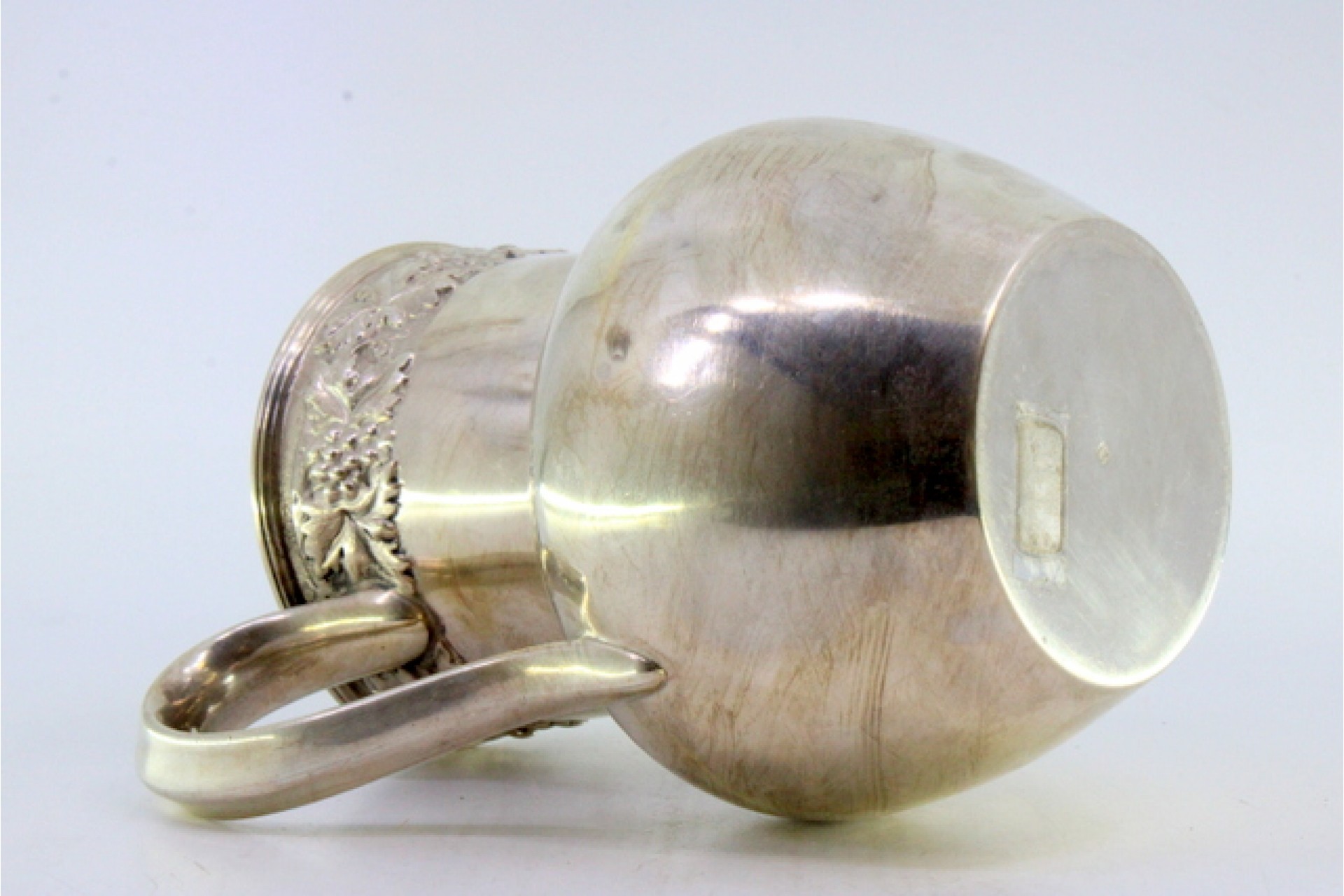 • Descrição: Jarro de vinho em prata com relevos e aplicações de folhas e cachos de uvas em corpo liso.