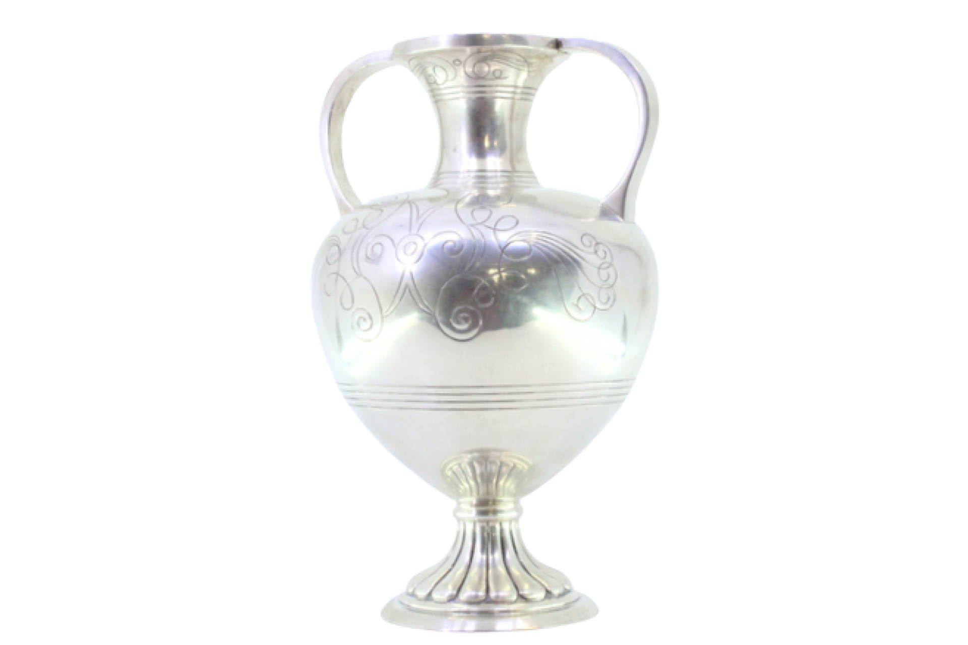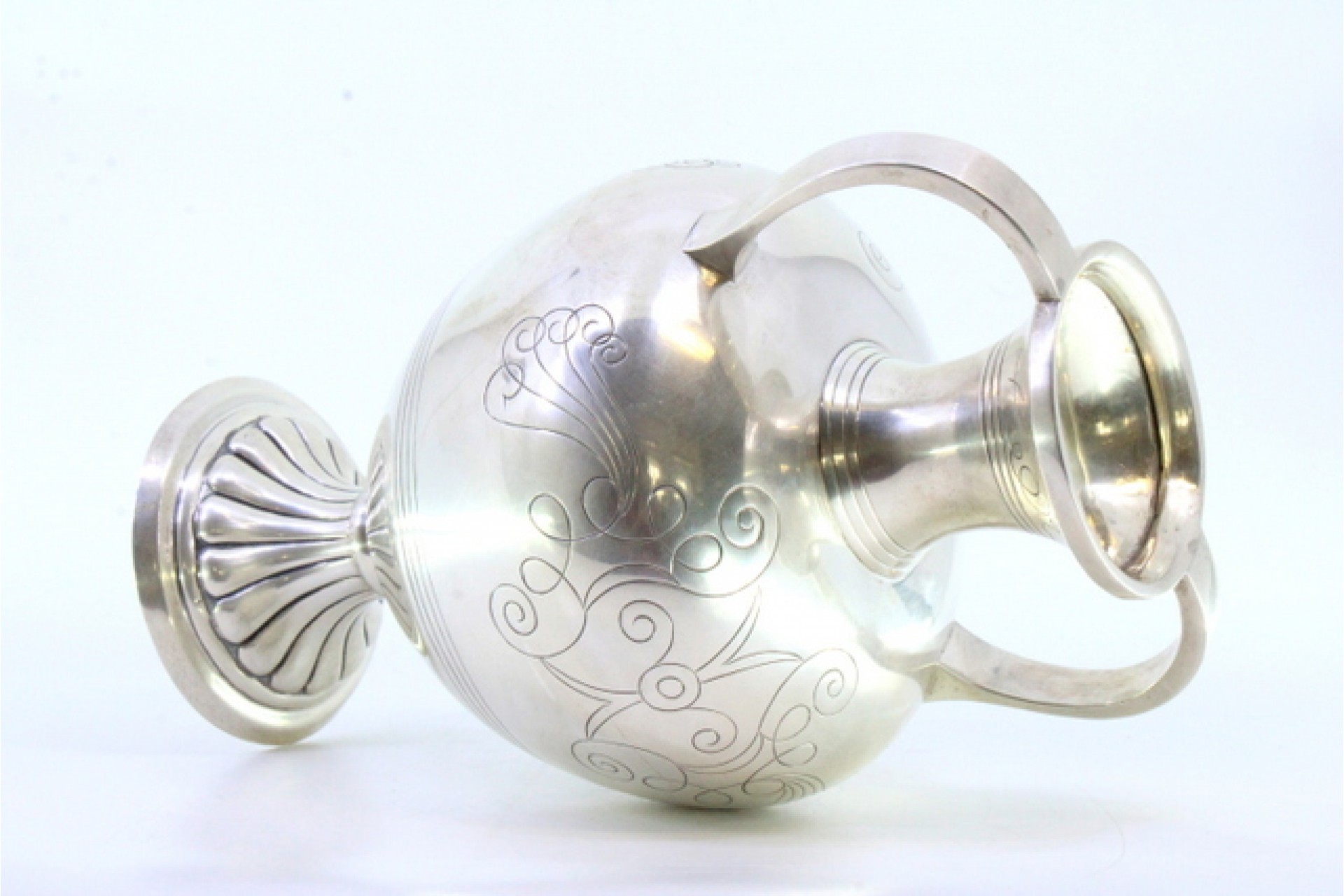• Descrição: Jarra em prata com gravados e duas pegas lisas com assente em base circular canelada com friso.