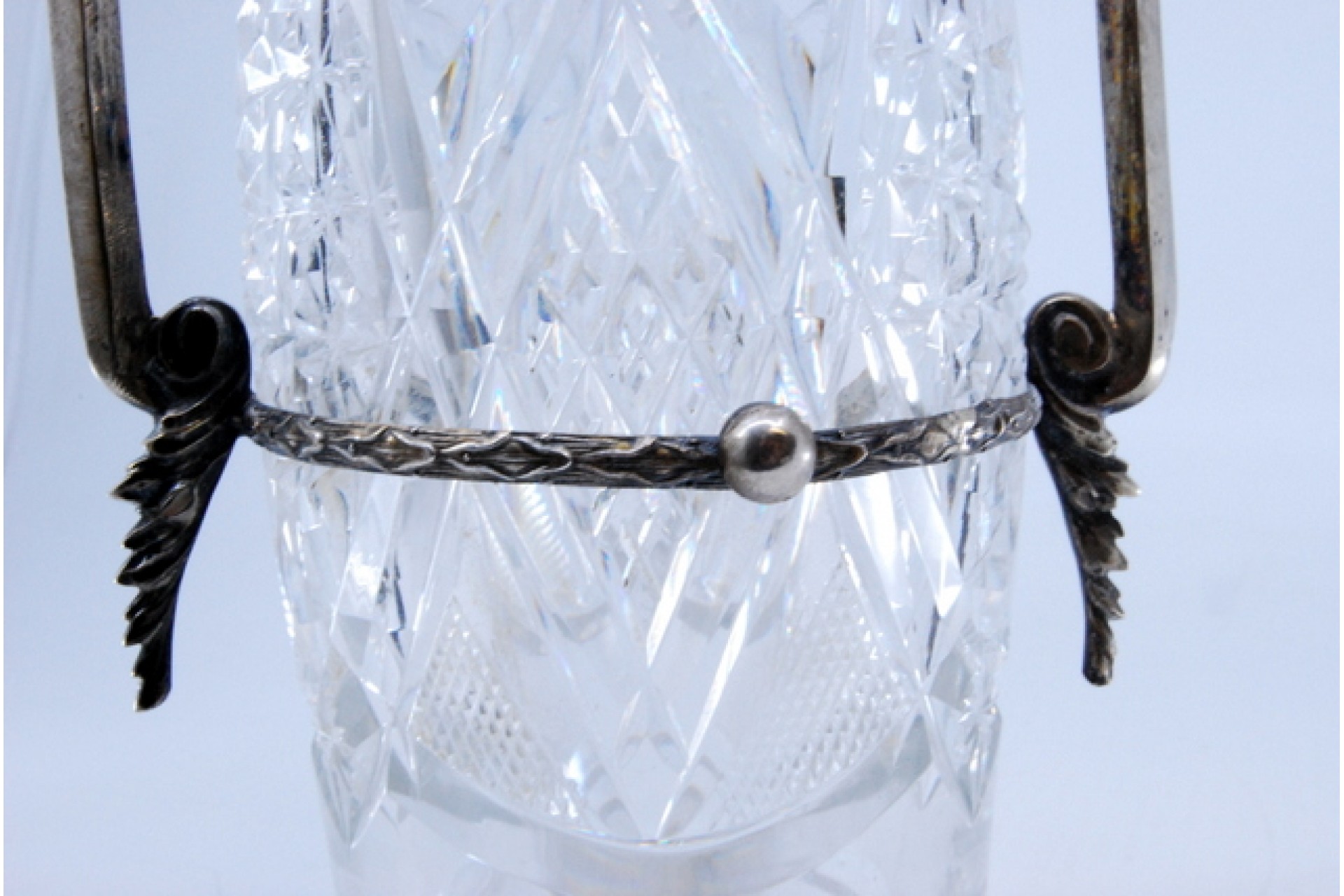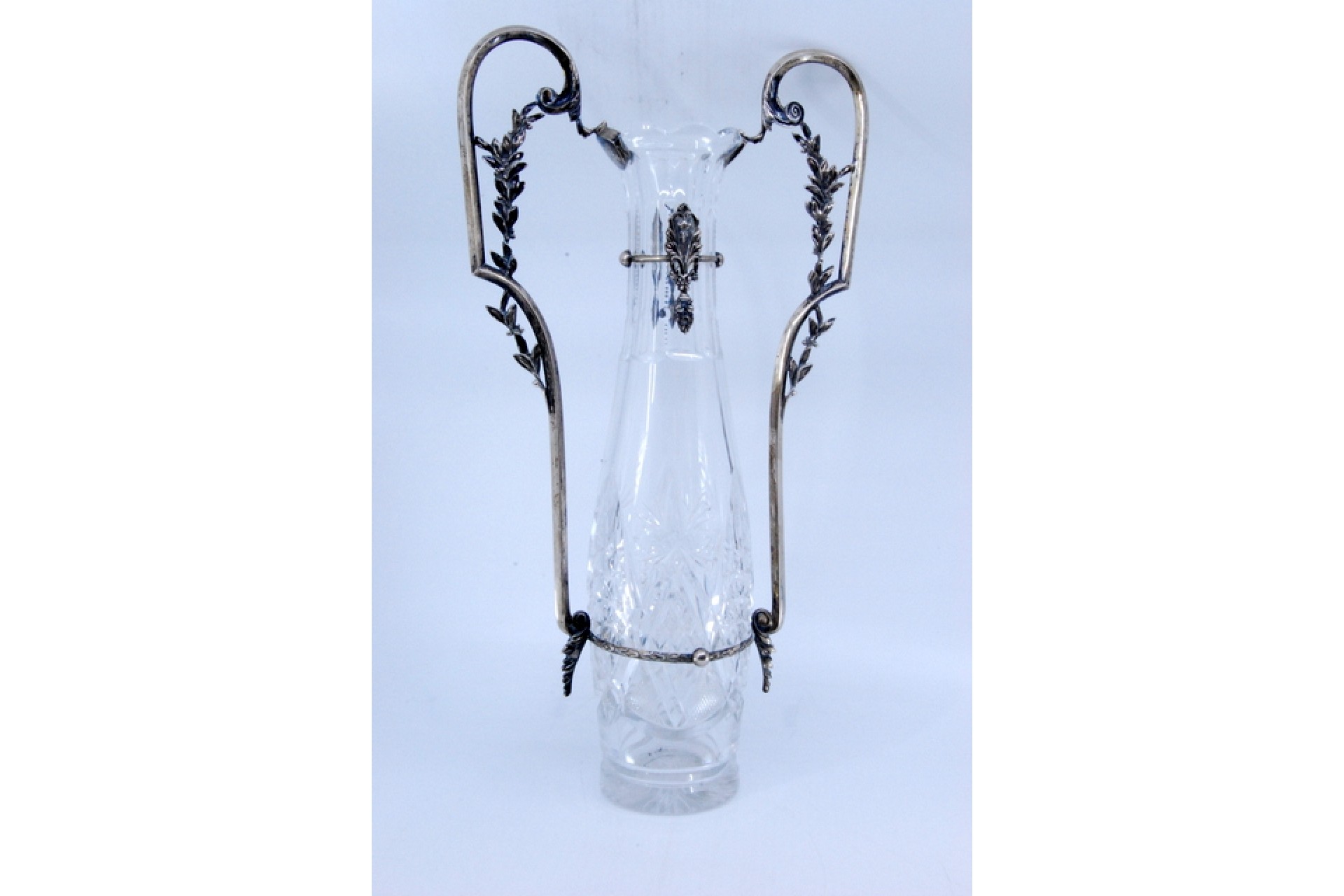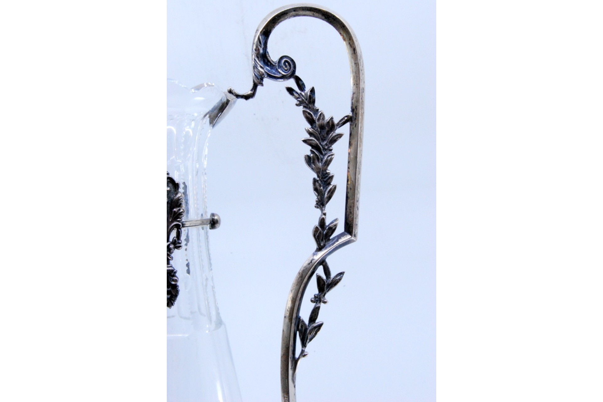 Jarra em vidro lapidado com estrutura, gargalo e pegas em prata com motivos florais.