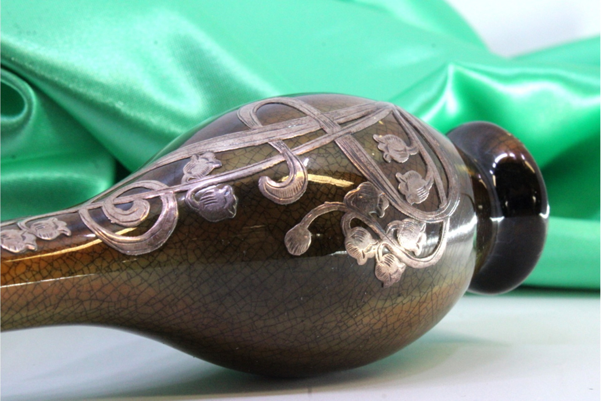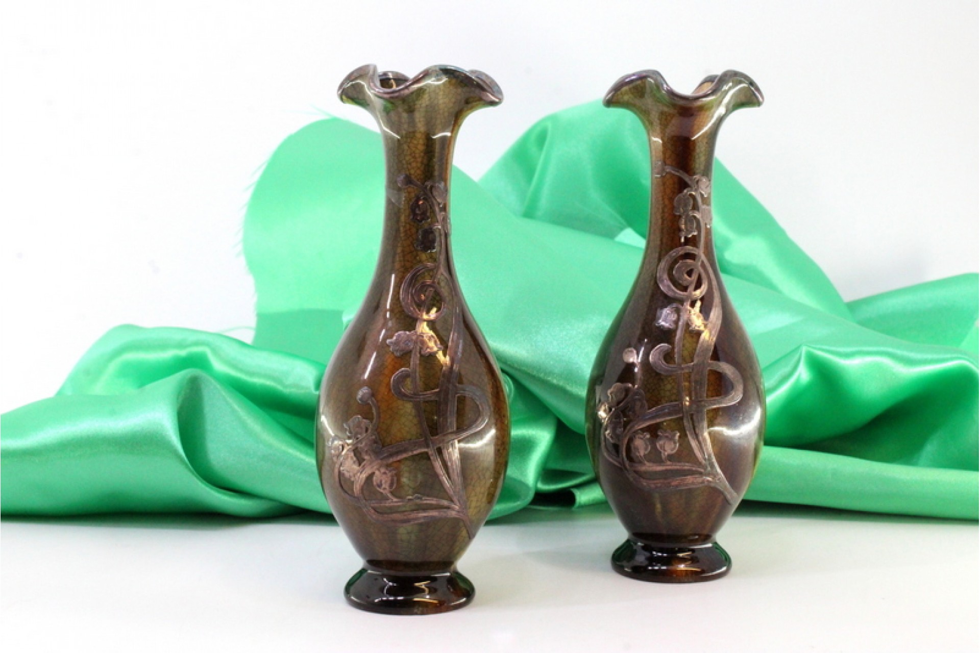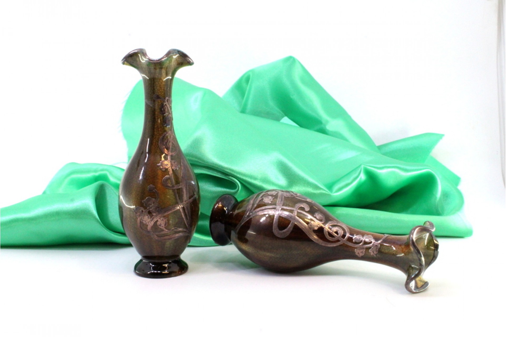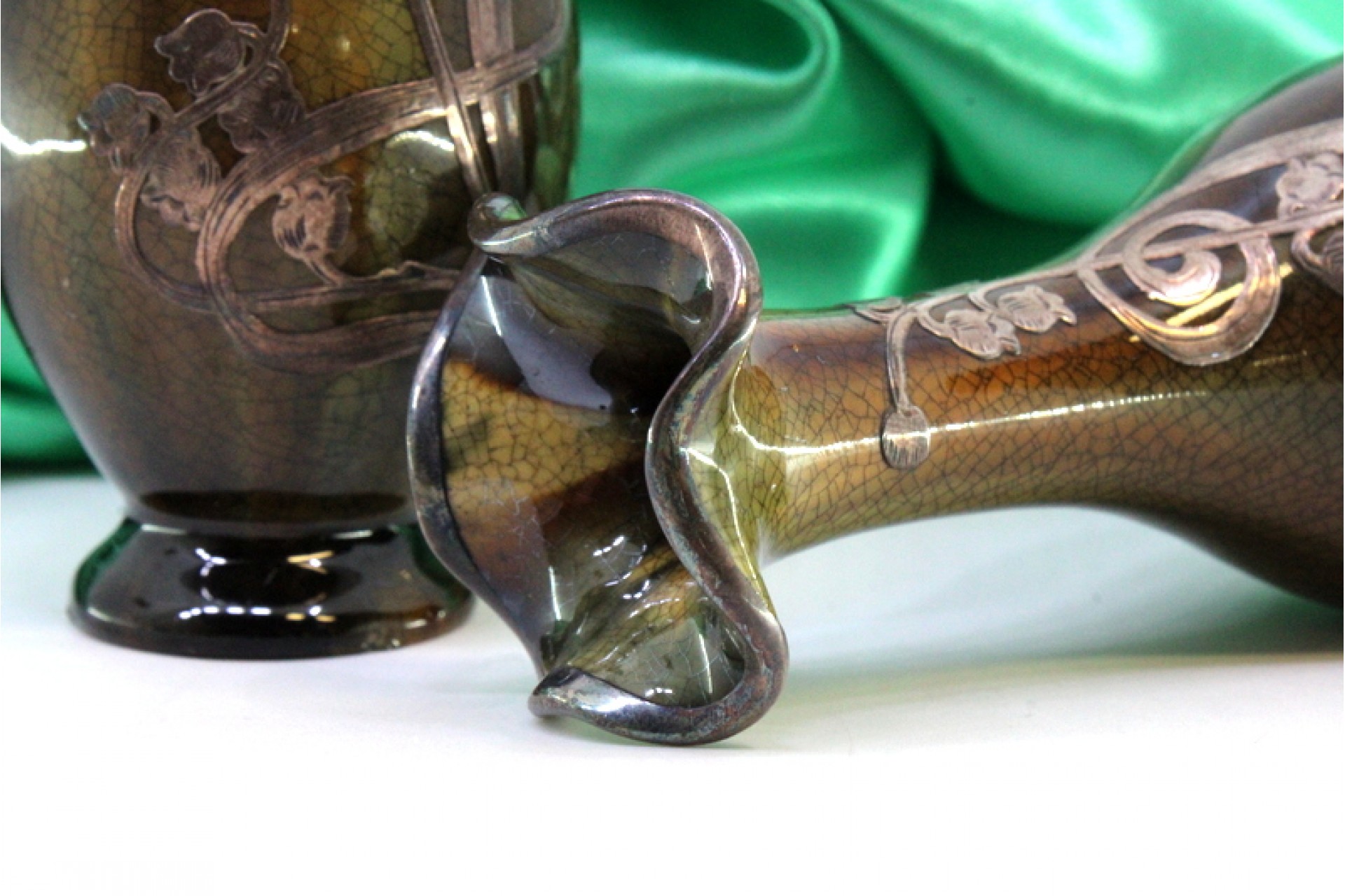 Jarras pequenas em porcelana vidrada com aplicações florais em prata.