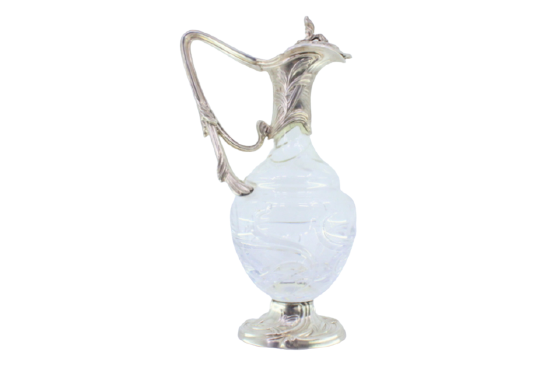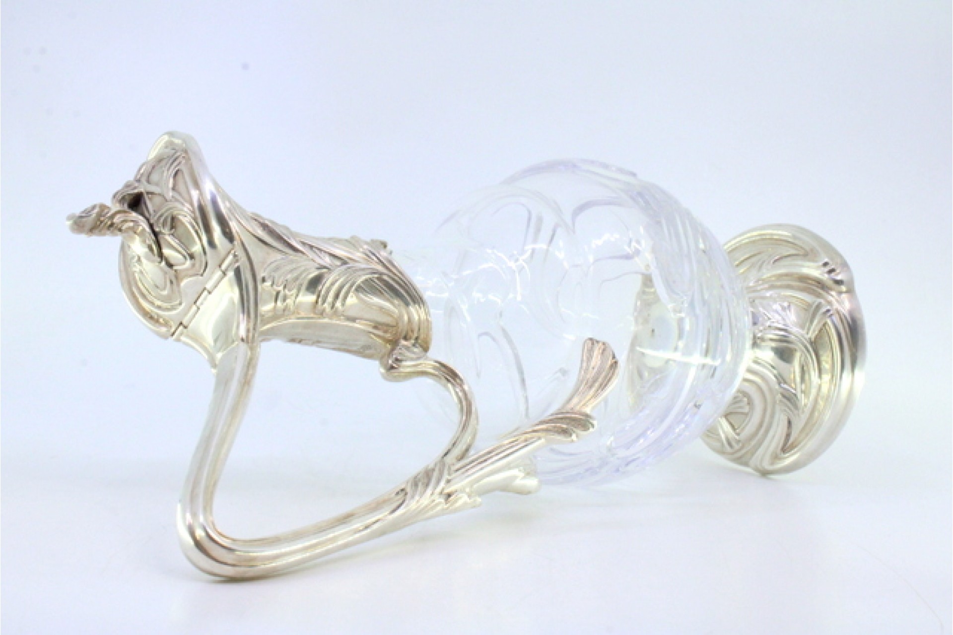 • Descrição: Jarro de vinho em vidro com aplicações de prata no gargalo e base, com pomo na tampa basculante.