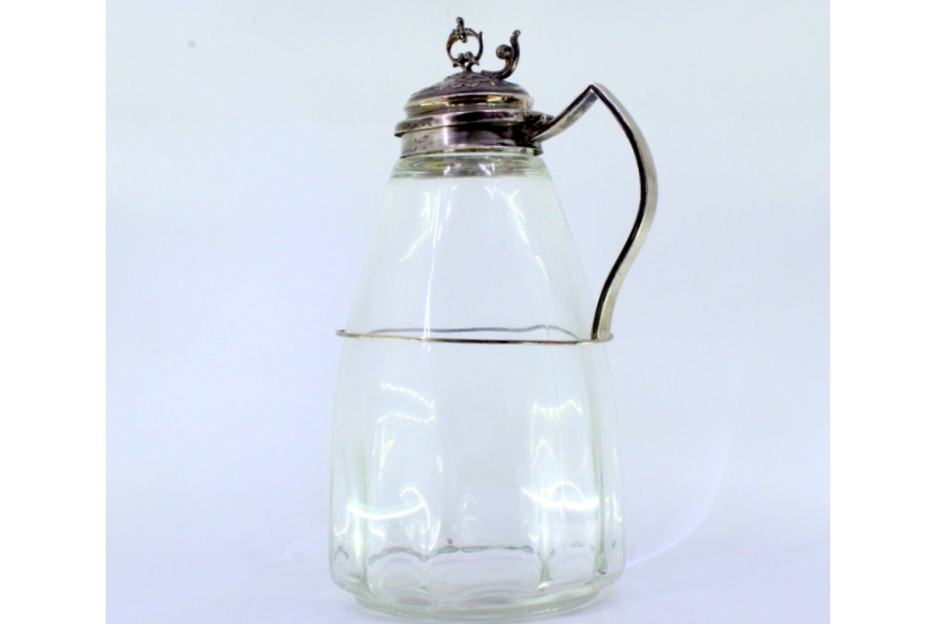 Jarro de vinho em vidro com suporte em prata e aplicação relevada na tampa com pomo vazado.