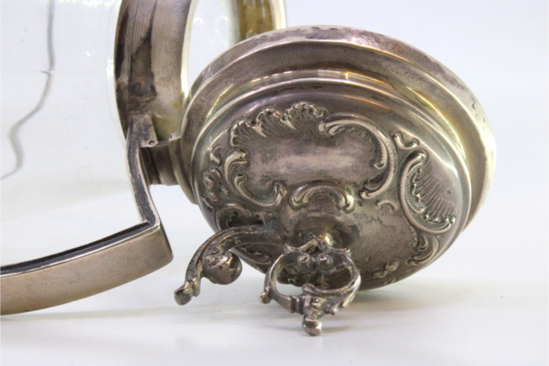 • Descrição: Jarro de vinho em vidro com suporte em prata e aplicação relevada na tampa com pomo vazado.