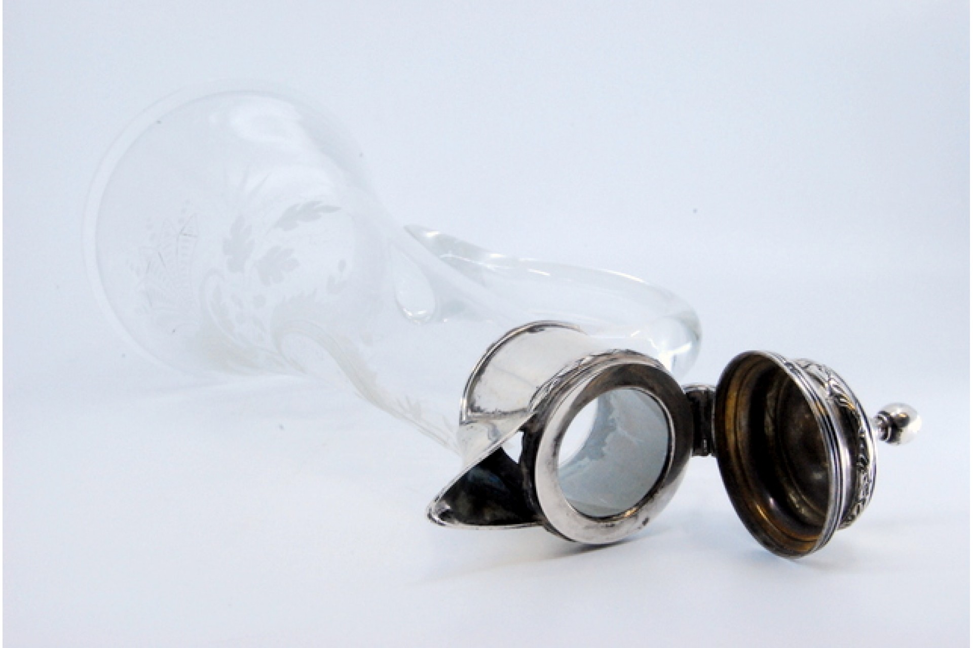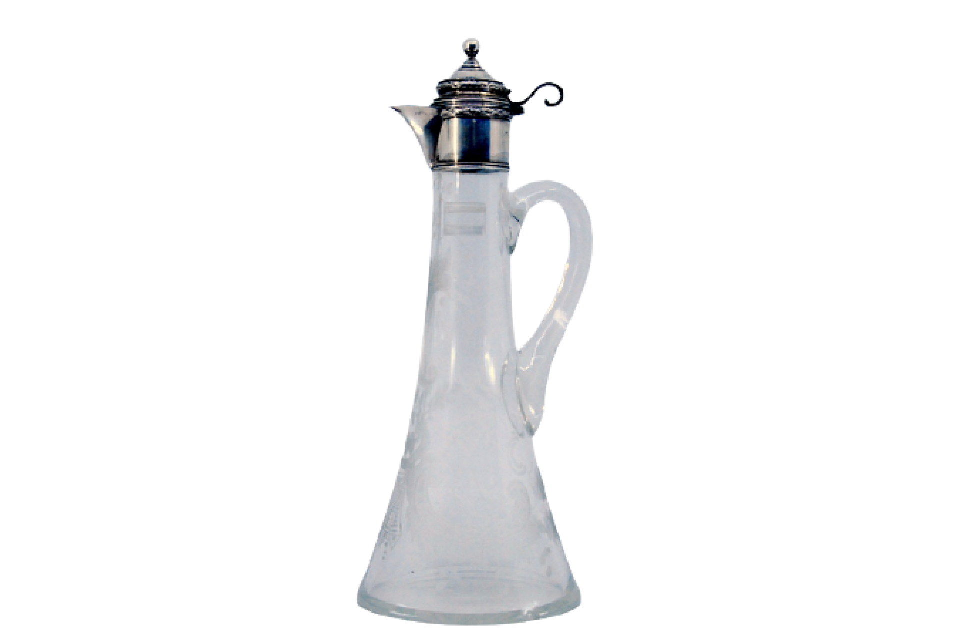 • Descrição: Jarro em vidro com relevos no gargalo e tampa basculante em prata.