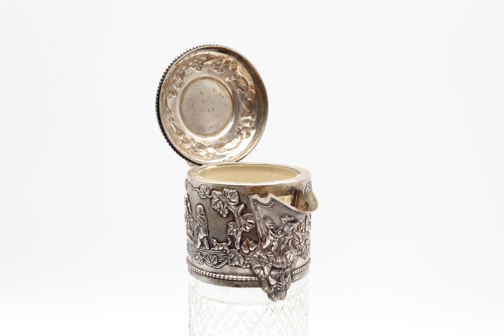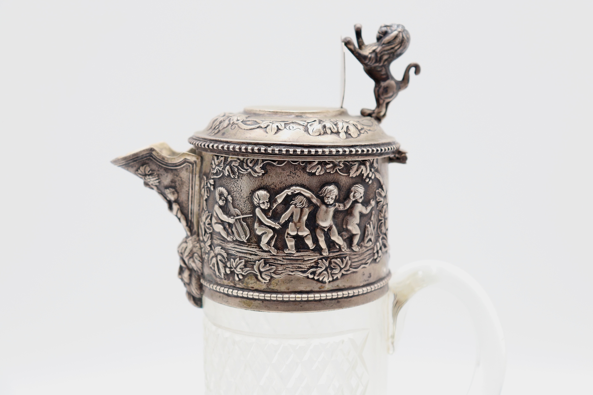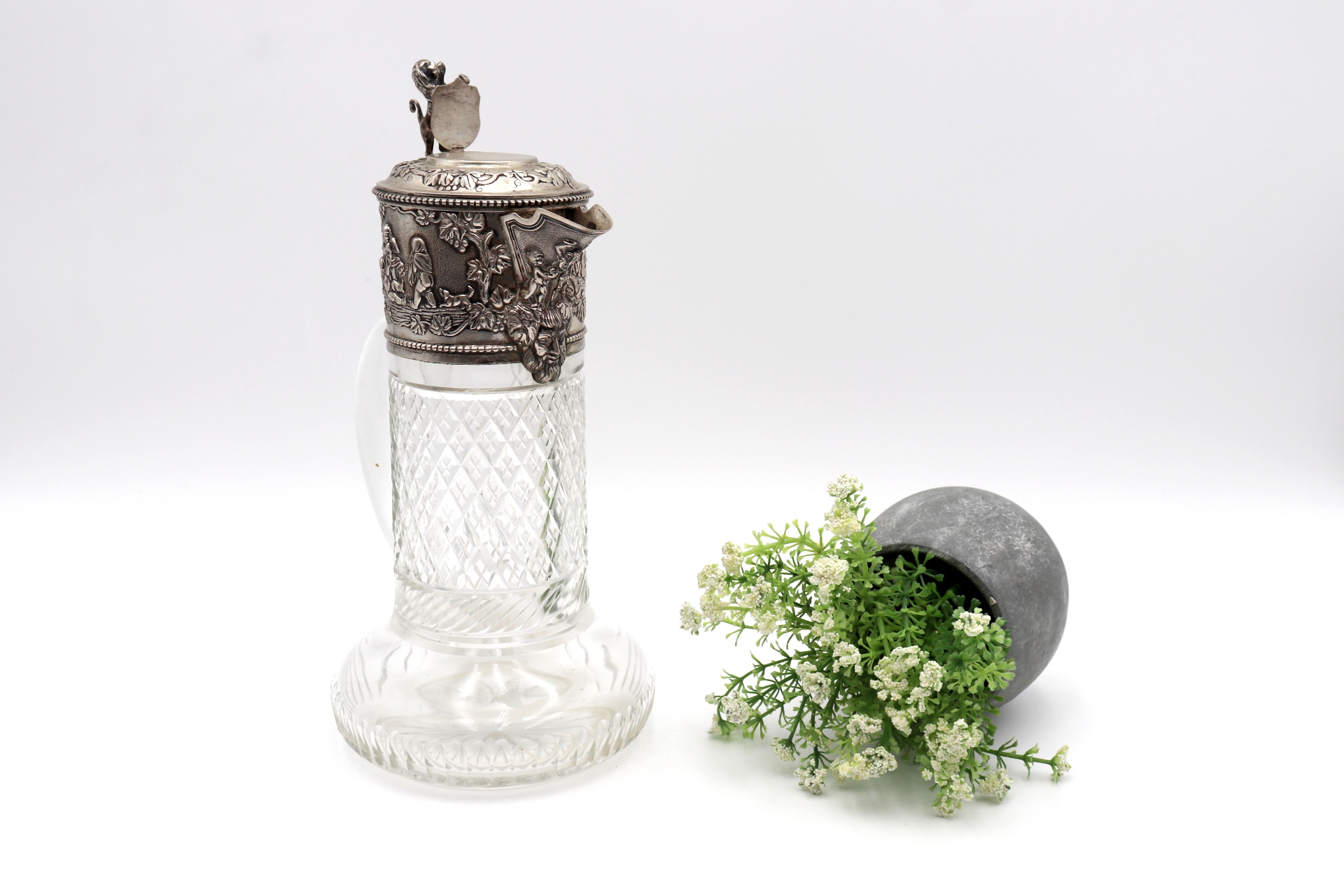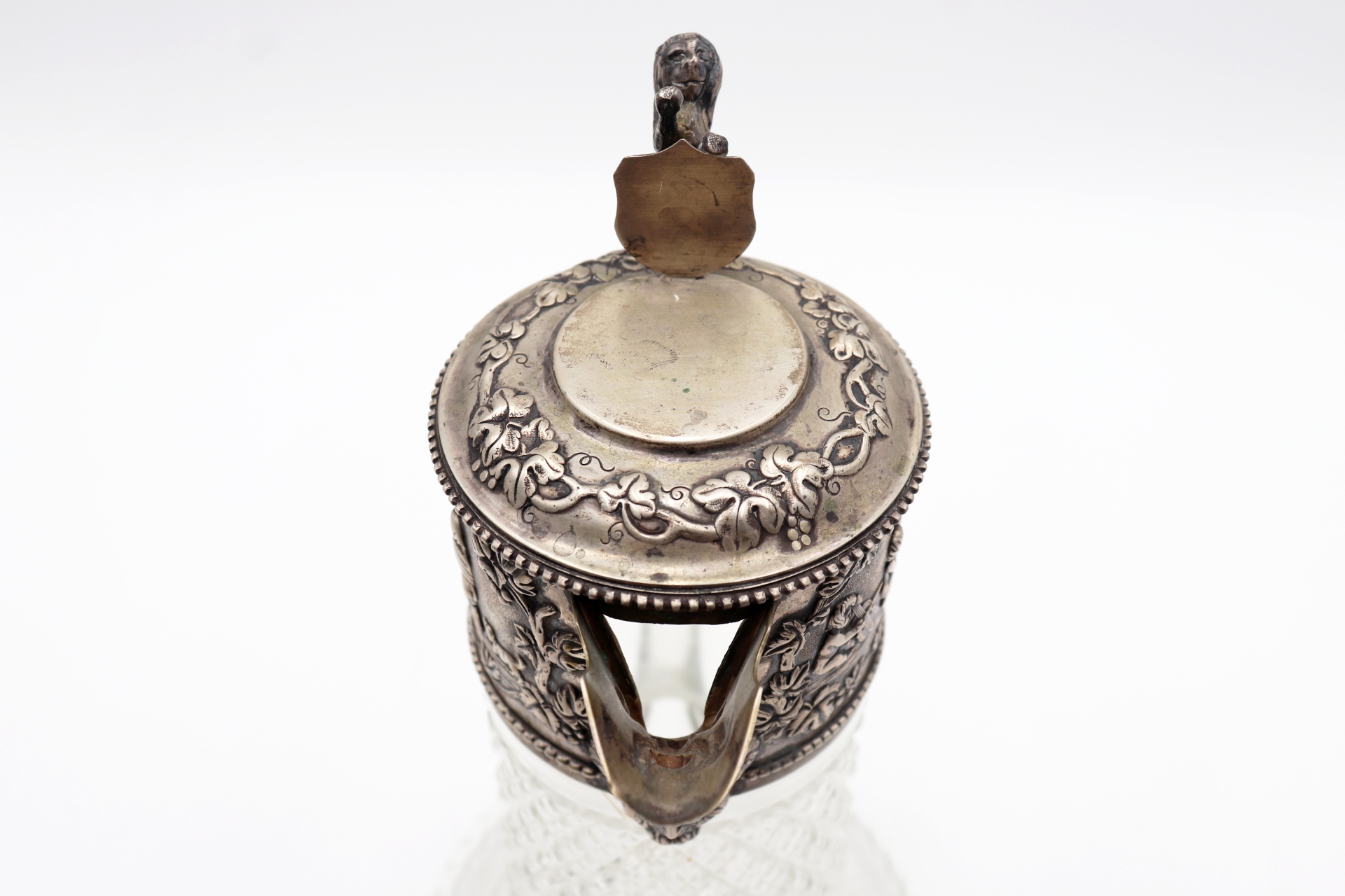 Jarro de vinho em vidro lapidado com aplicações de prata em alto relevo na tampa