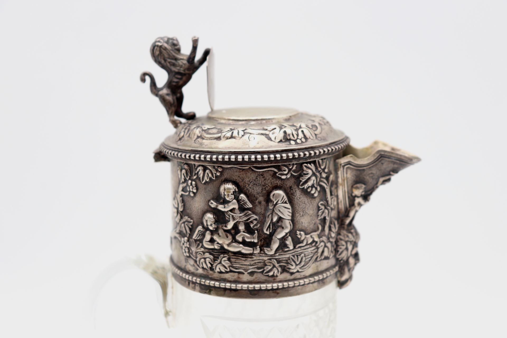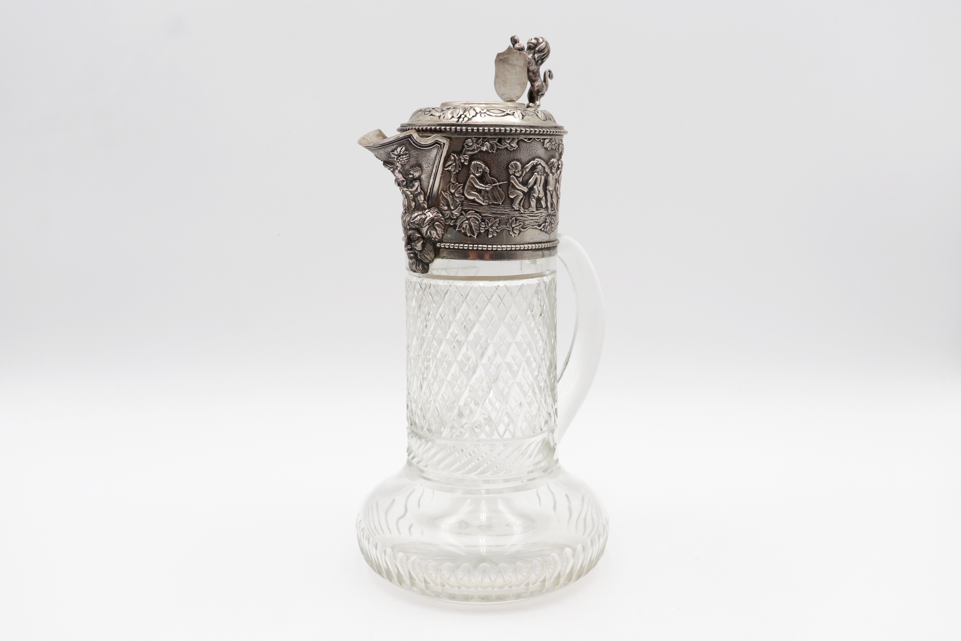 • Descrição: Jarro de vinho em vidro lapidado com aplicações de prata em alto relevo na tampa e figura de leão em vulto perfeito na tampa basculante.