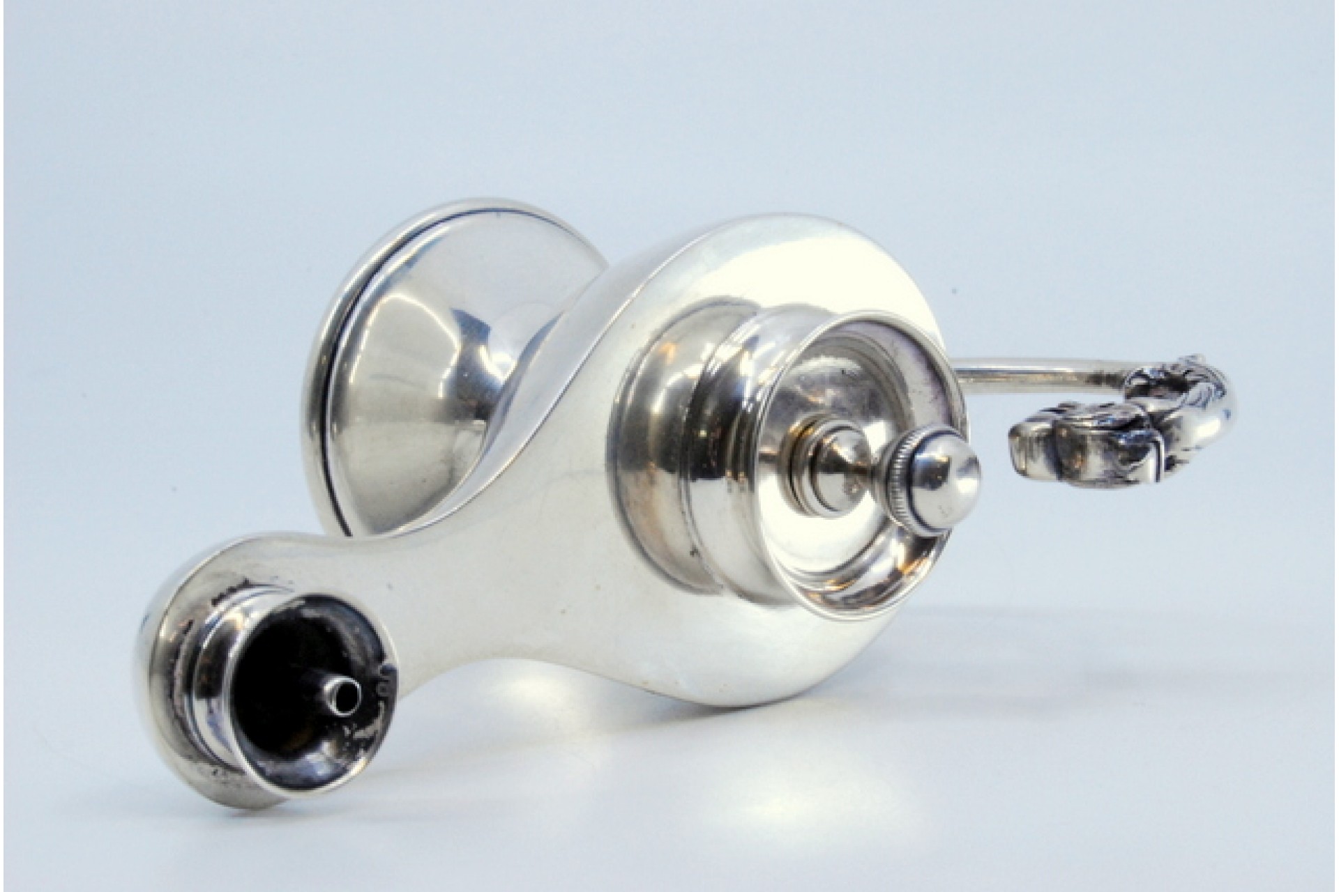 Lamparina em prata lisa com aplicação em relevo e cabeça de animal no cabo.