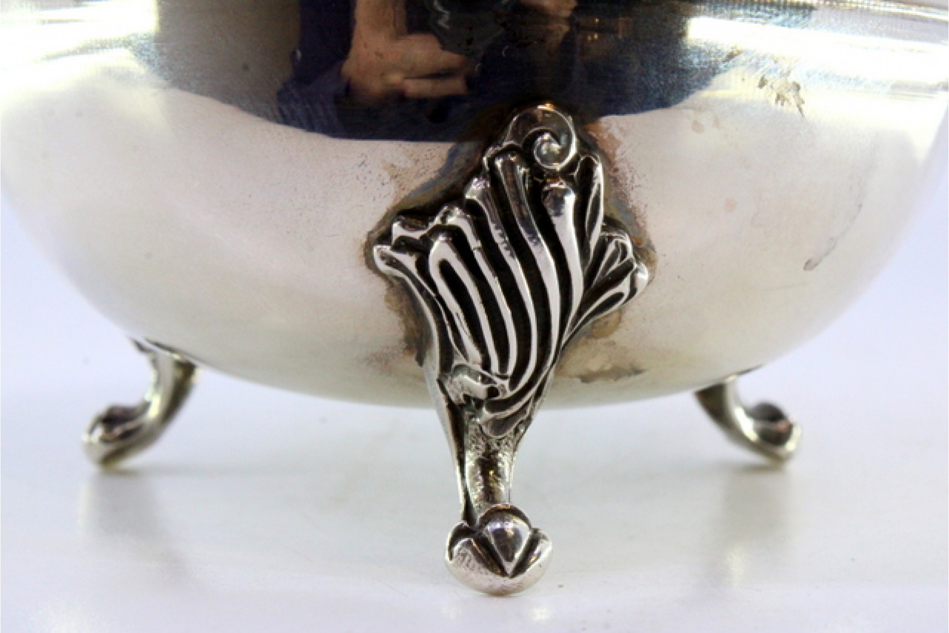 Lavabo em prata liso com relevos no rebordo e assente em três pés em forma de garras.