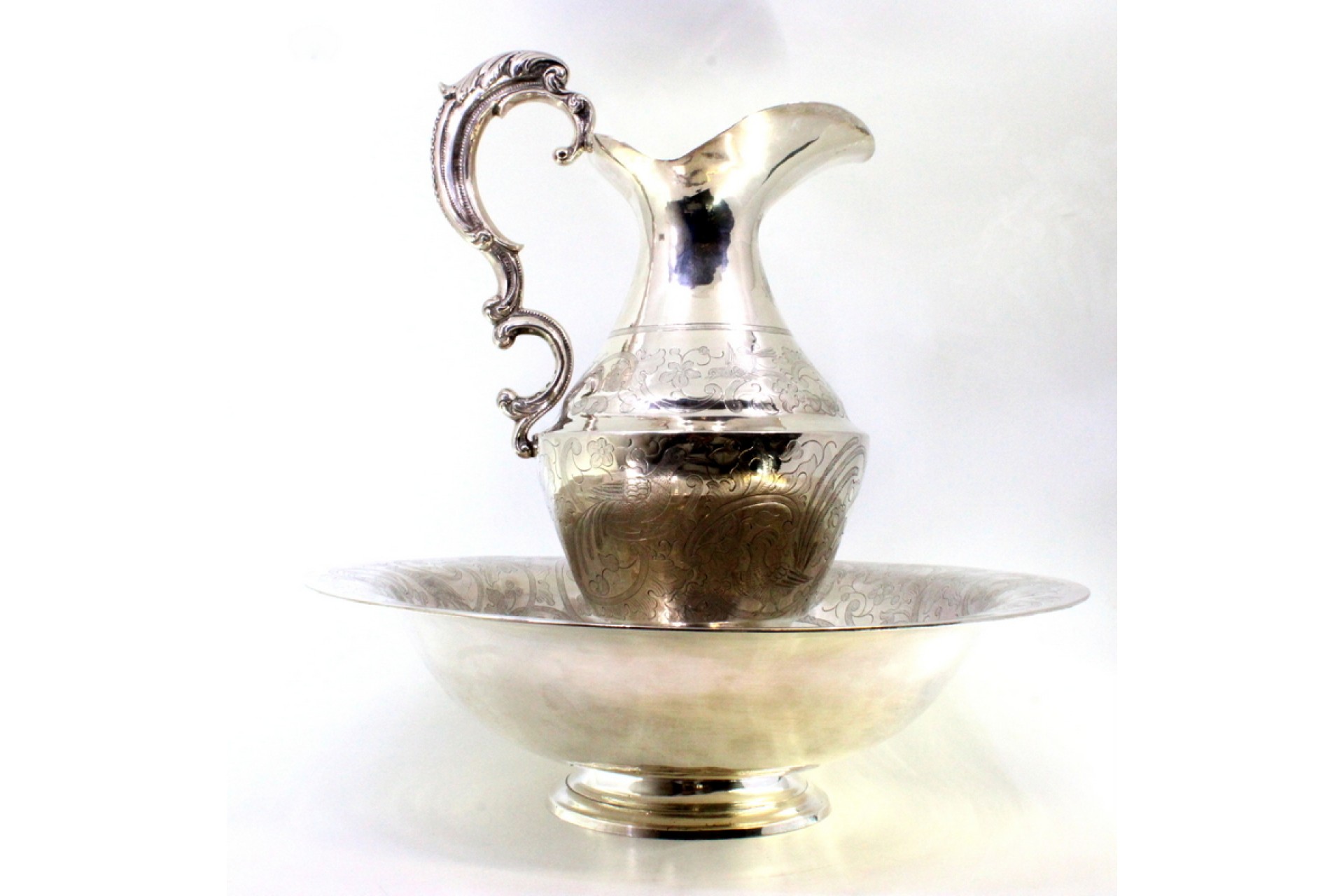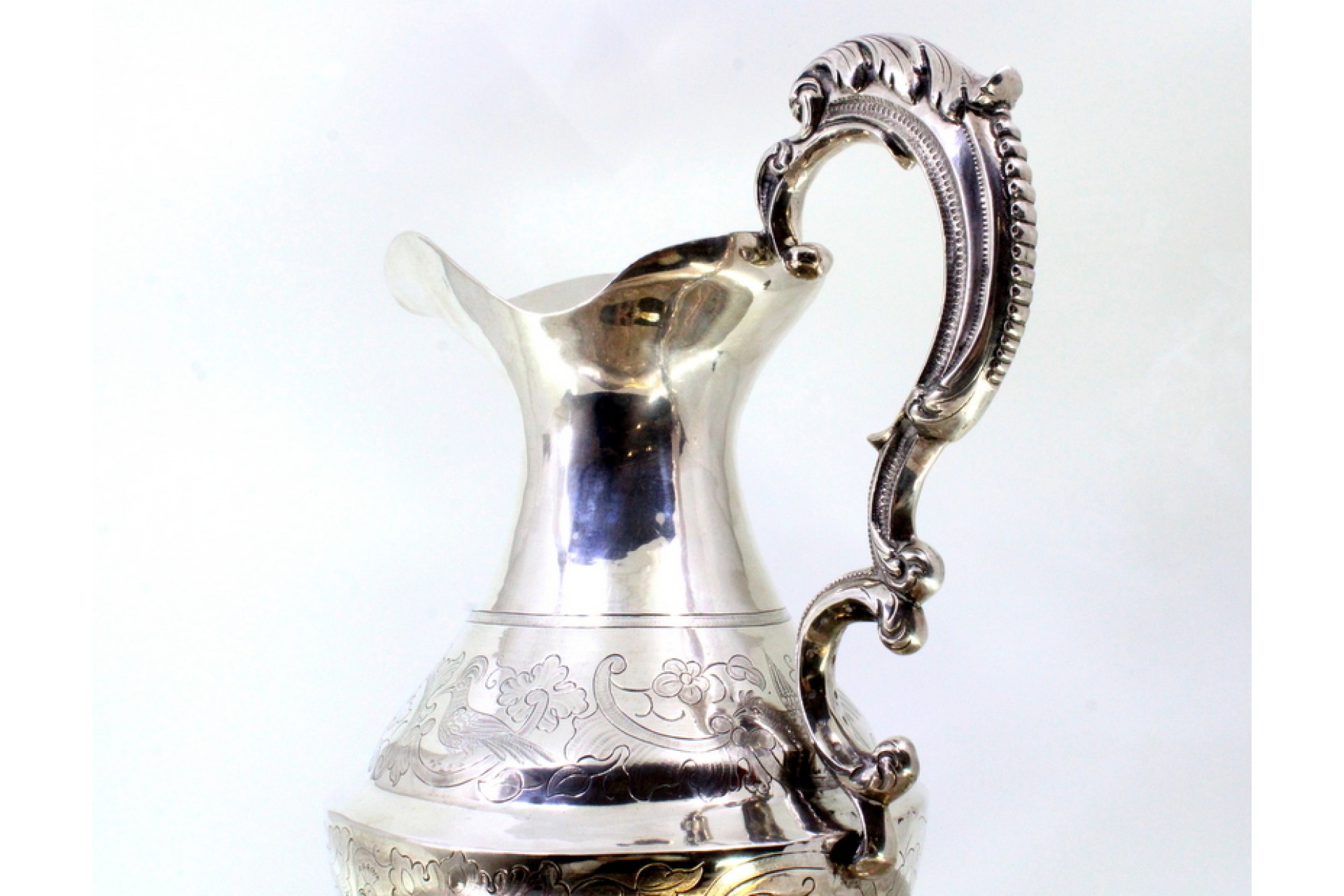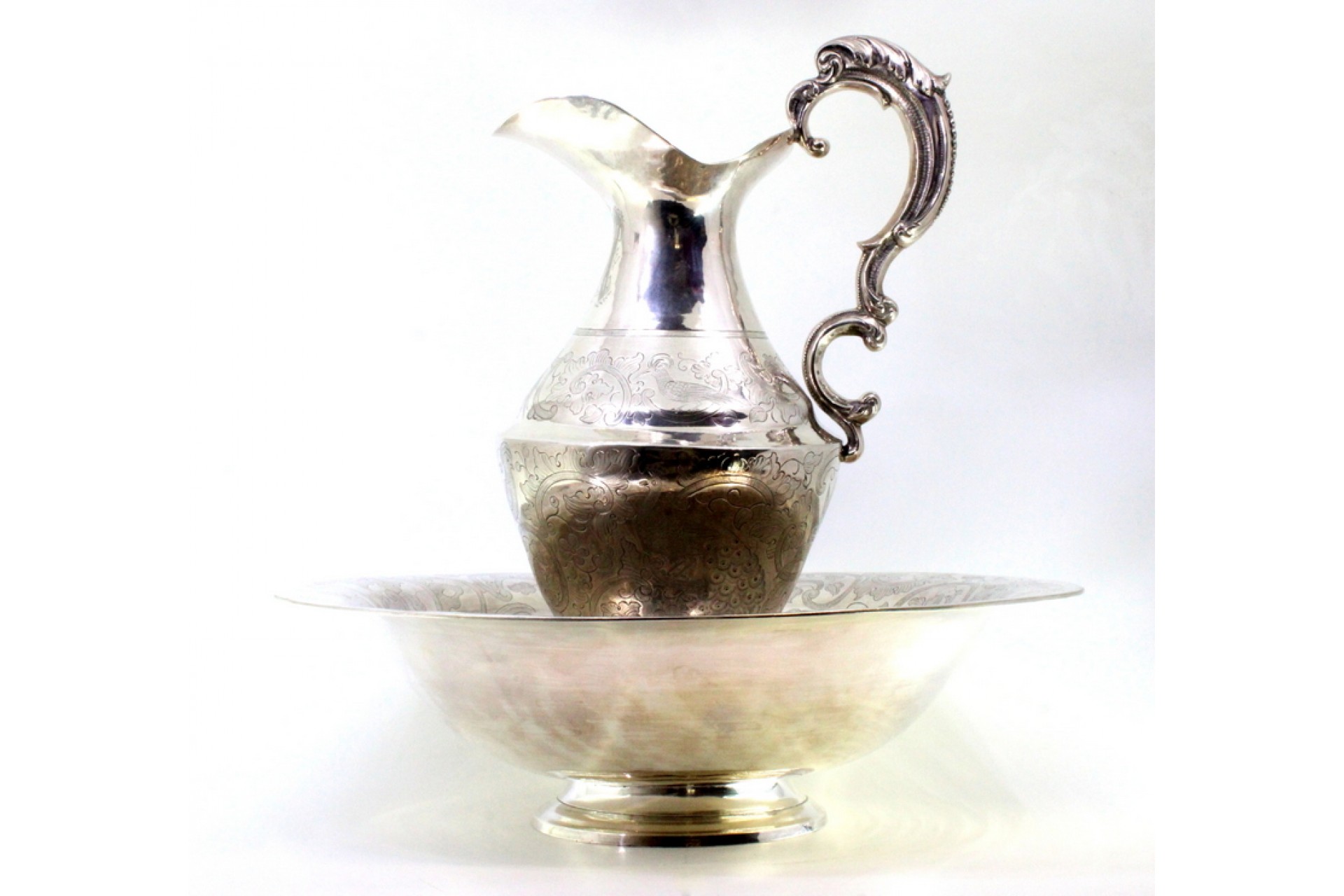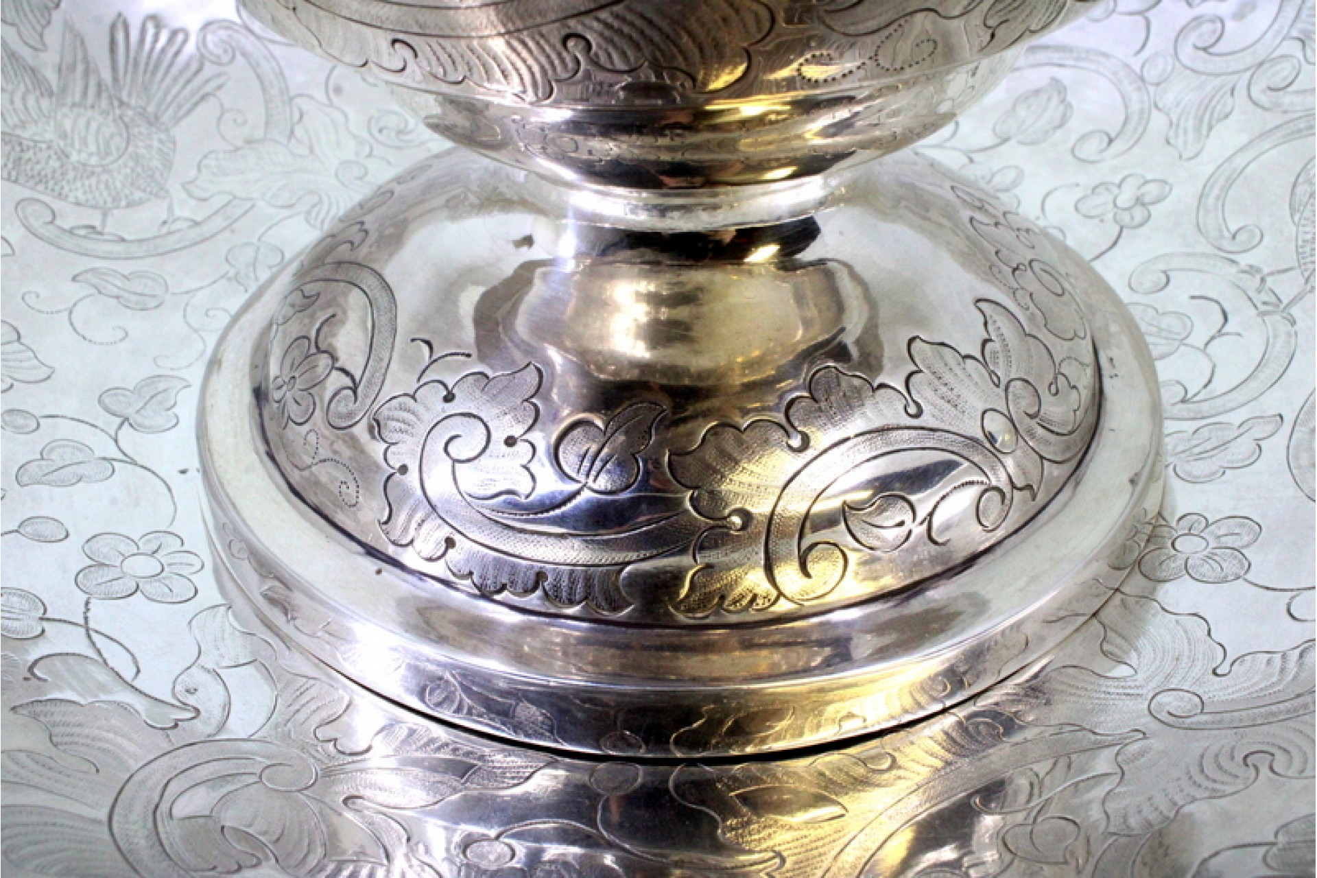 Lavanda e gomil em prata com gravados de pavões, pega com relevos e aplicações.