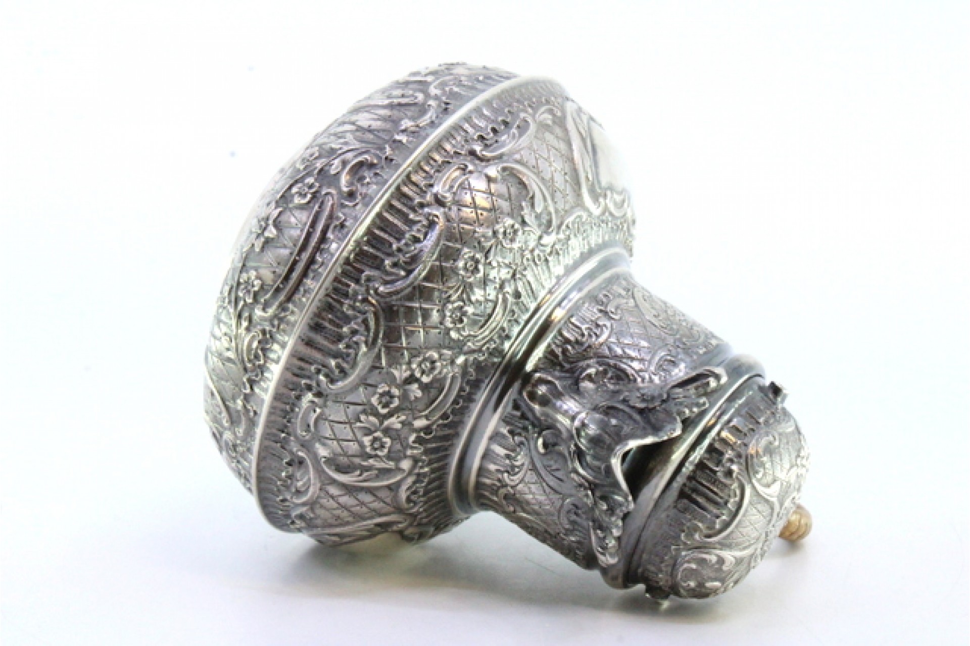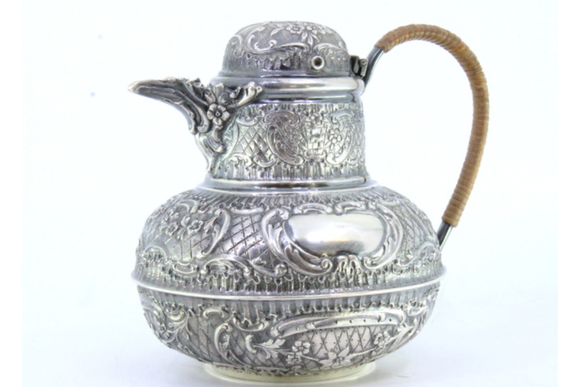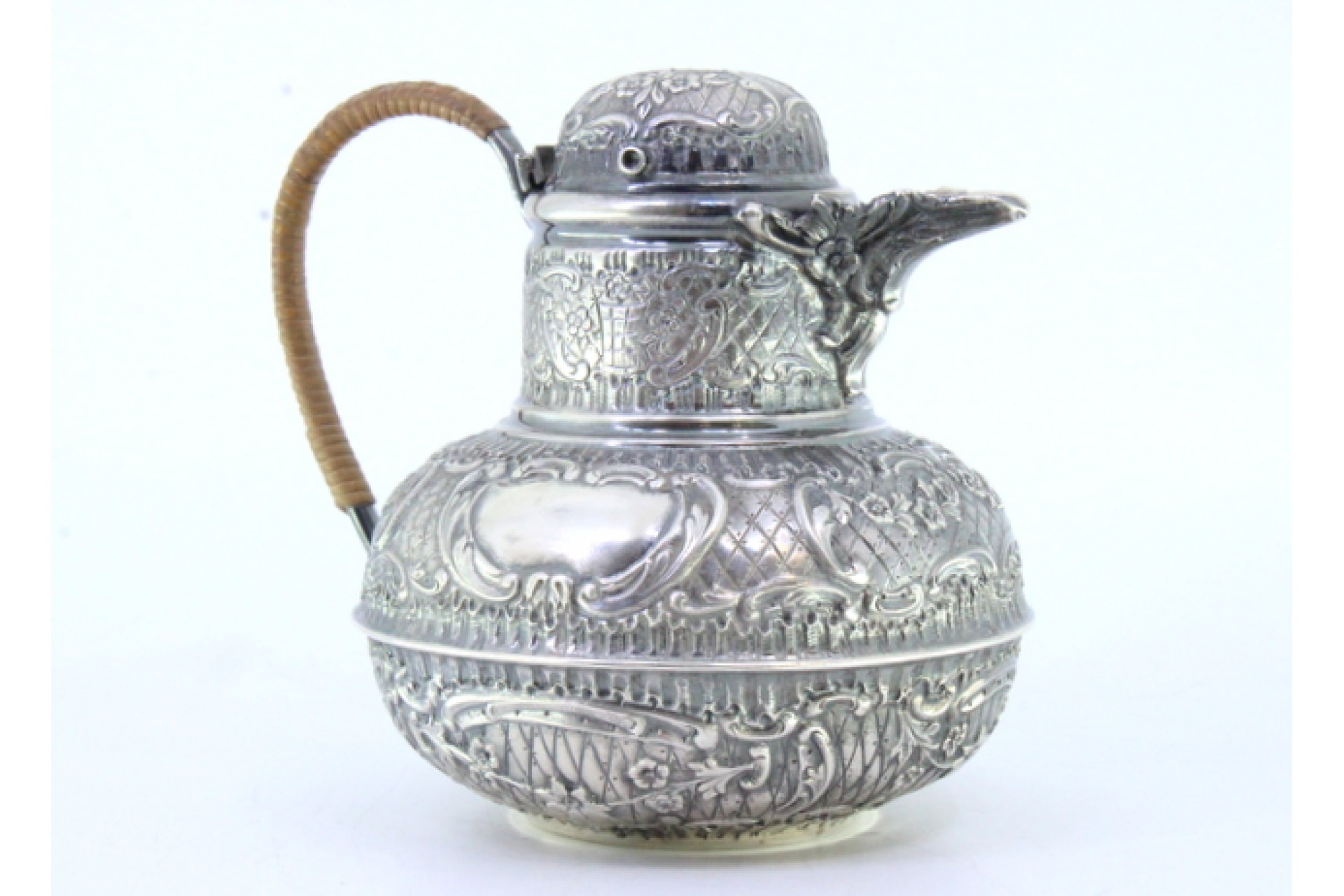 • Descrição: Leiteira bojuda em prata com relevos envolvendo cartela para monograma e asa empalhada.