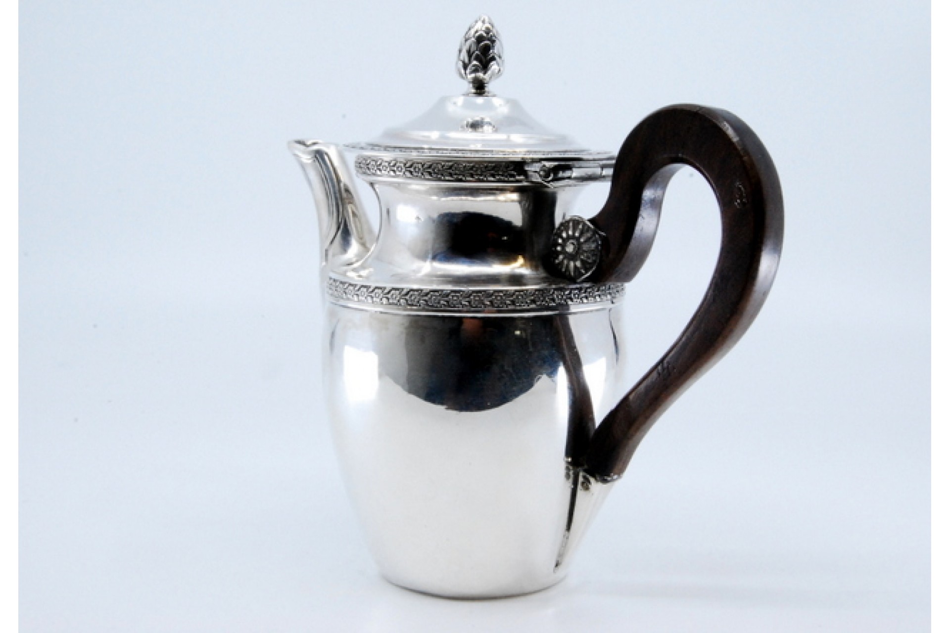 Bule em prata com motivos vegetalistas gravados, pega em madeira e pomo na tampa basculante