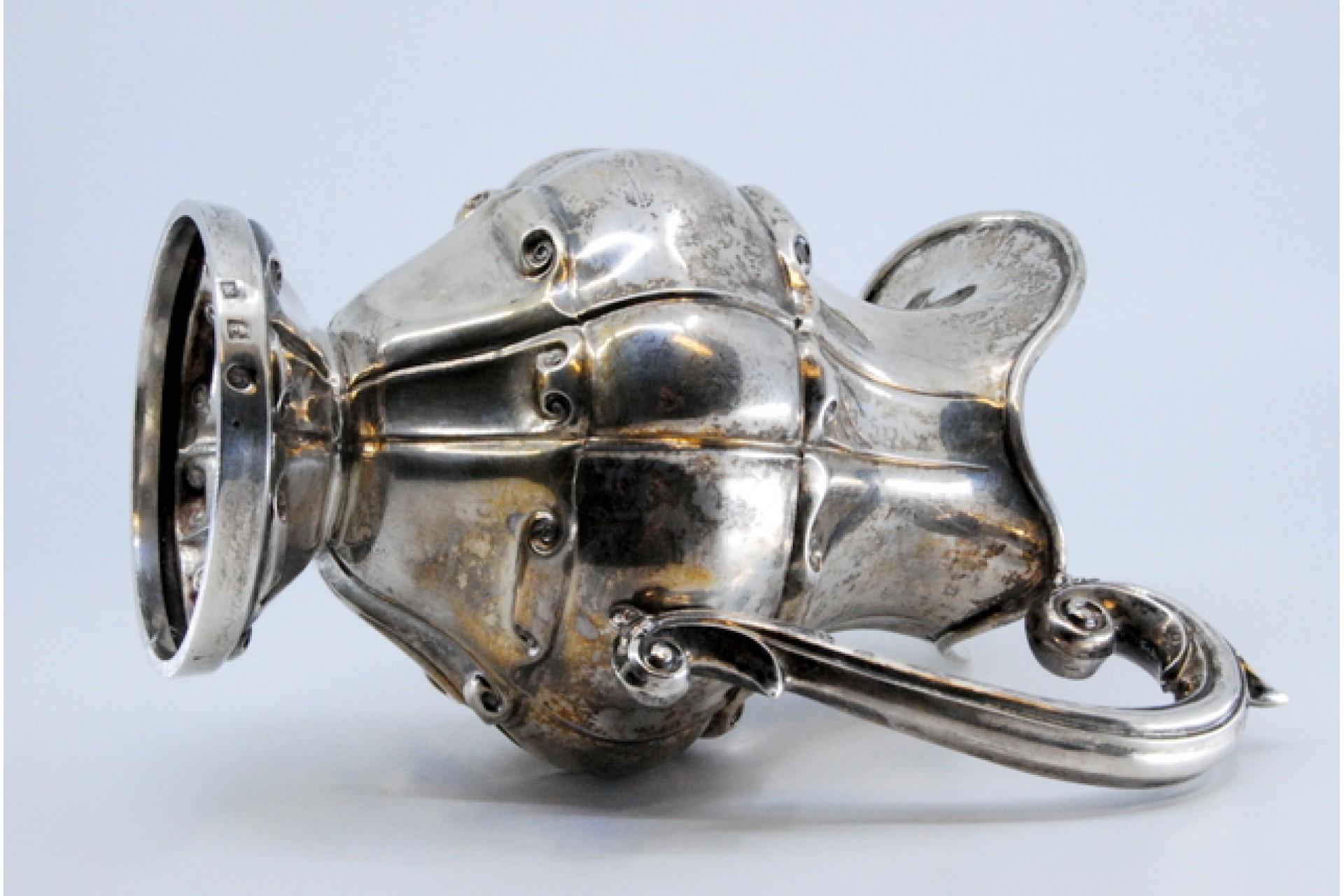 • Descrição: Leiteira em prata gomada com enrolamentos relevados e base em formato circular.