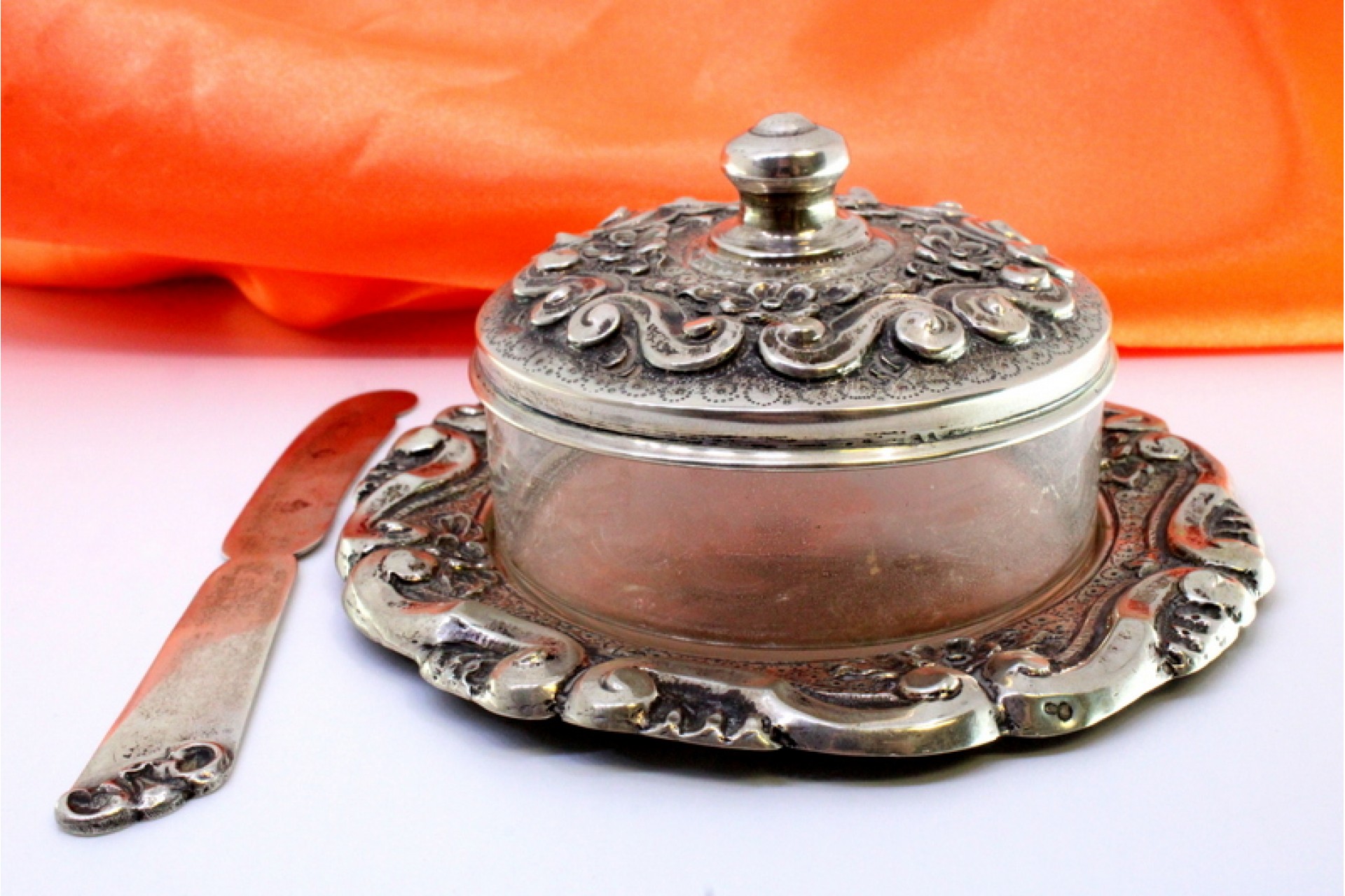 Etiquetas: Manteigueira, Prata, Relevo, Vidro, Faca