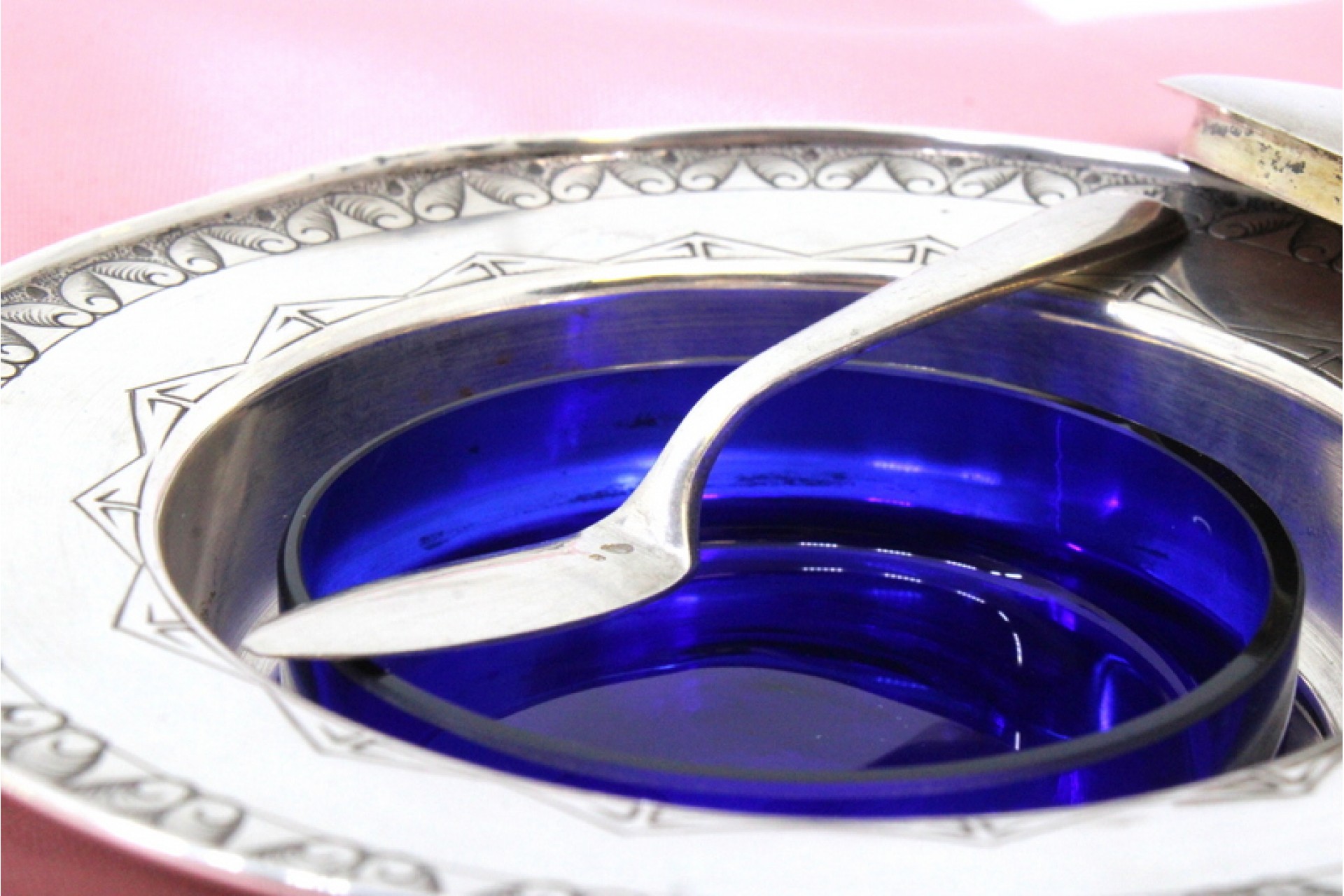 Manteigueira em prata com gravados na envolvência, alma em vidro azul
