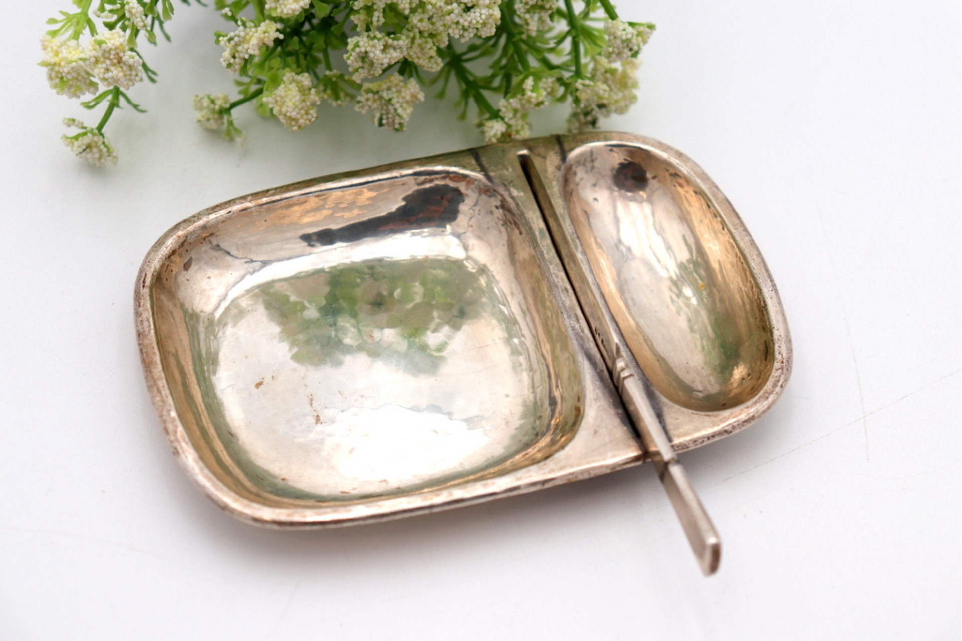 • Descrição: Manteigueira em prata martelada com dois depósitos e faca.