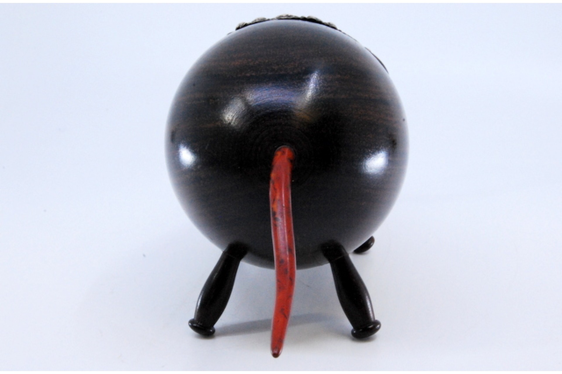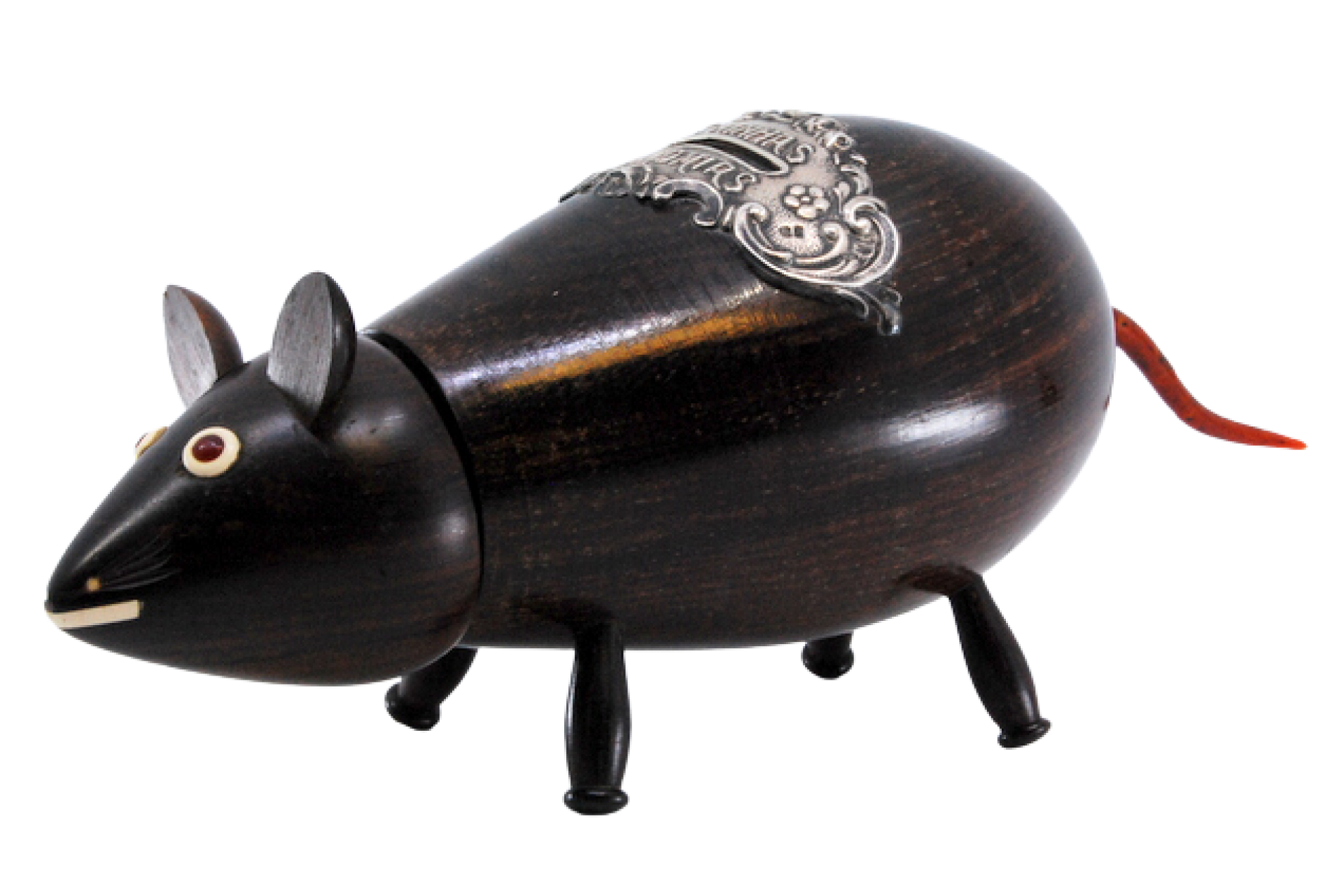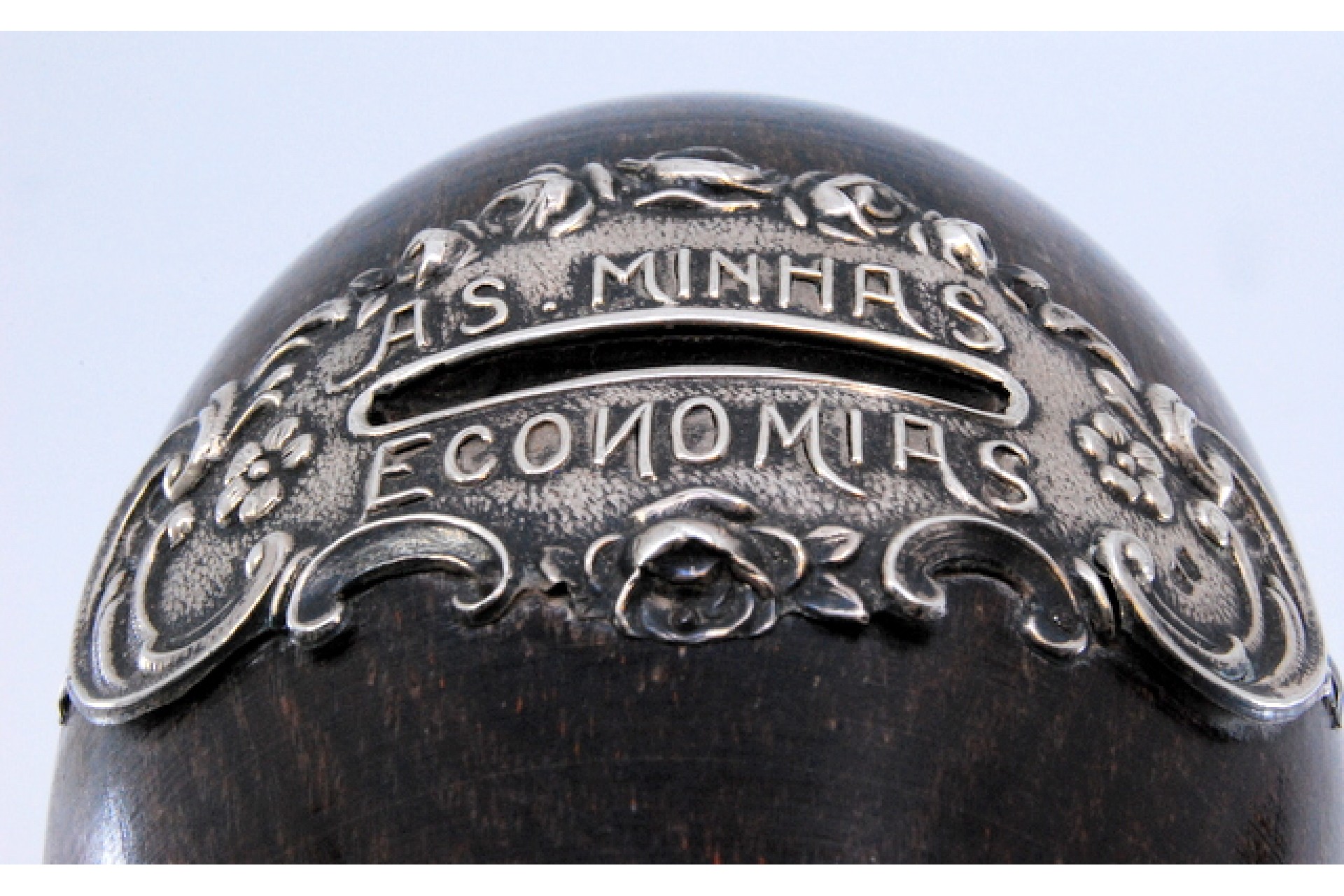 • Descrição: Mealheiro em pau santo em forma de rato com aplicações em prata e a frase "As minhas ecónomias"
