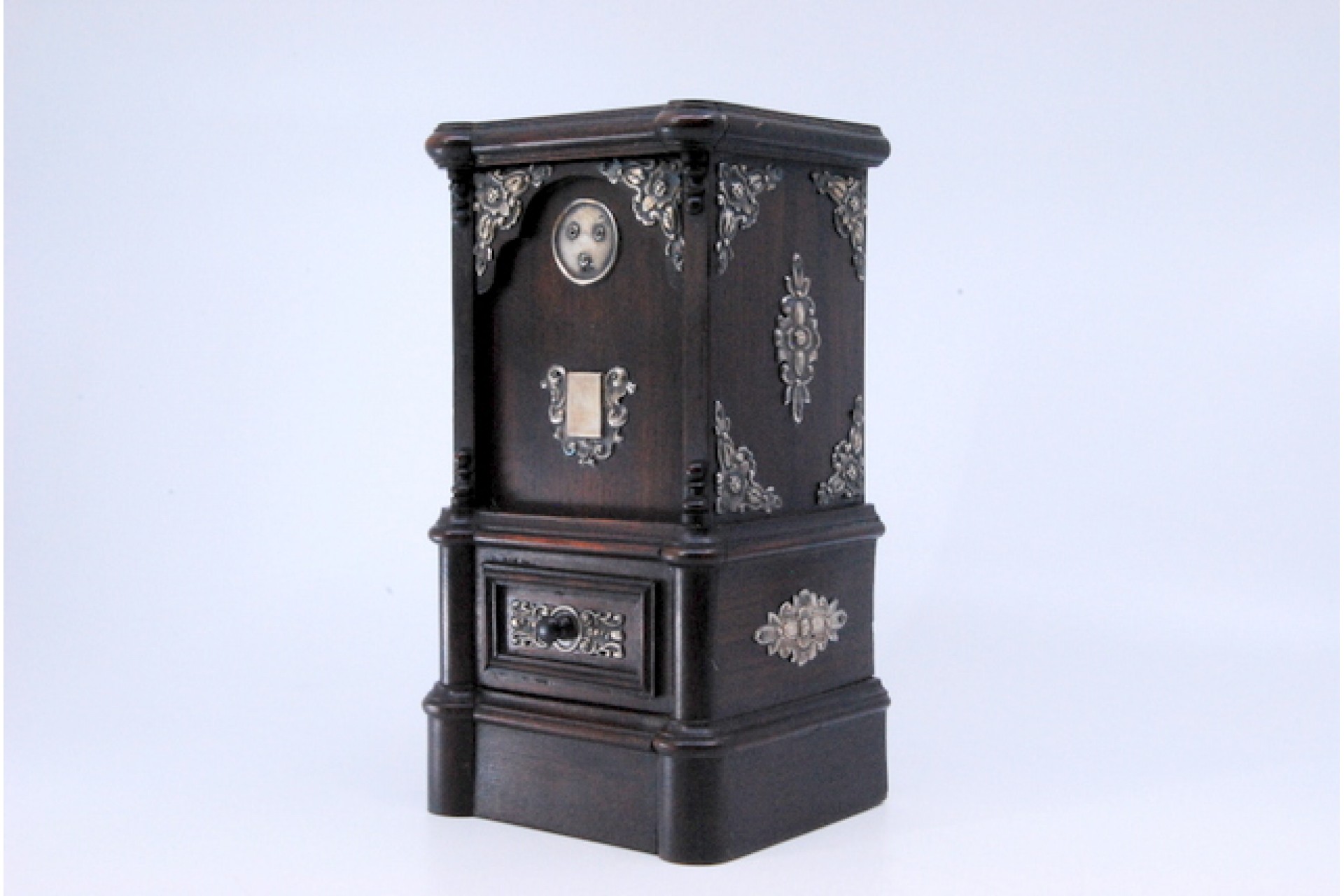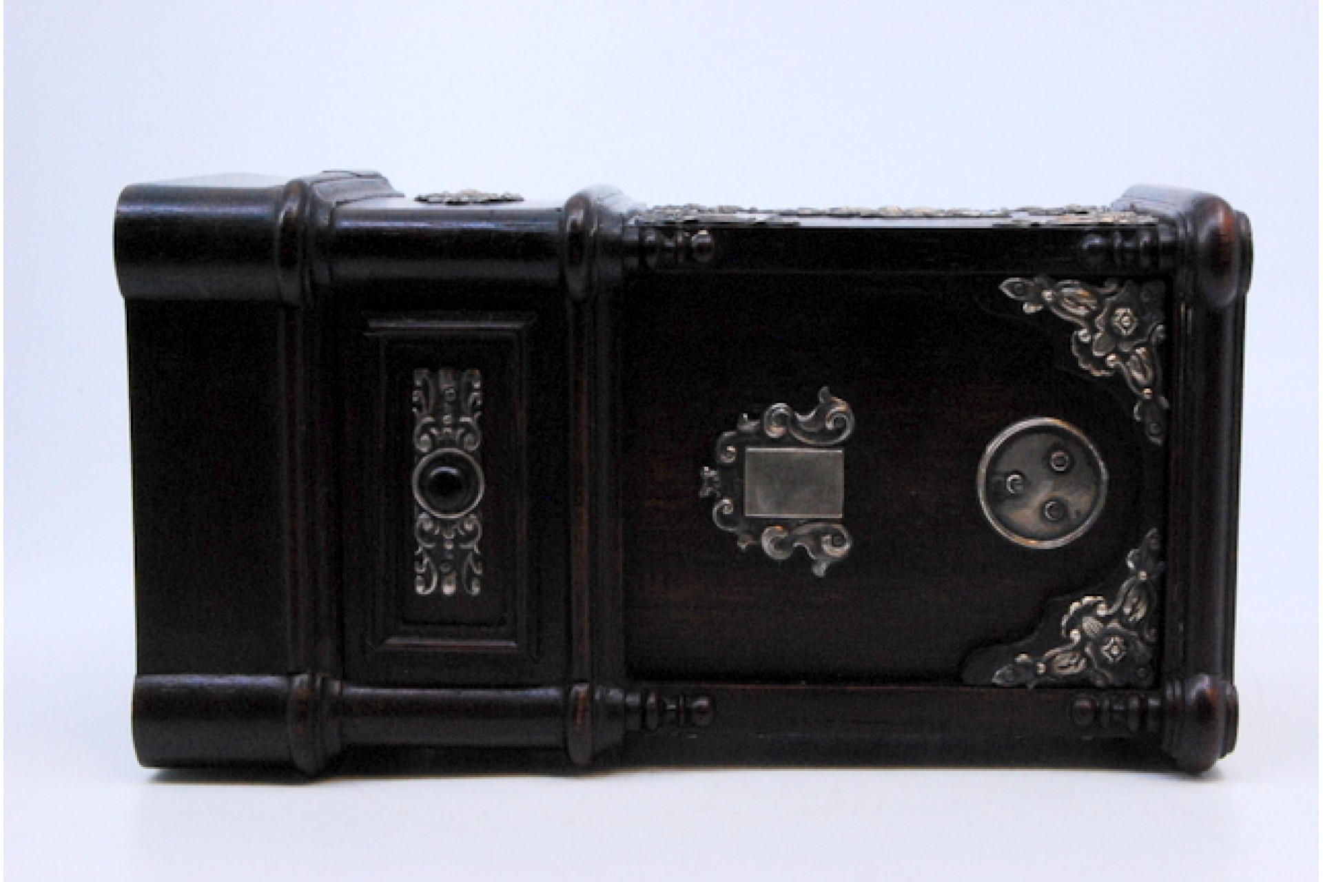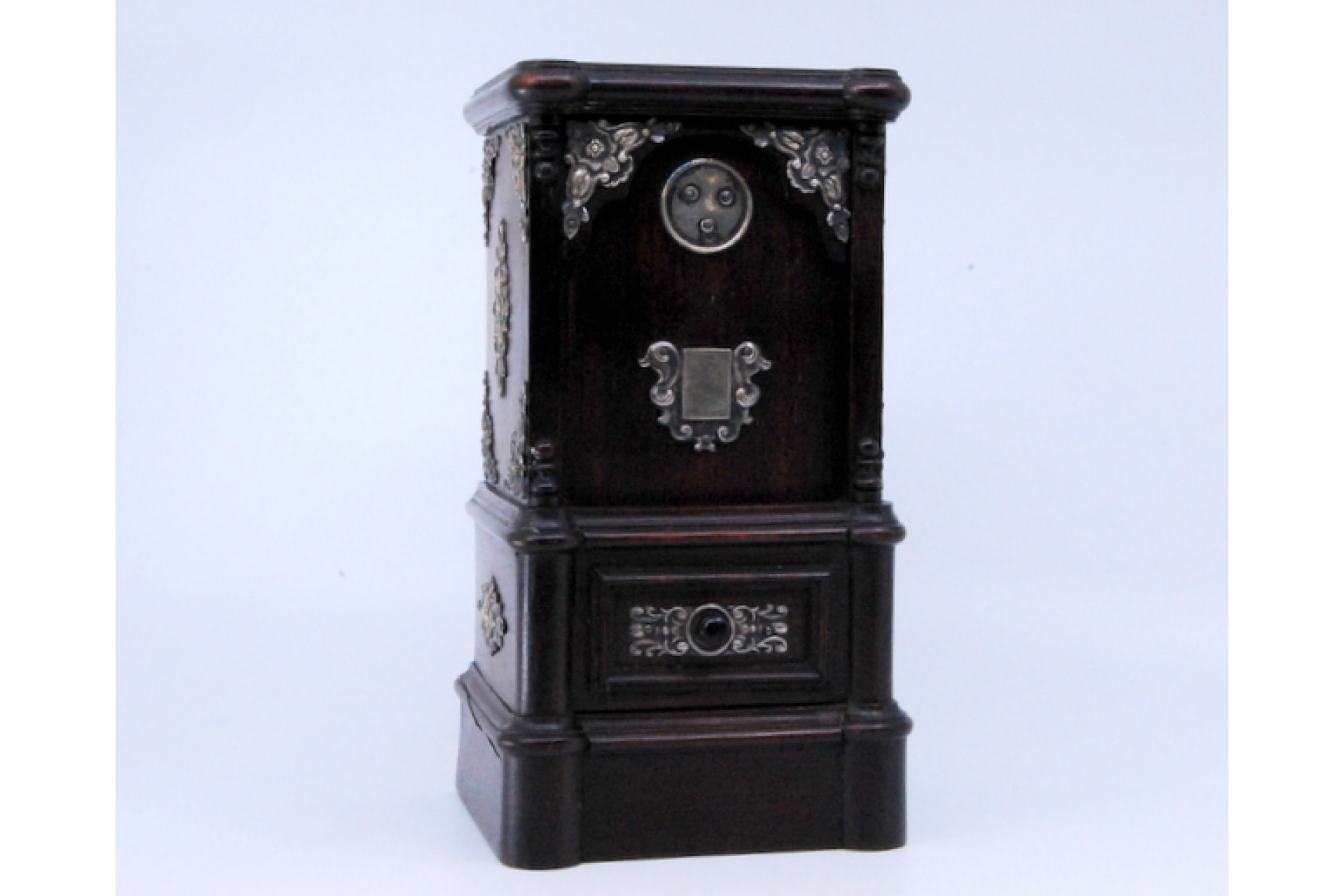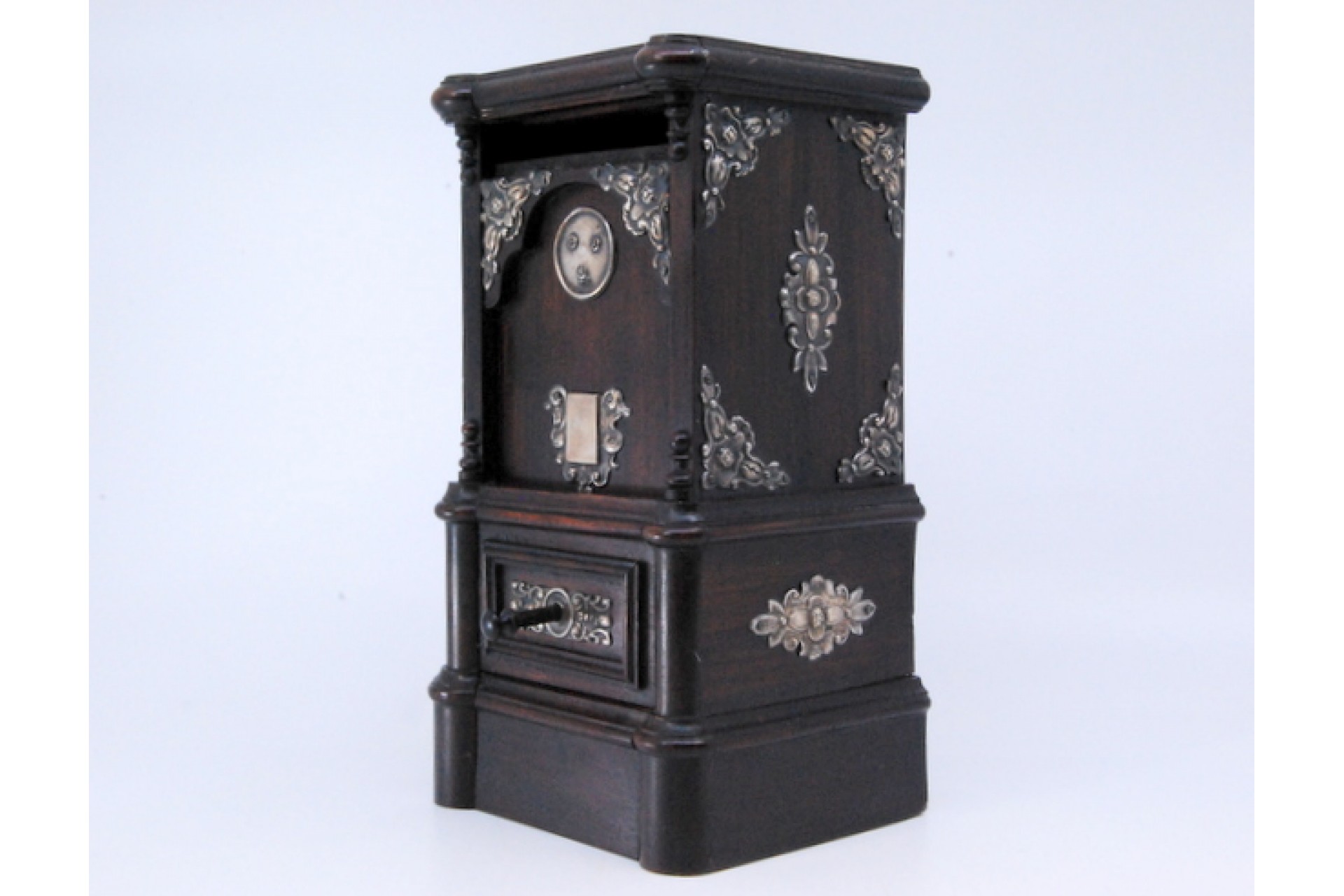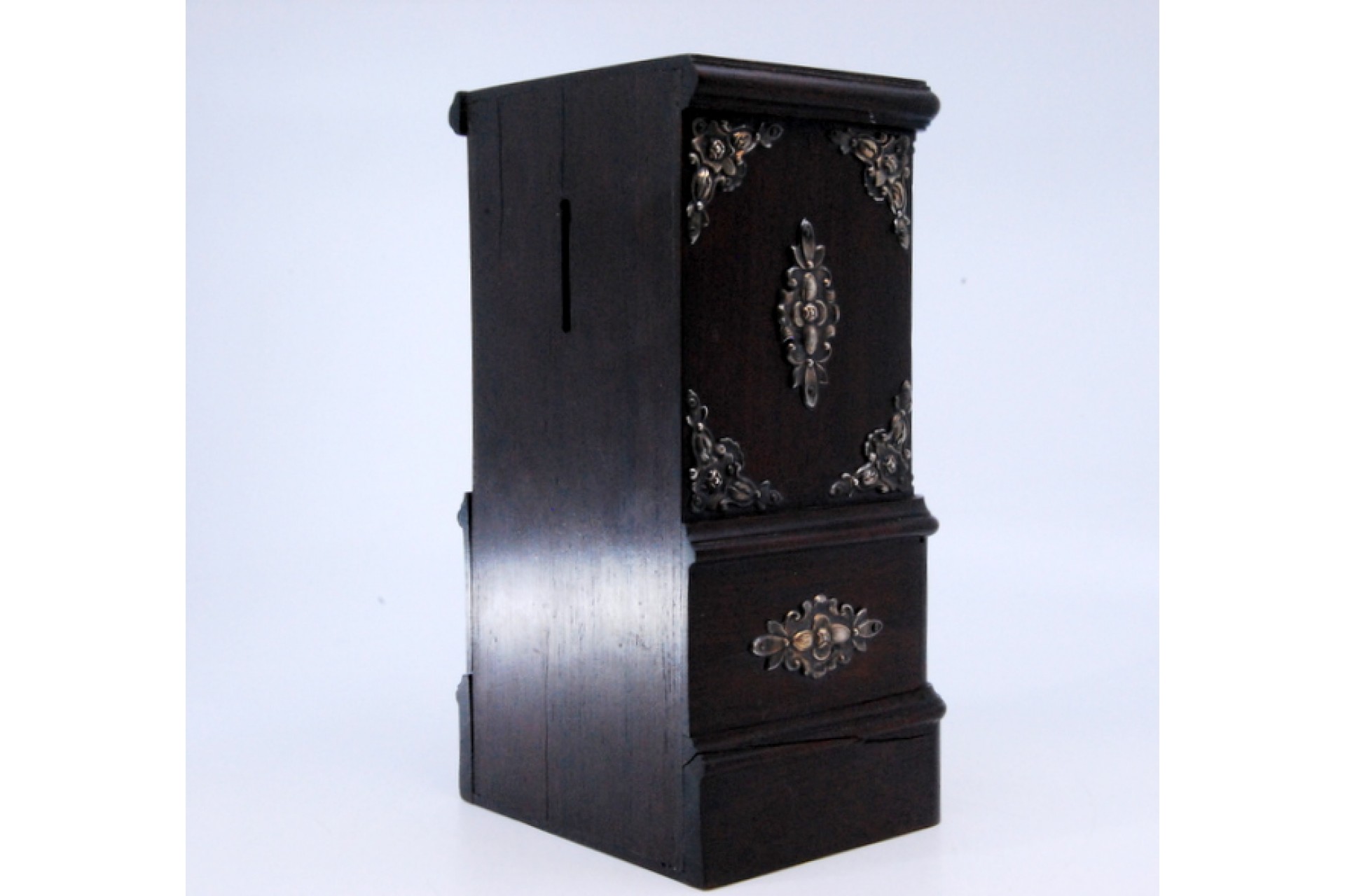 • Descrição: Mealheiro em pau santo com aplicações em prata.