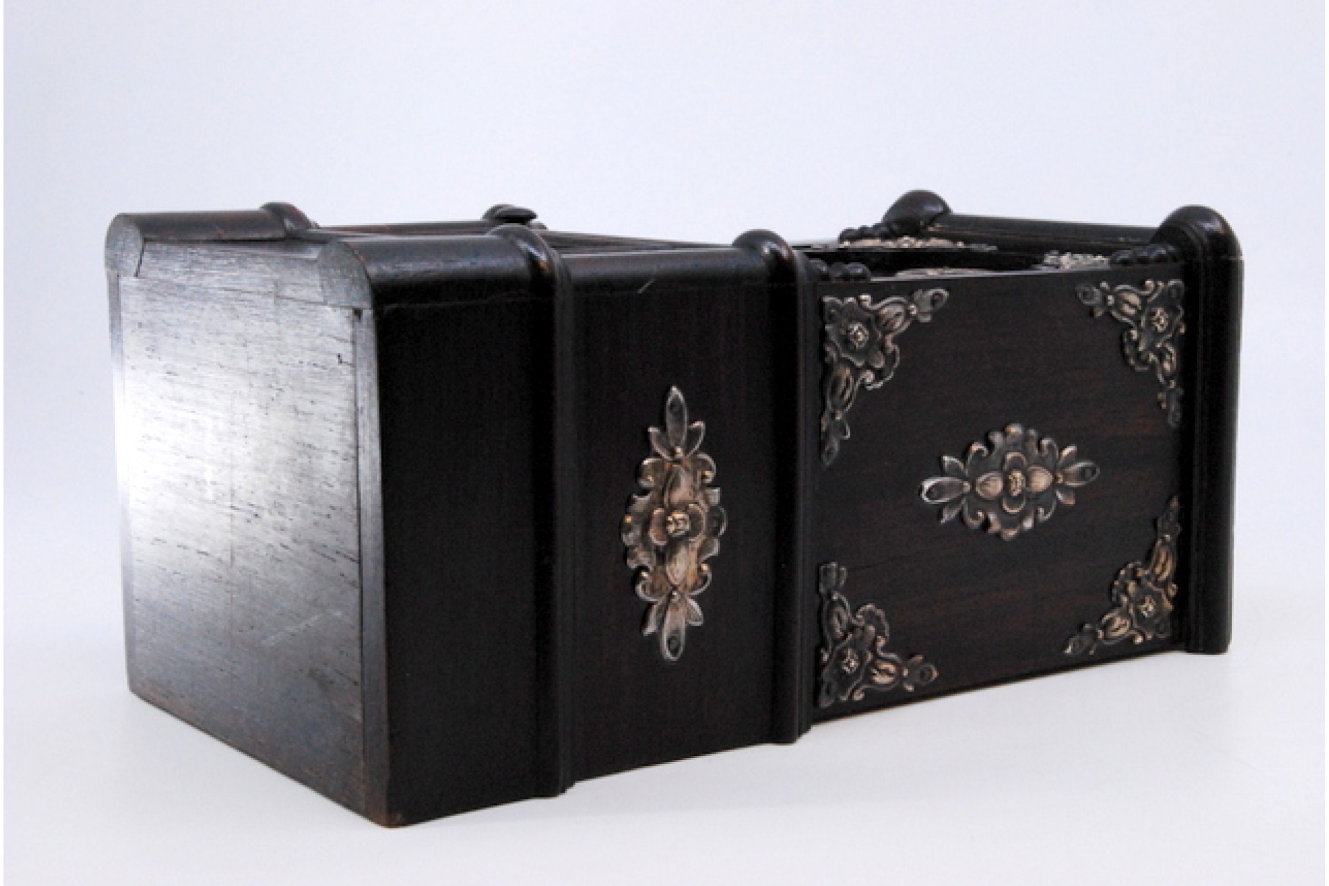 Mealheiro em pau santo com aplicações em prata.
