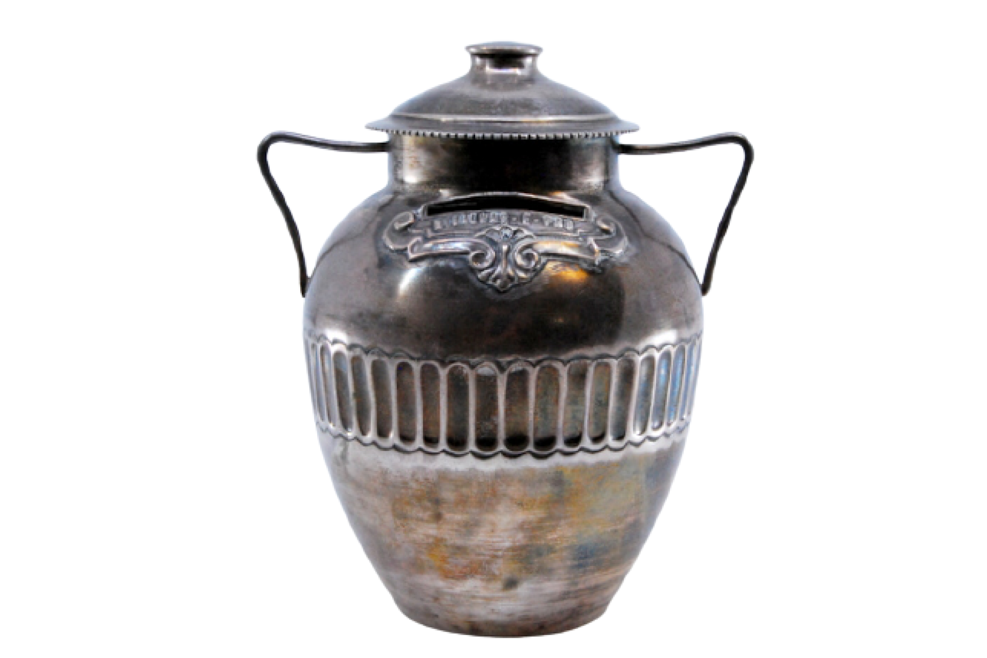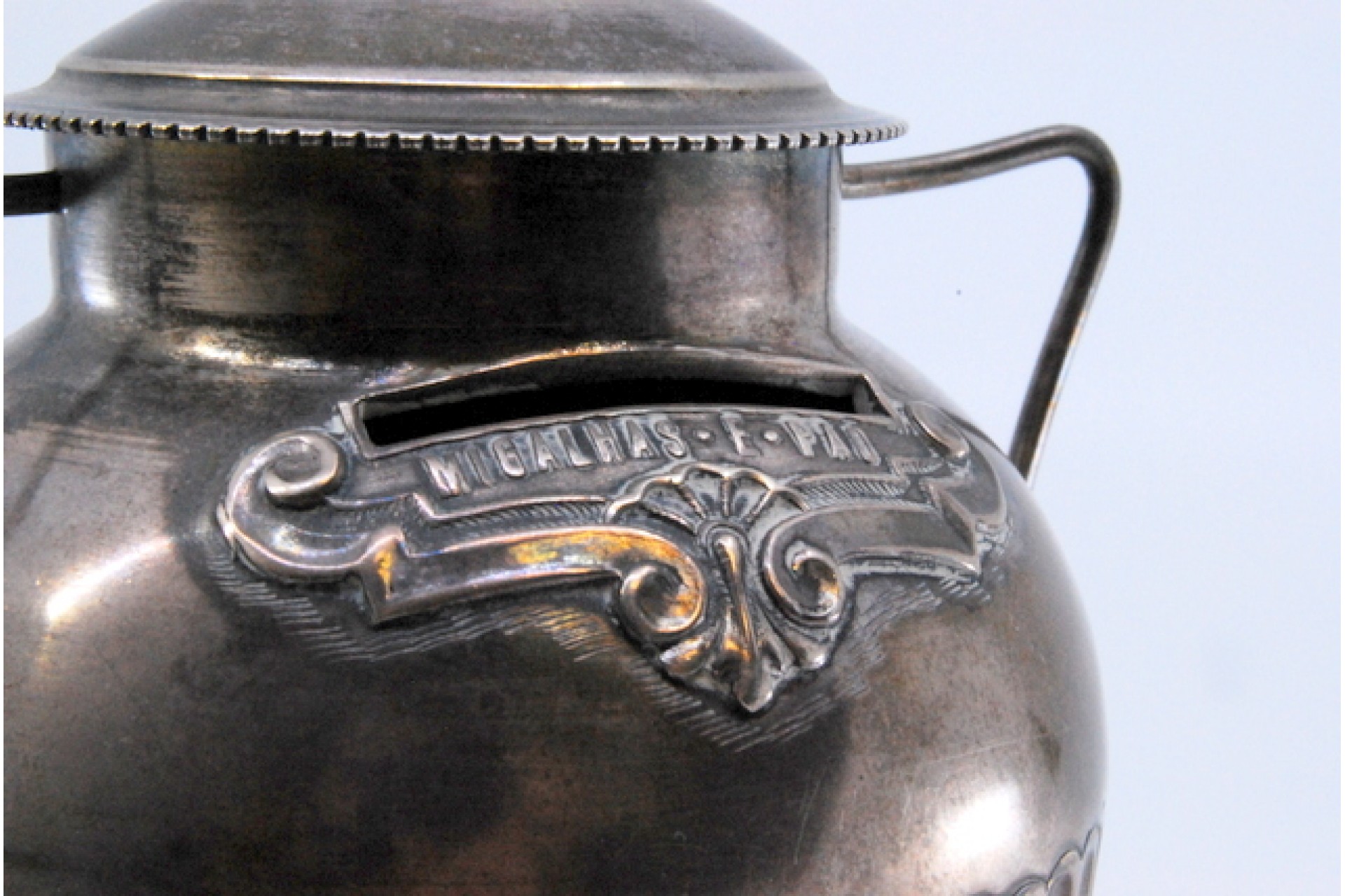 • Descrição: Mealheiro em prata com pegas lisas e finas, relevado com frase "Migalhas é pão".