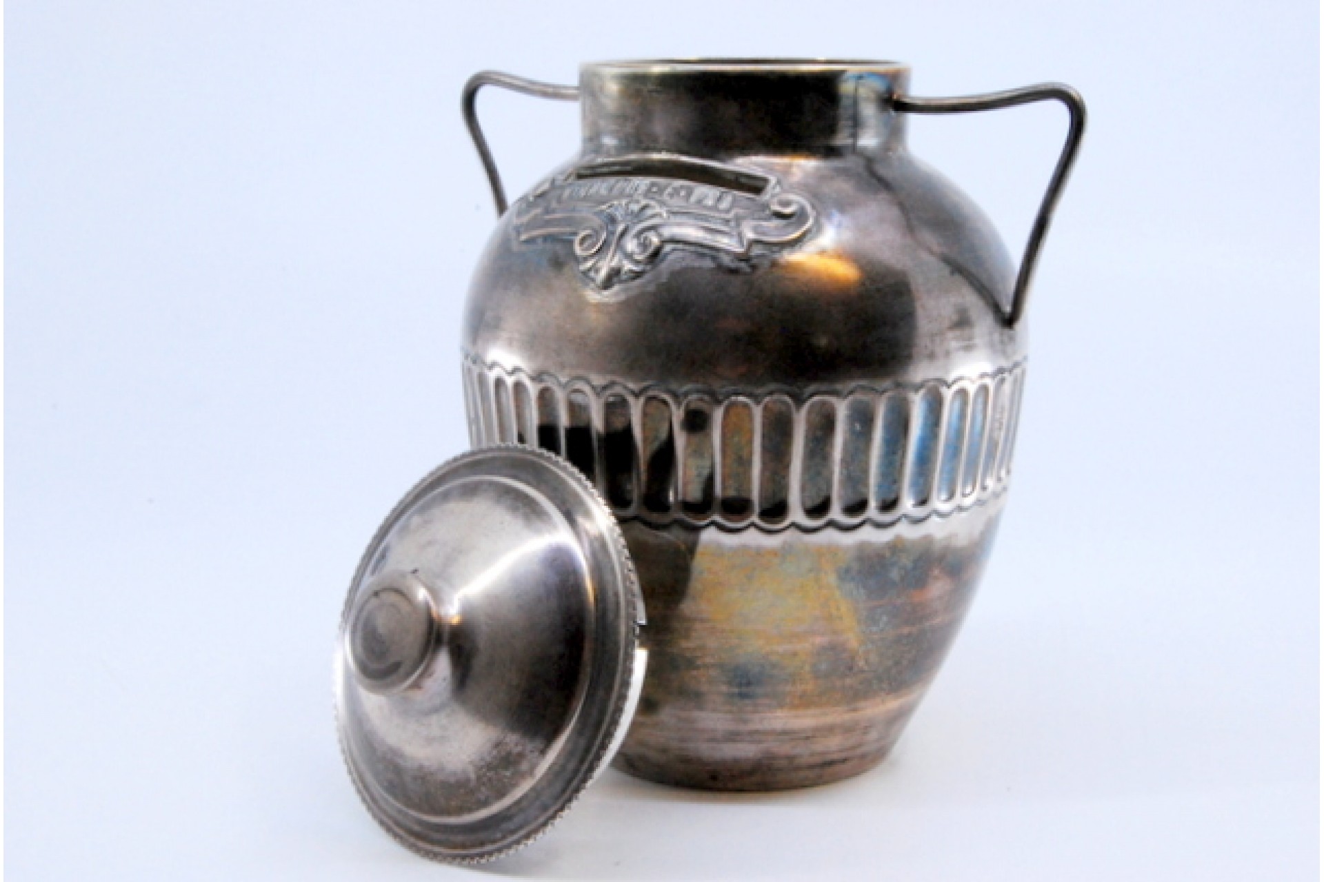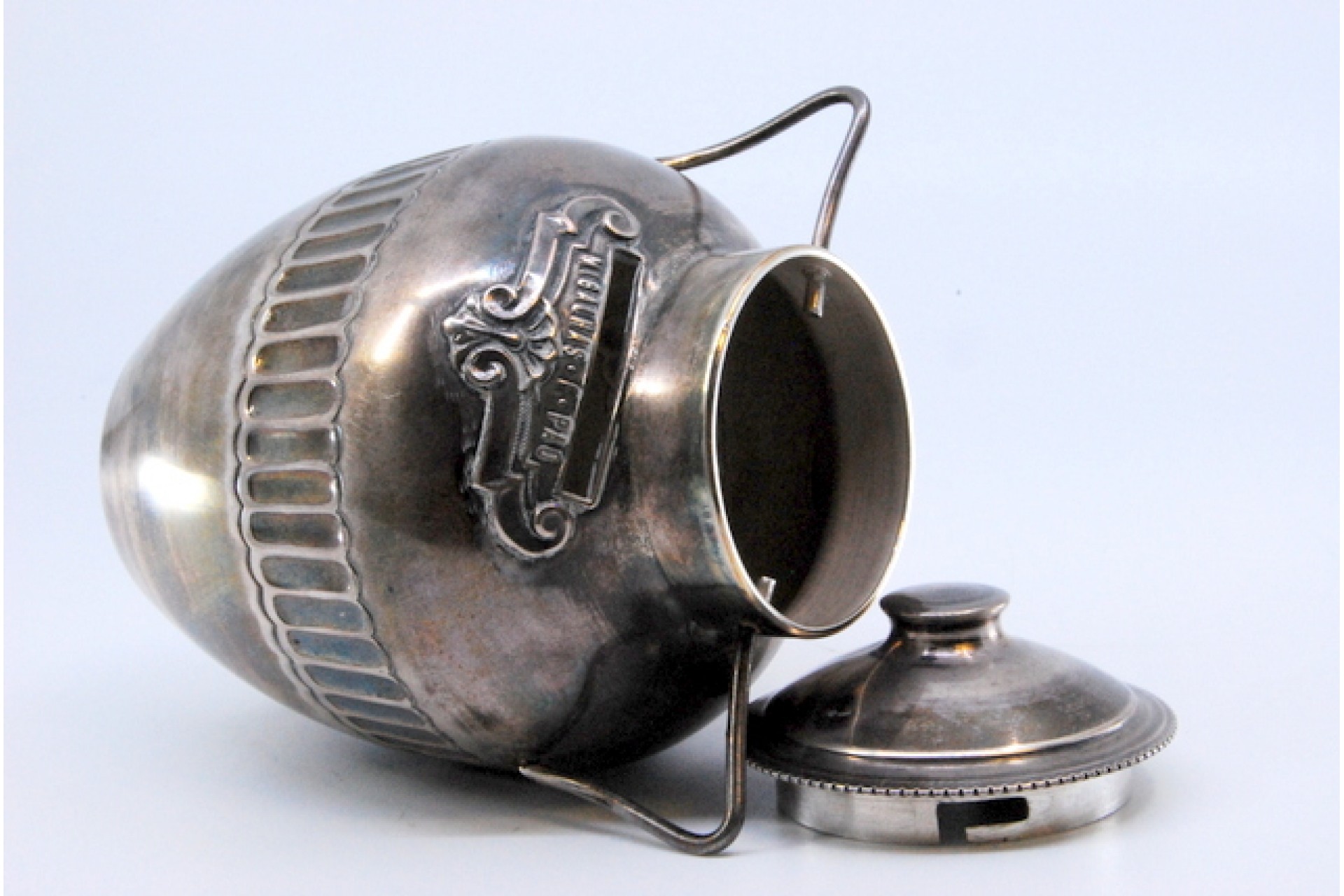 Mealheiro em prata com pegas lisas e finas, relevado com frase "Migalhas é pão".