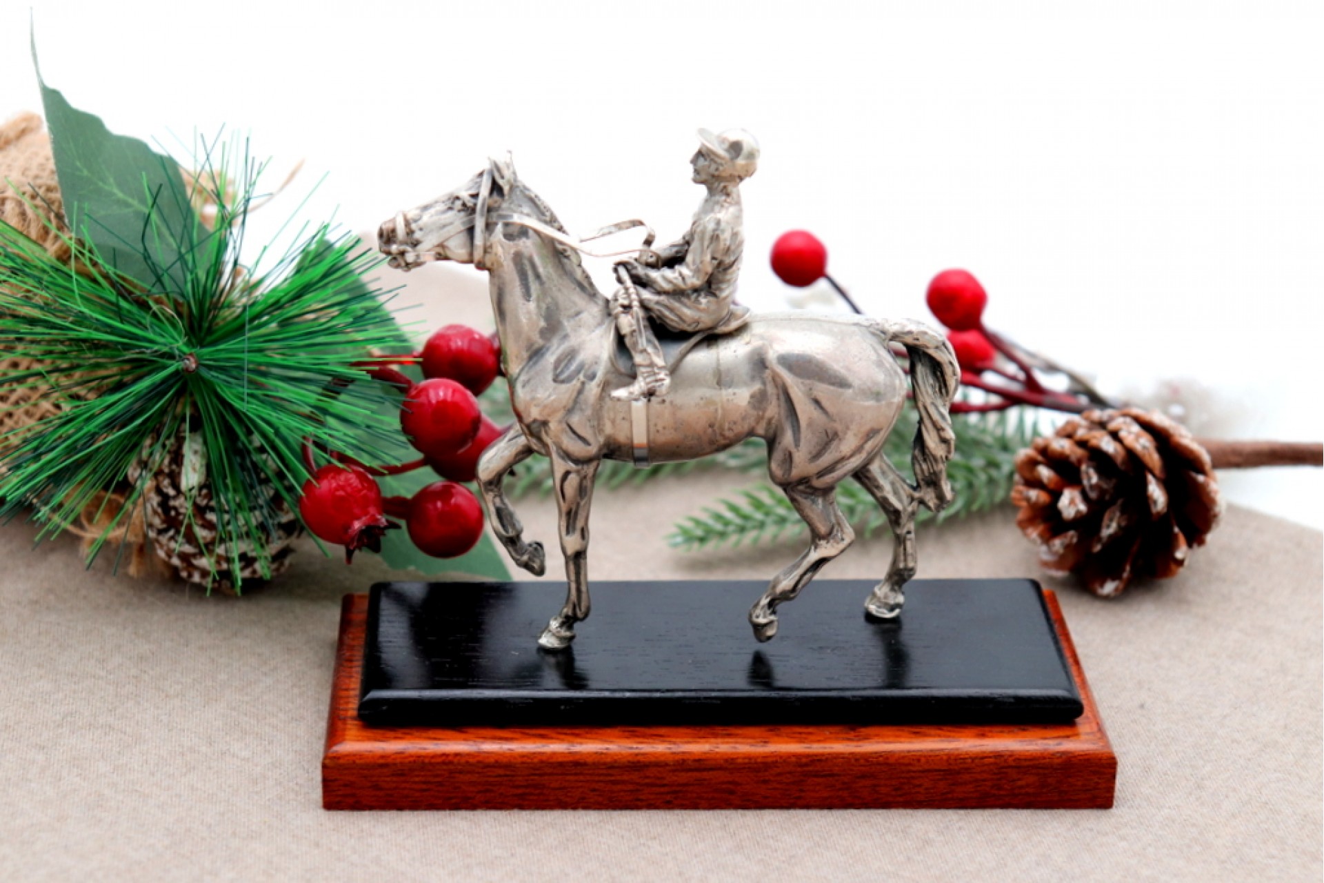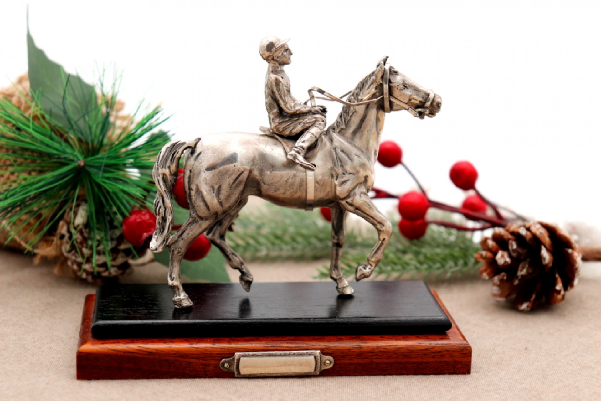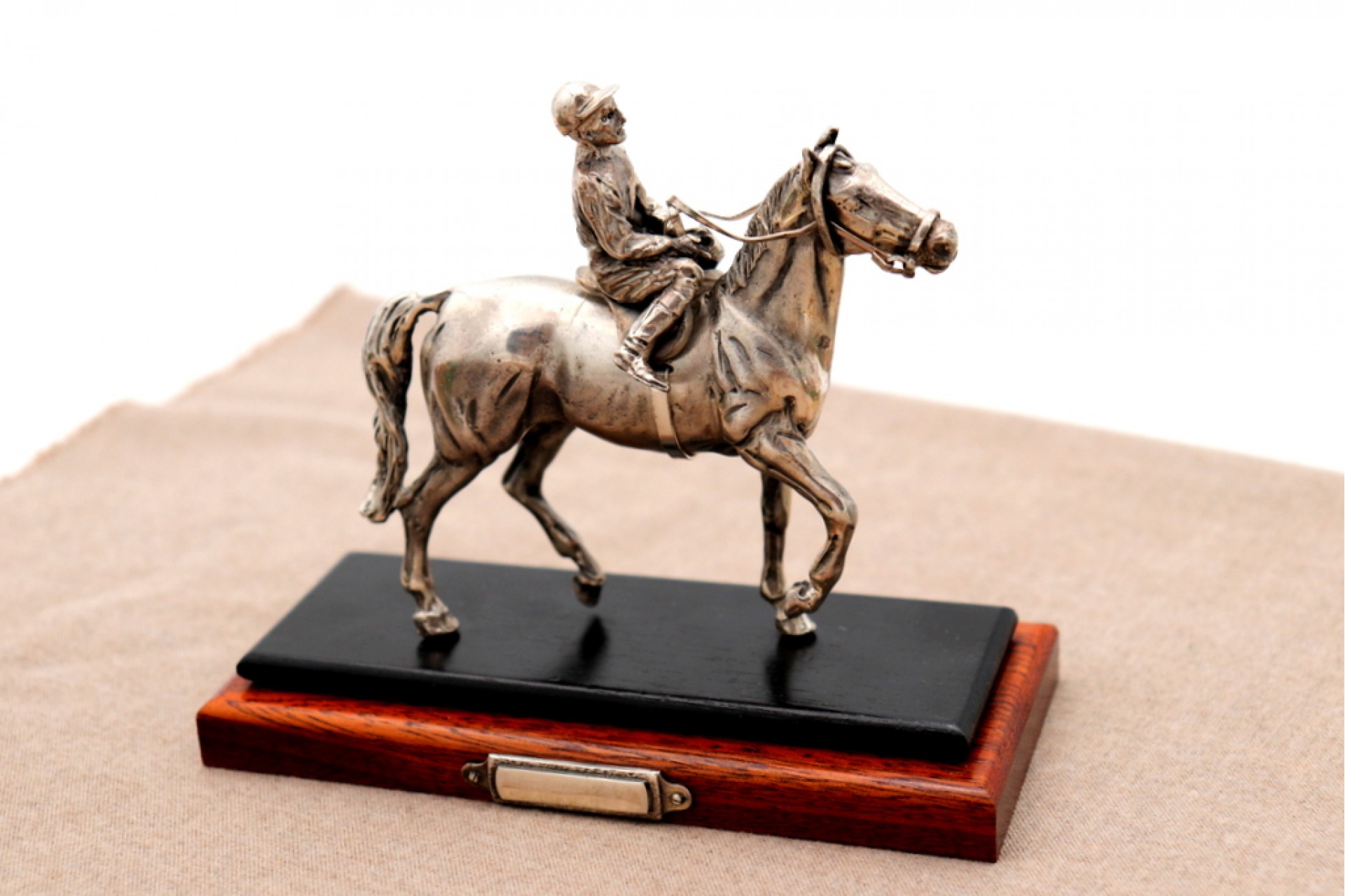 • Descrição: Miniatura de cavalo e jockey em prata de vulto perfeito com aplicações e relevos assente em base de madeira com placa de homenagem.