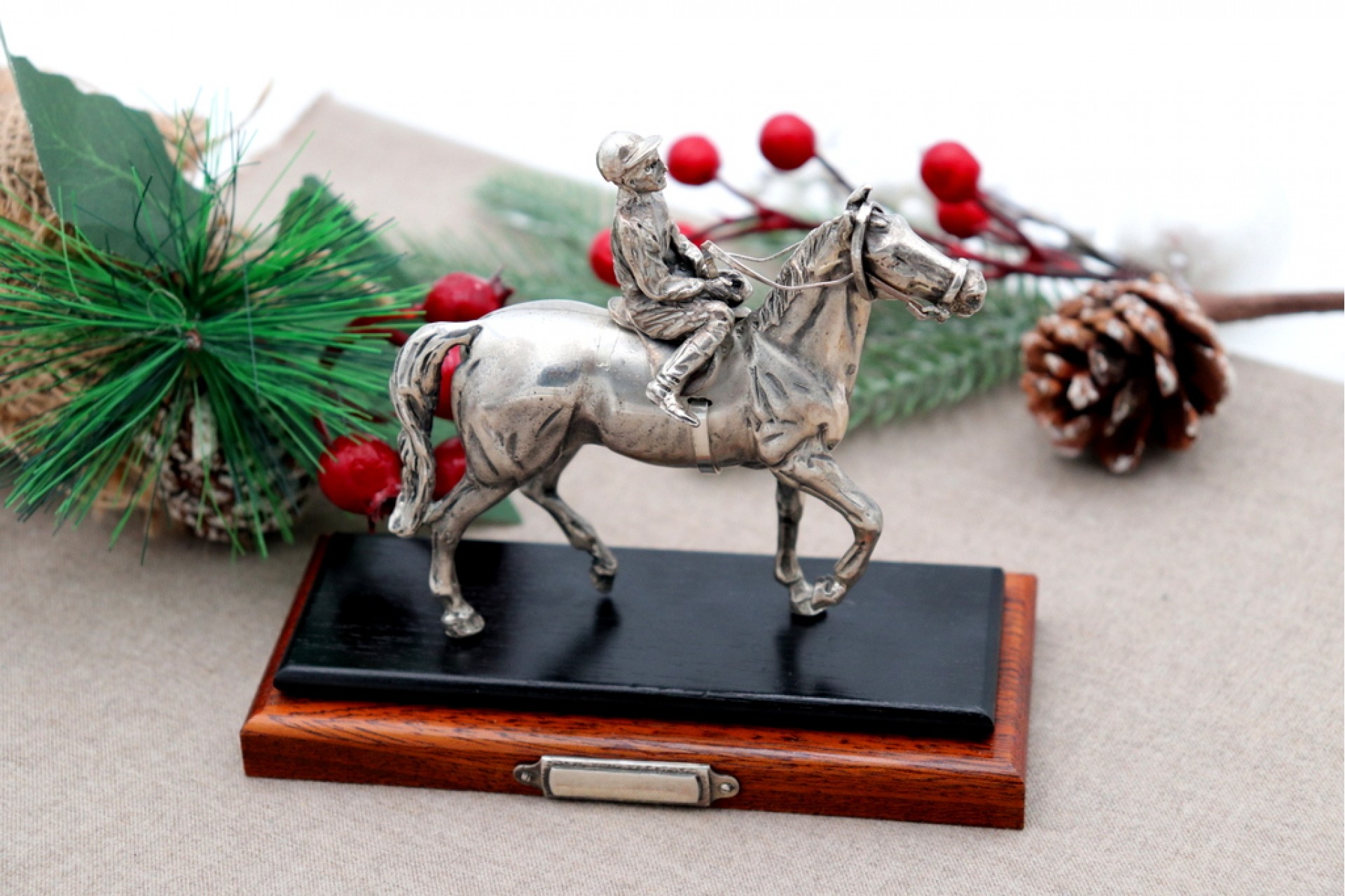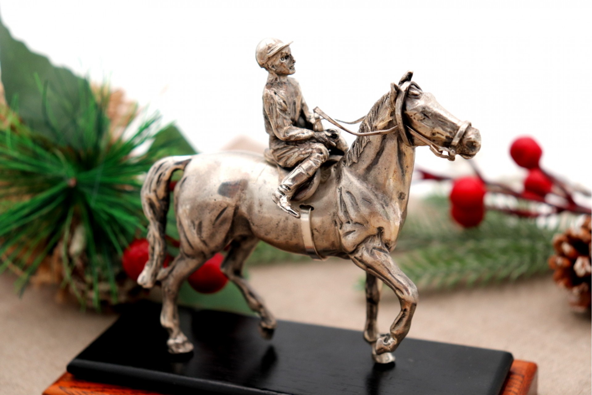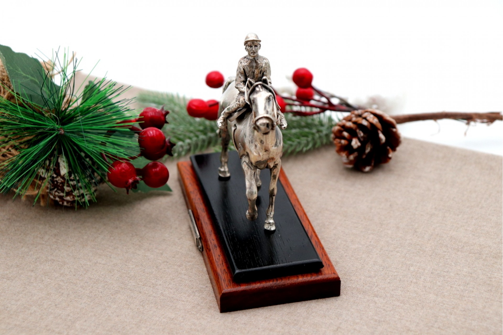 • Descrição: Miniatura de cavalo e jockey em prata de vulto perfeito com aplicações e relevos assente em base de madeira com placa de homenagem.